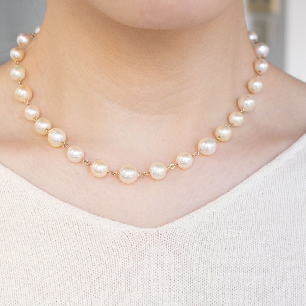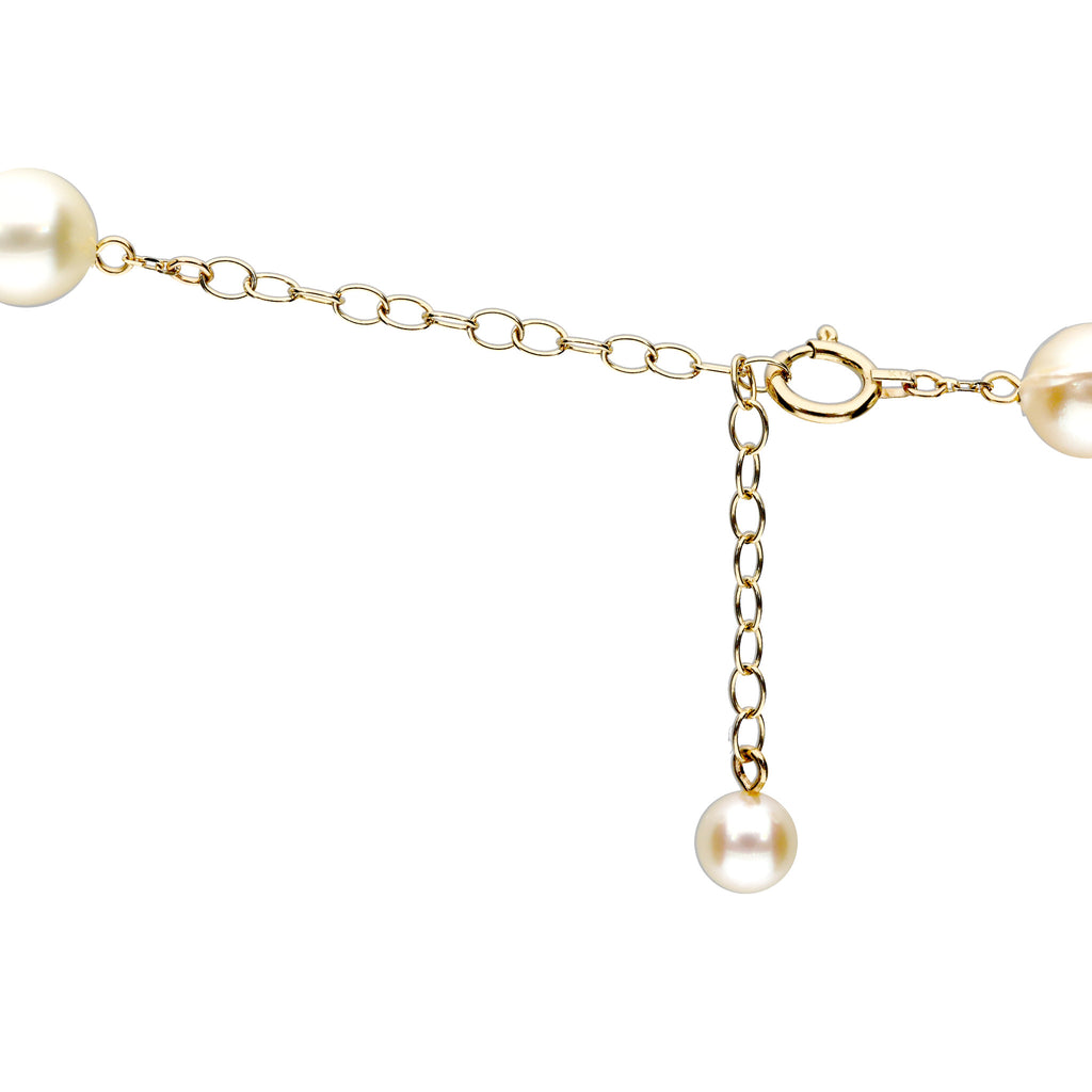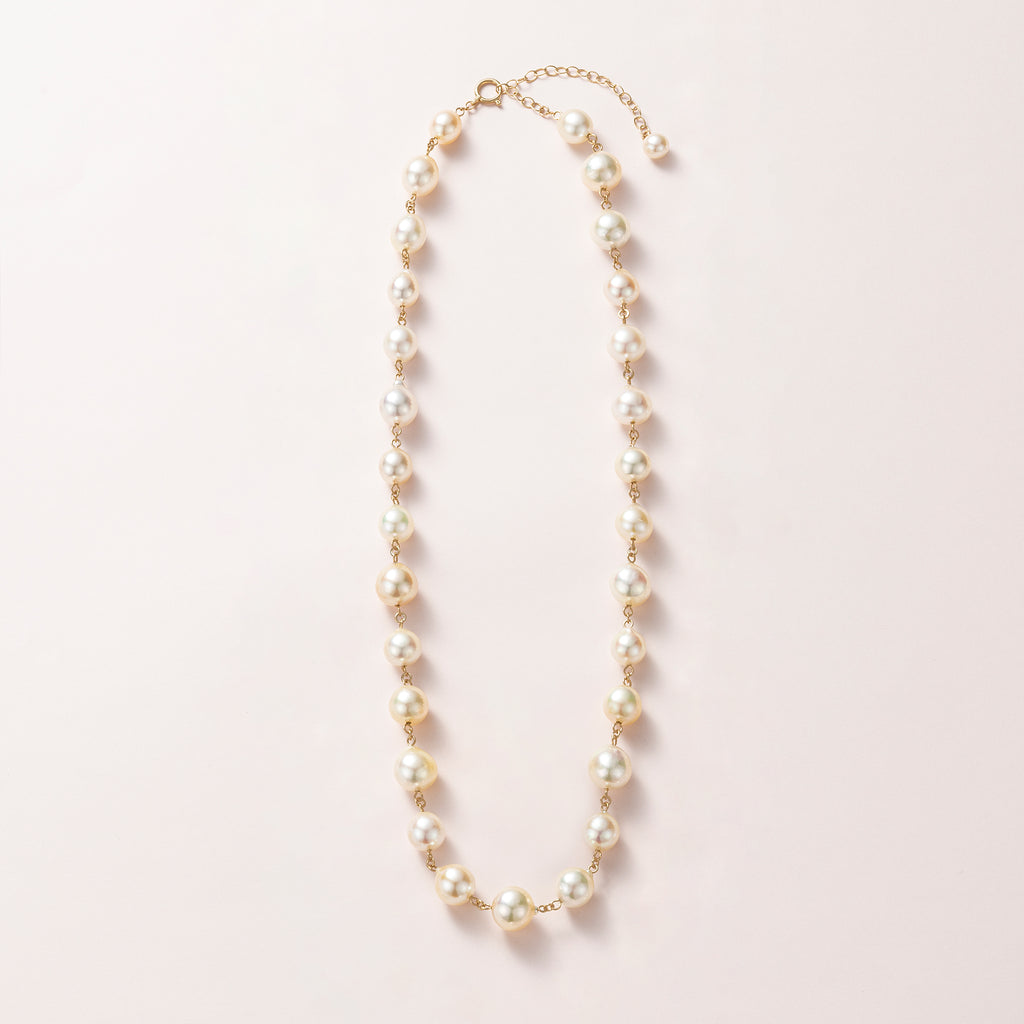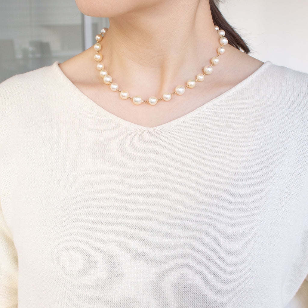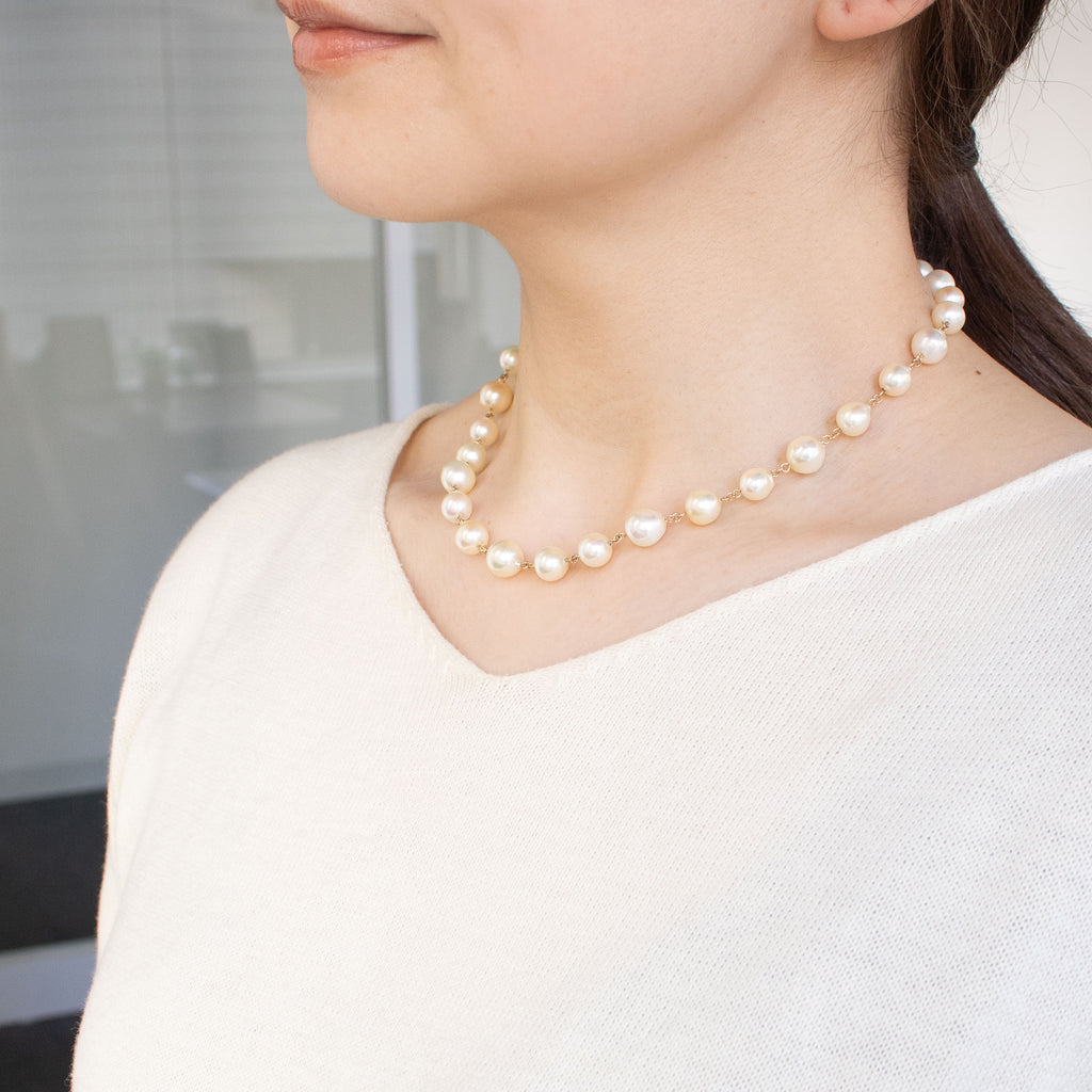 7~8.5mmのバロック珠は存在感抜群!アコヤパールのやや黄色がかった色が14金イエローゴールドに映えてとっても華やかです。