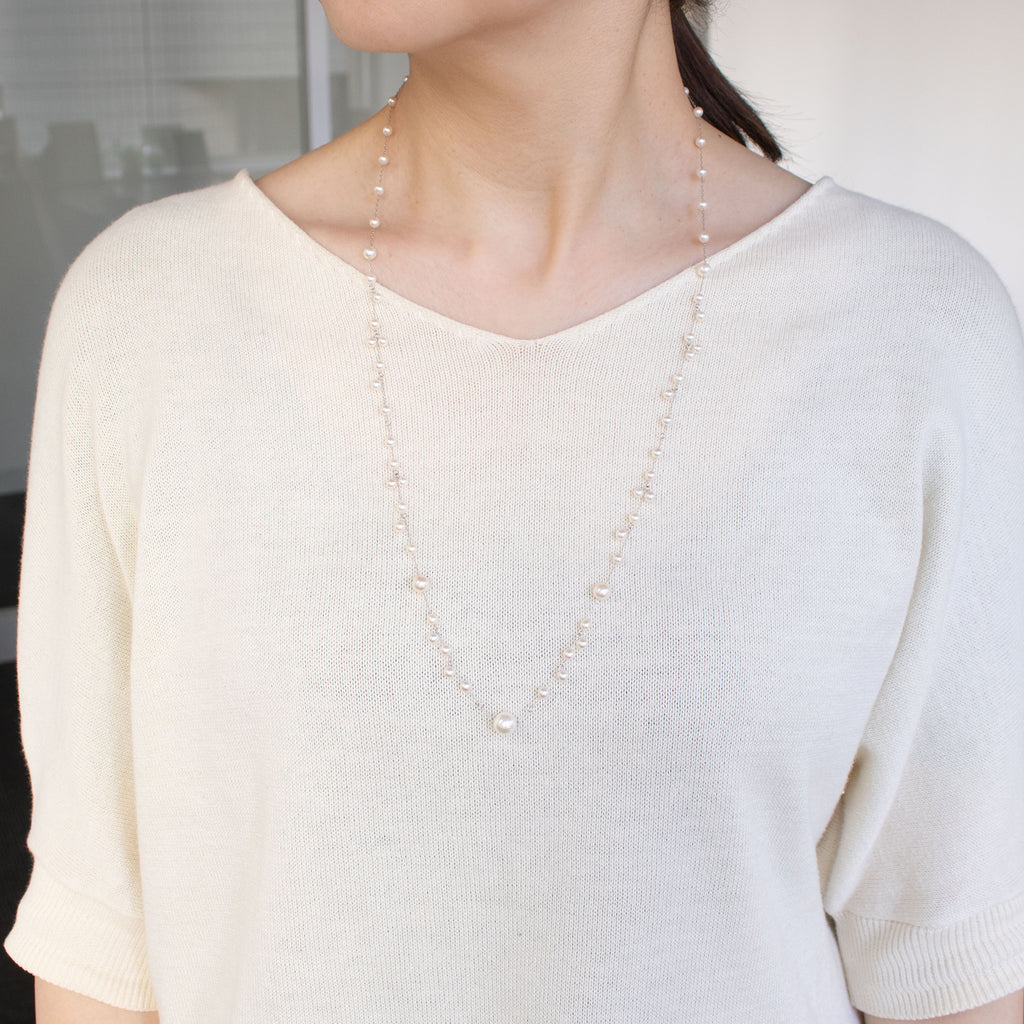 可愛らしい小さいサイズのアコヤパールを散りばめたロングネックレスです。