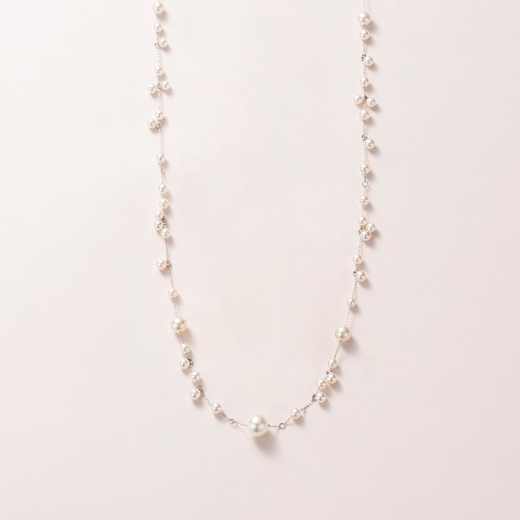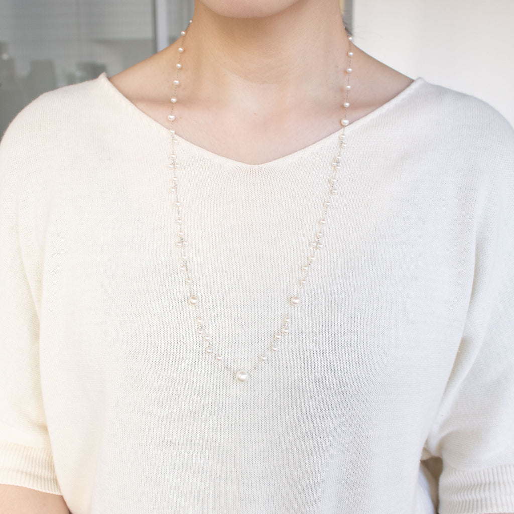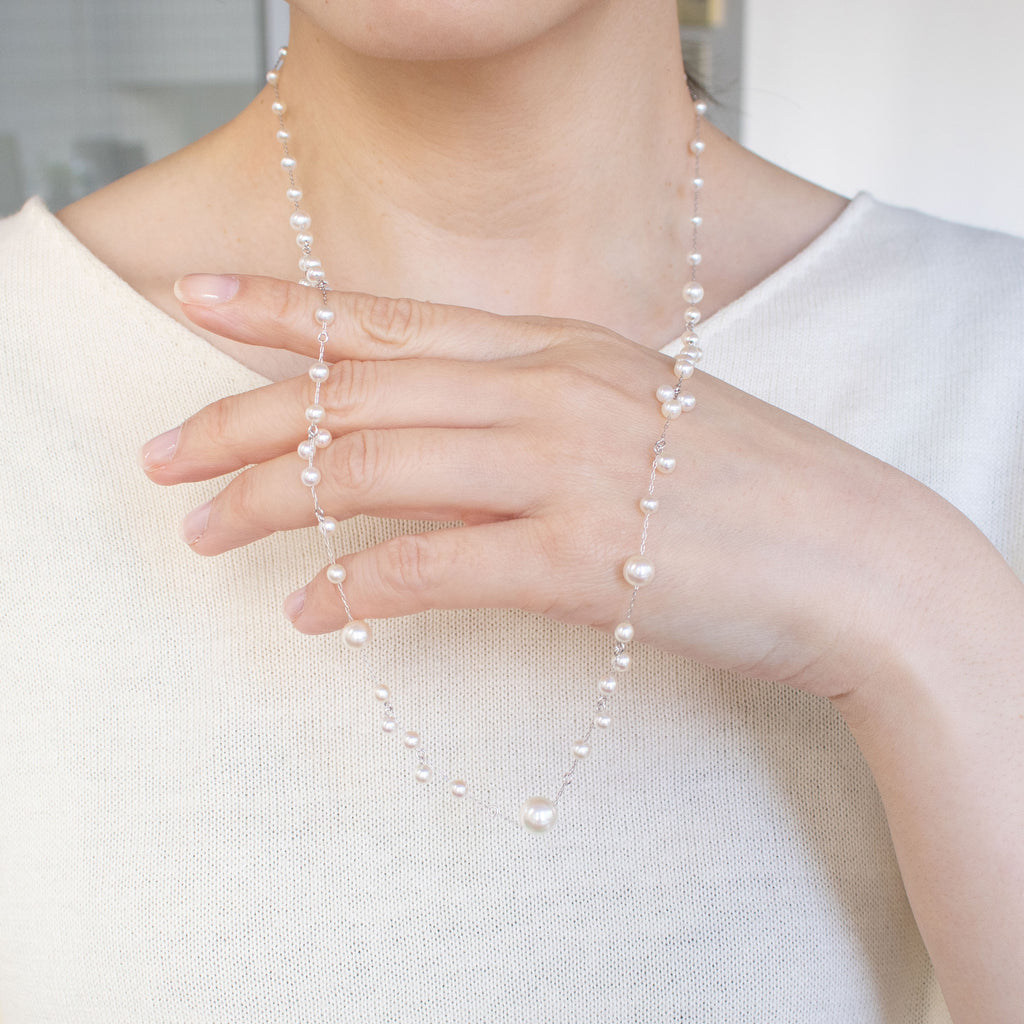 全長約68cmの14金ホワイトゴールド製のチェーンに、サイズの異なるアコヤパールをバランスよく配置しました。