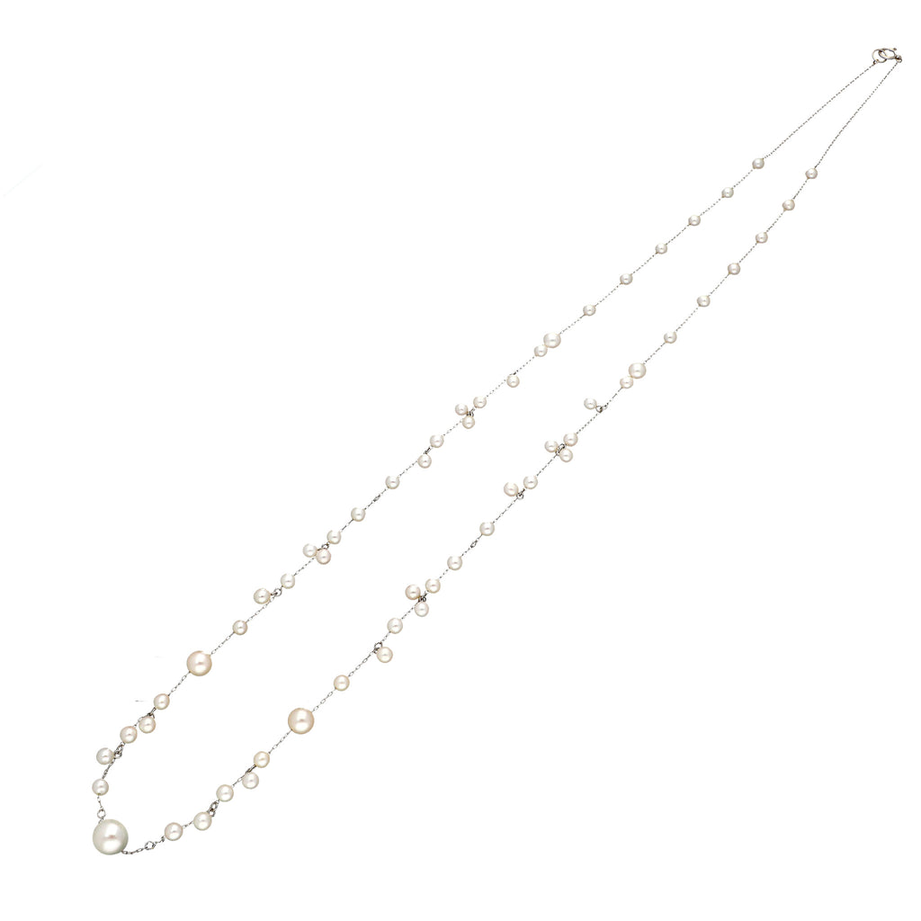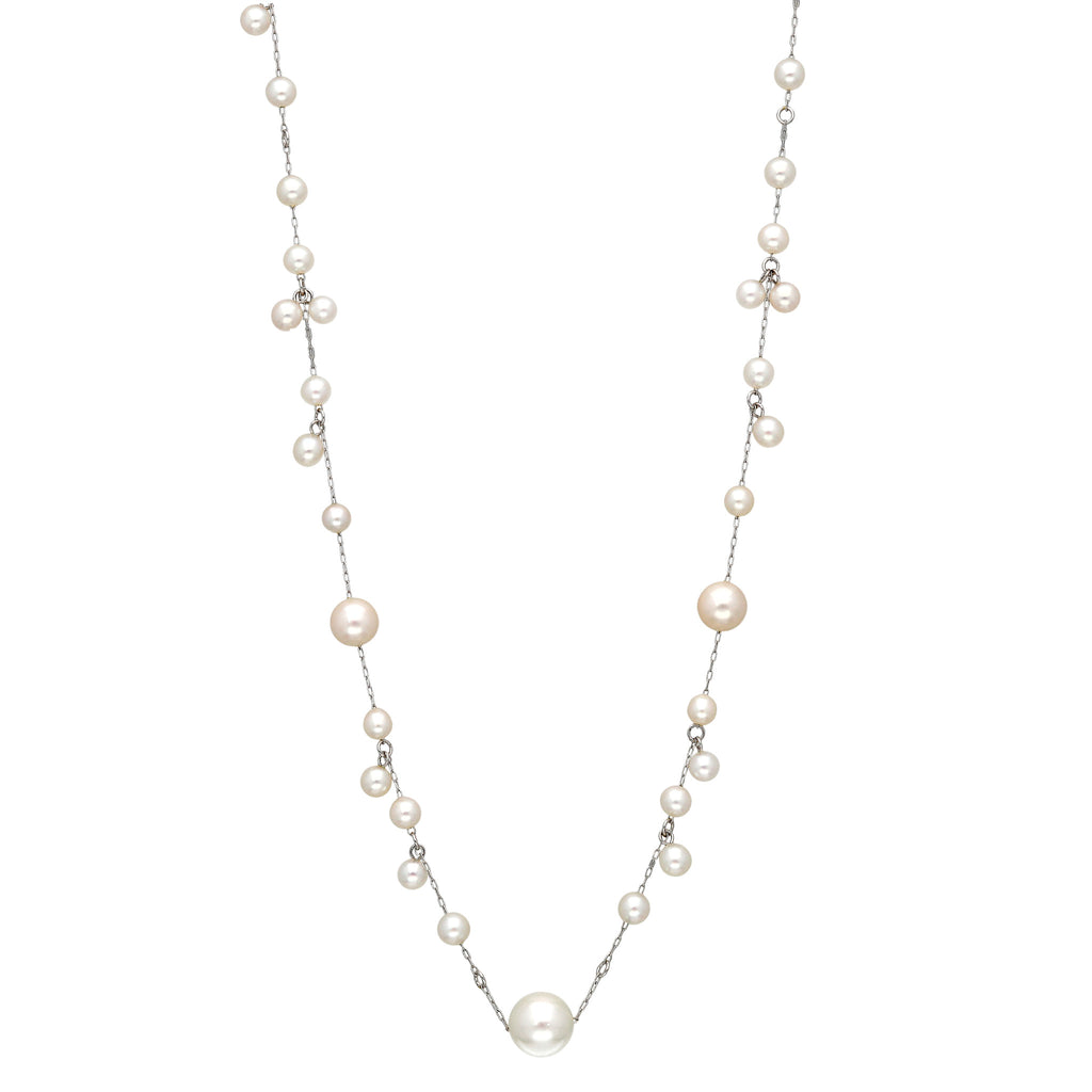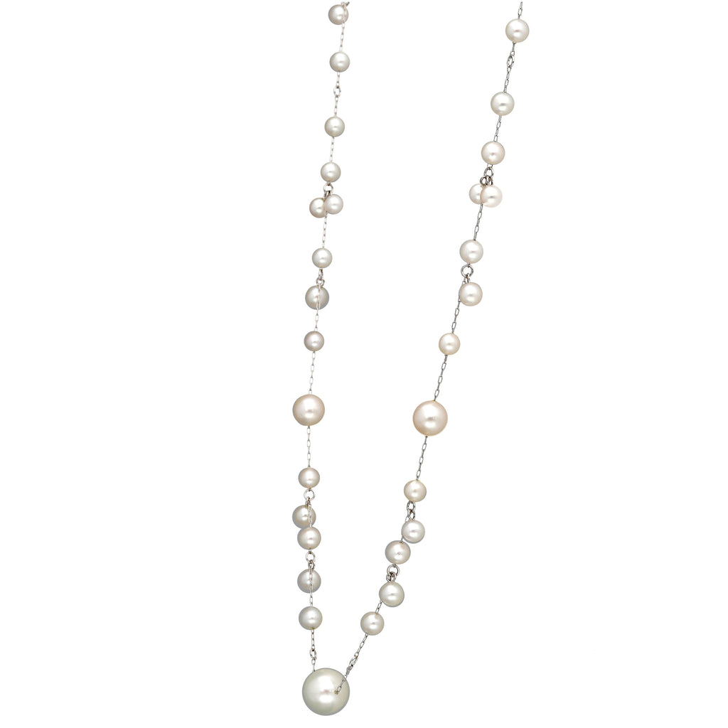 全長約68cmの14金ホワイトゴールド製のチェーンに、サイズの異なるアコヤパールをバランスよく配置しました。