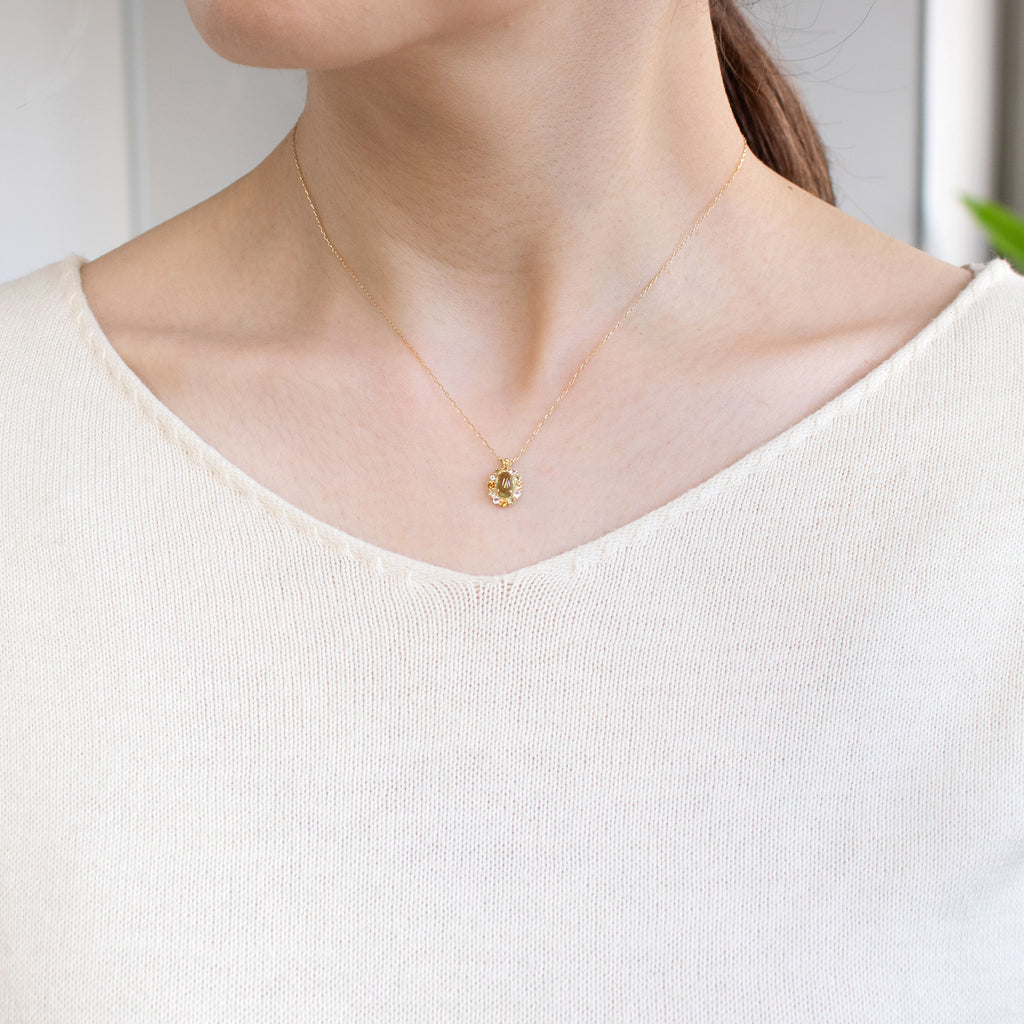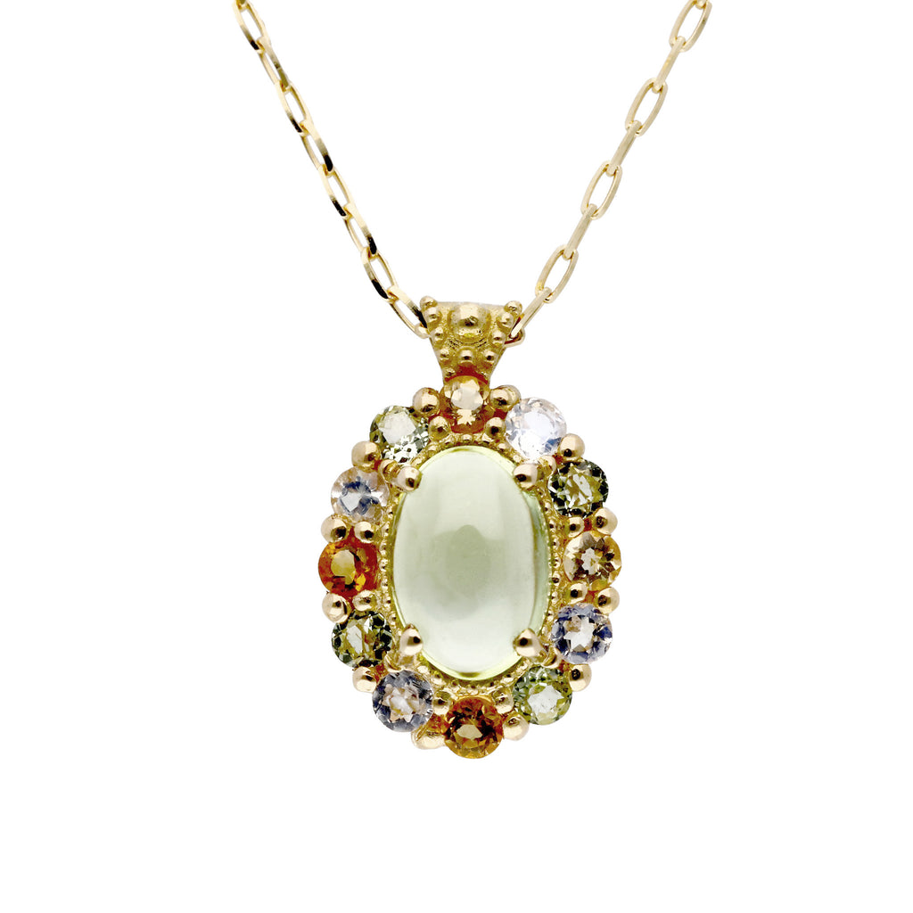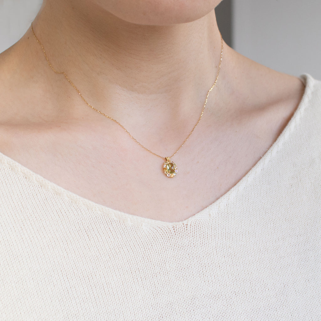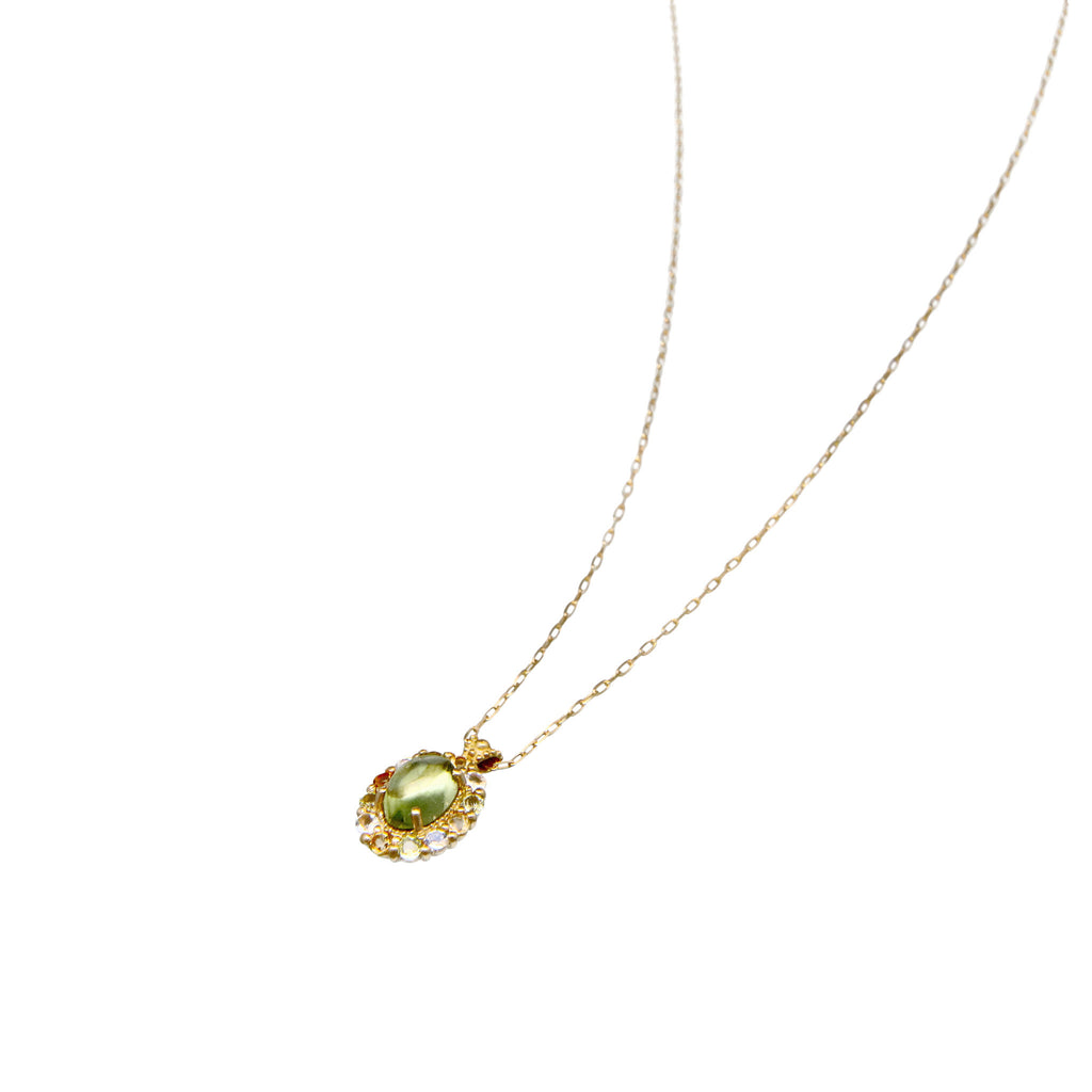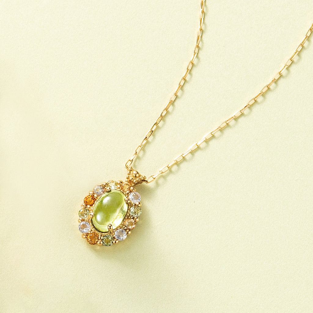 爽やかなオリーブグリーンが魅力的なペリドットをセンターに、その周りをカラーストーンで取り巻いた、カラーストーン好き必見のネックレスです。