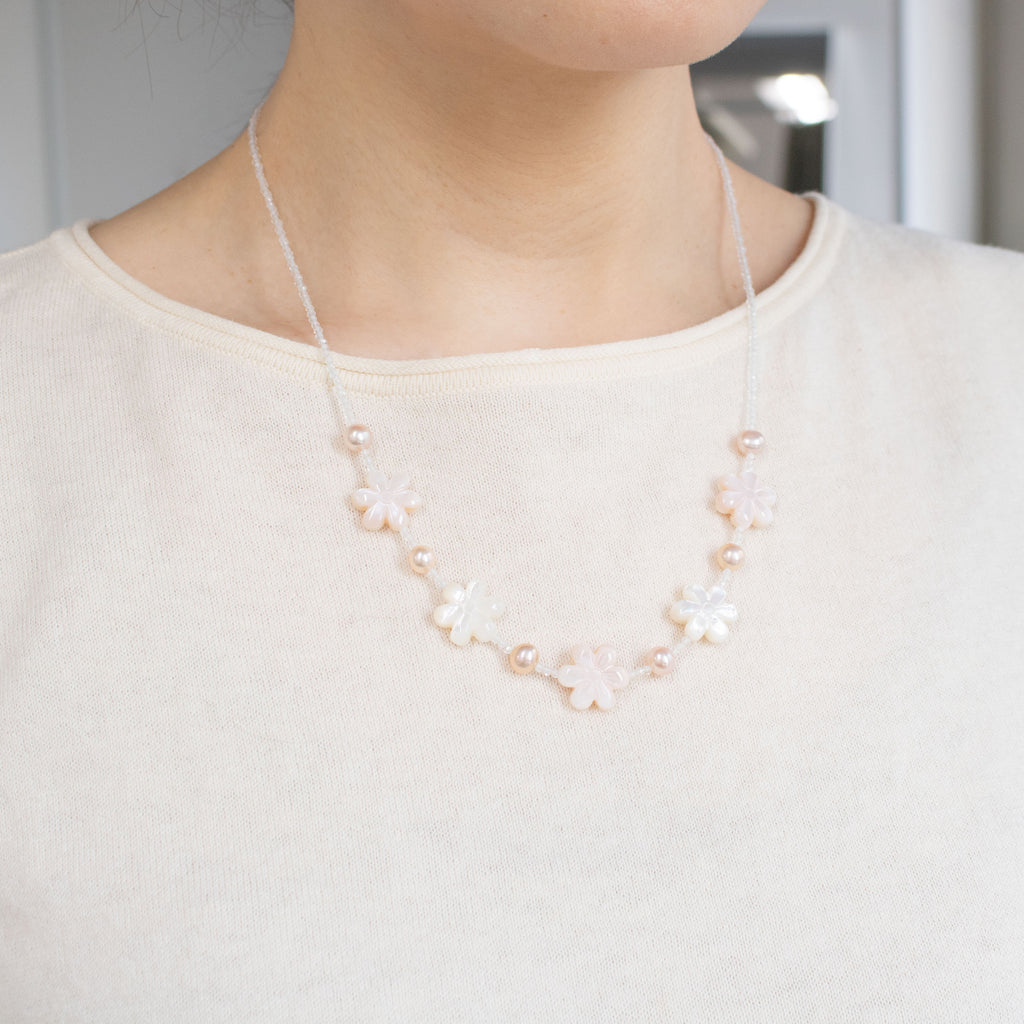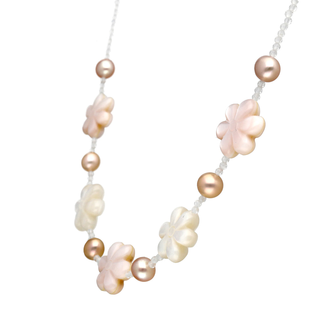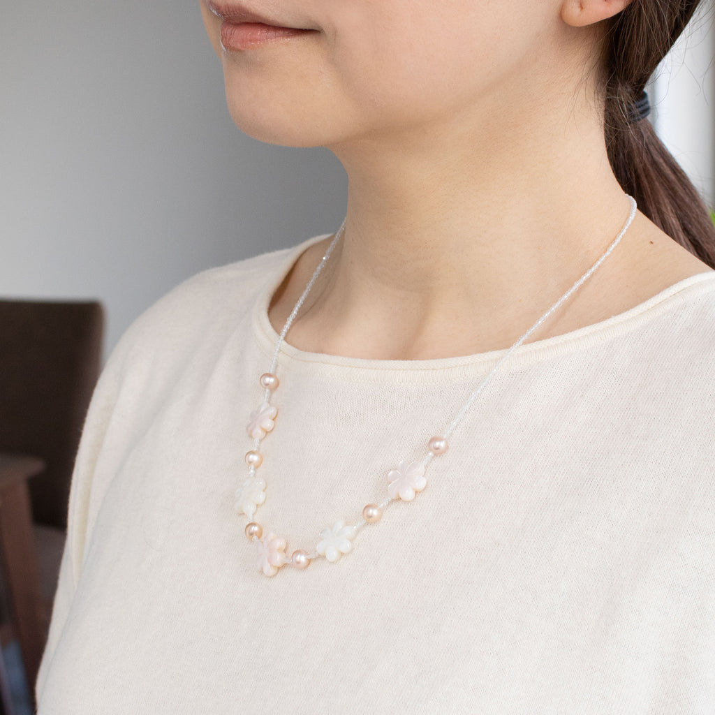 キラキラと輝く無色透明のホワイトトパーズのビーズを連ねたネックレスに、ピンクと白のシェルでできたフラワーモチーフと、ピンク系カラーの淡水パールを等間隔にセットしました。
