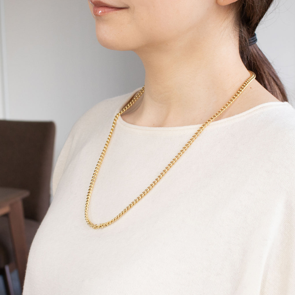軽くひねりを加えたベーシックな喜平デザインのネックレス。幅約4.3mmの太さと、約14.6gの重量は存在感抜群です。