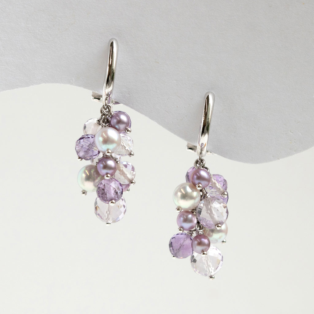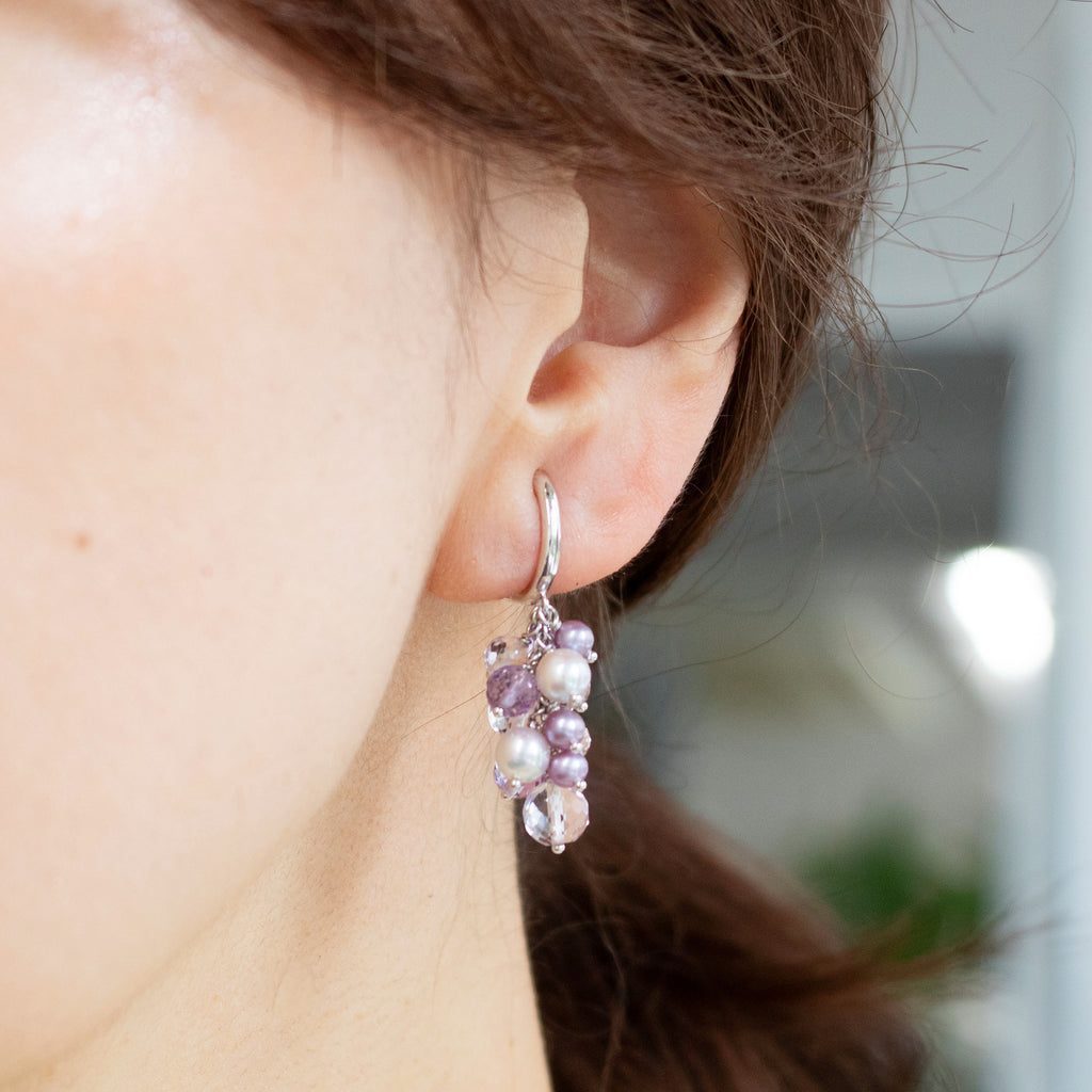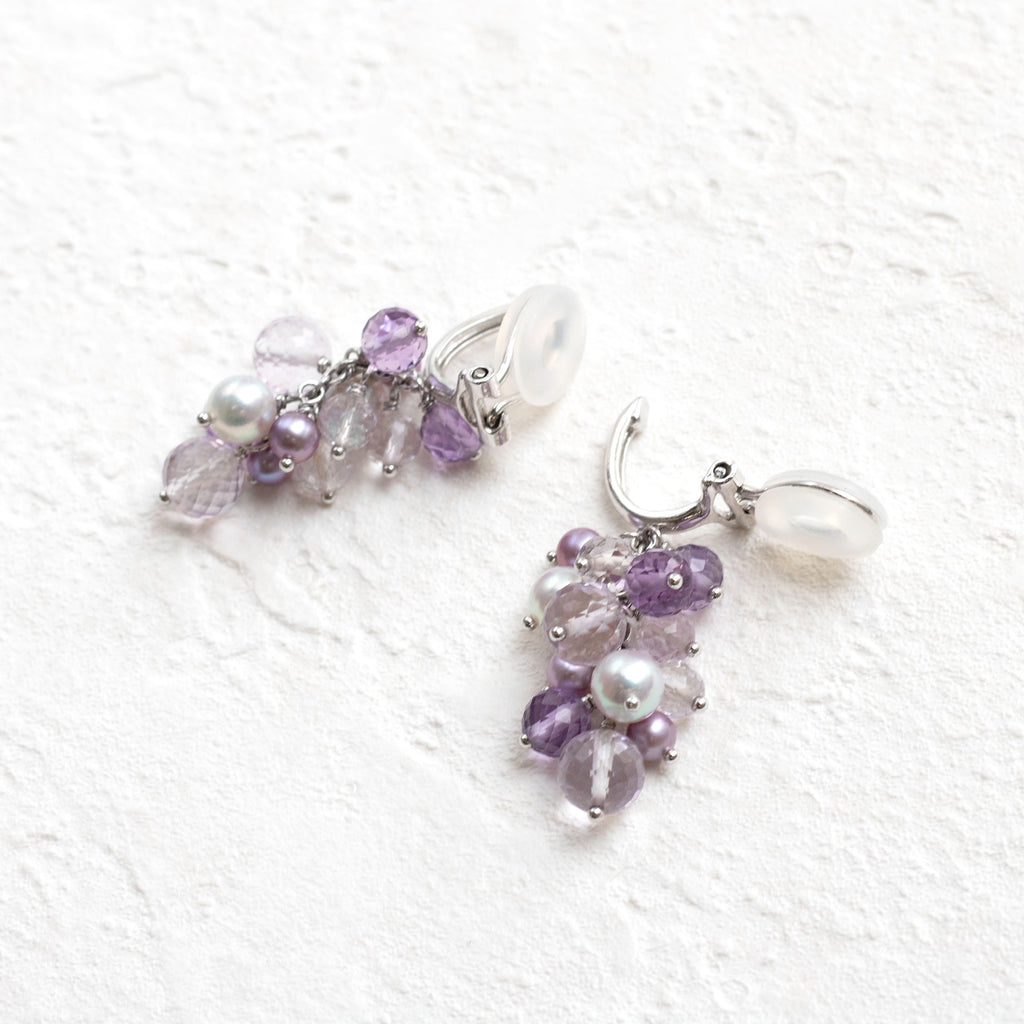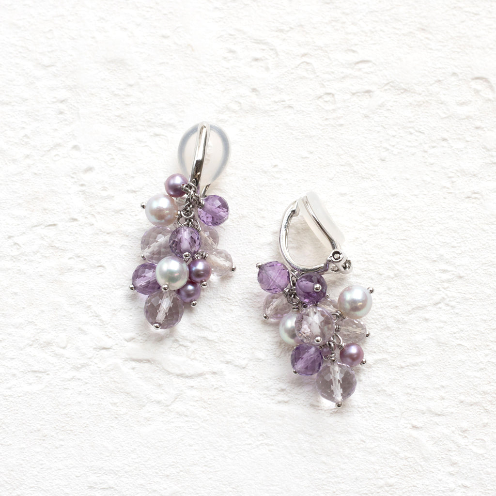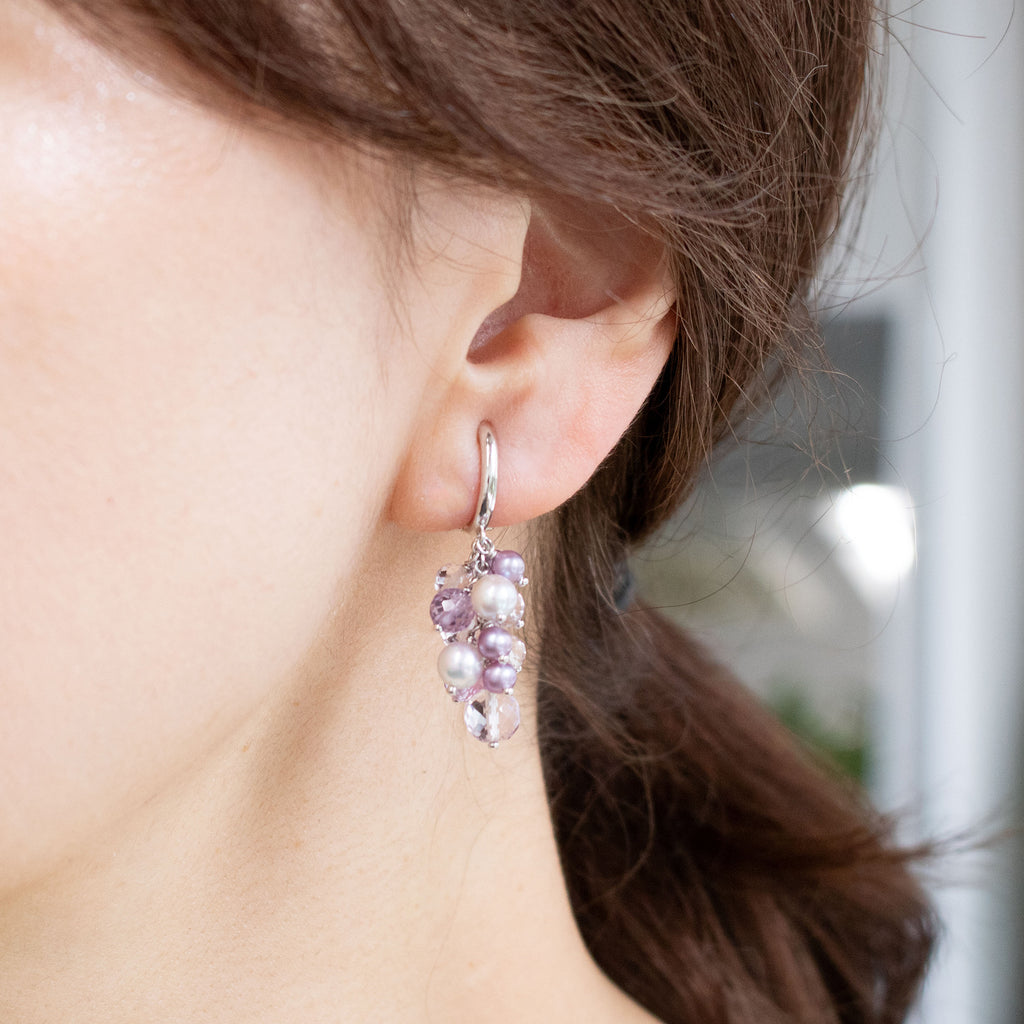 濃淡のアメシスト、ナチュラルカラーのアコヤパール、パープルカラーの淡水パールを沢山ぶら下げた、ユニークなデザインのイヤリングです。