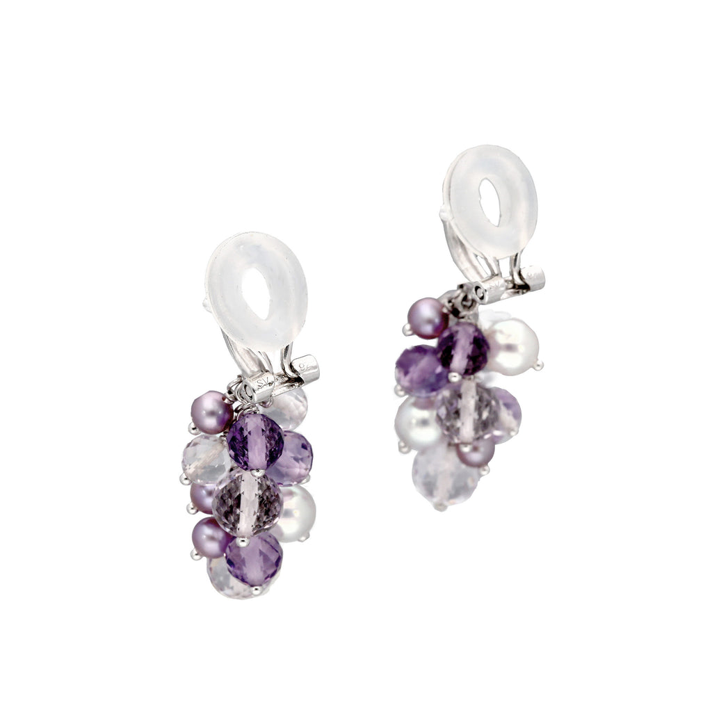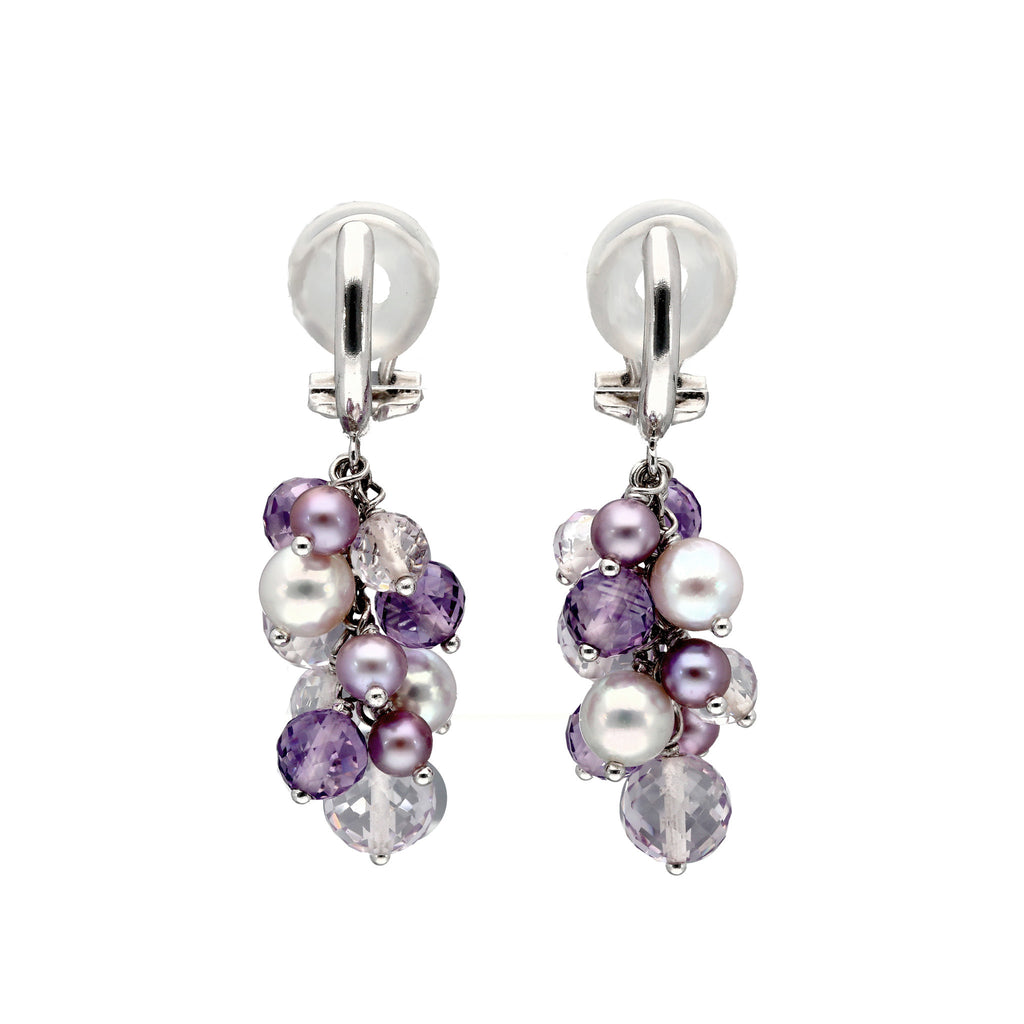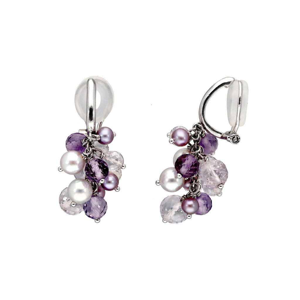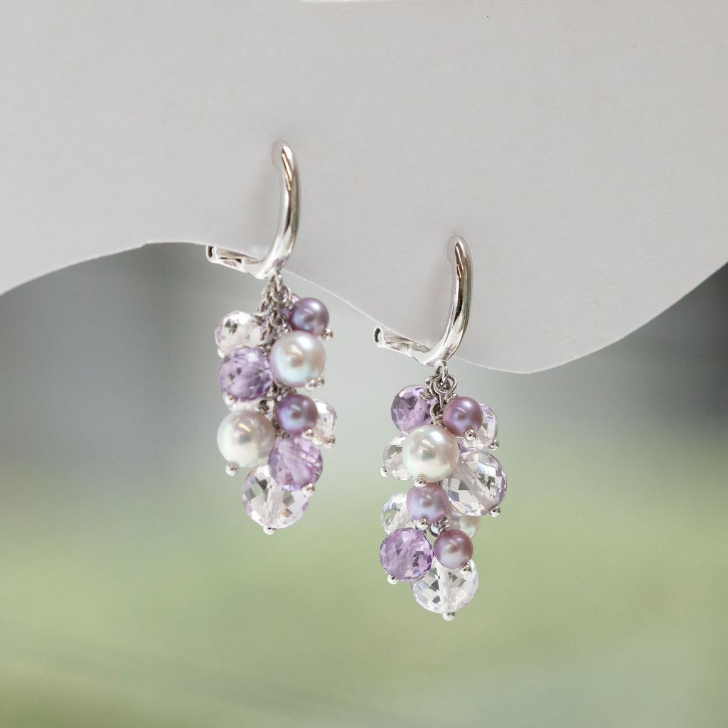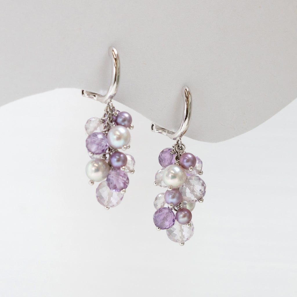 濃淡のアメシスト、ナチュラルカラーのアコヤパール、パープルカラーの淡水パールを沢山ぶら下げた、ユニークなデザインのイヤリングです。