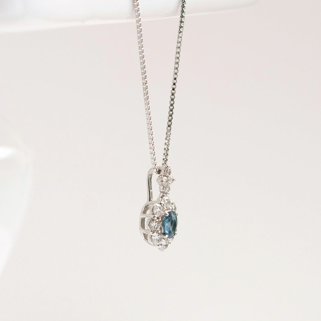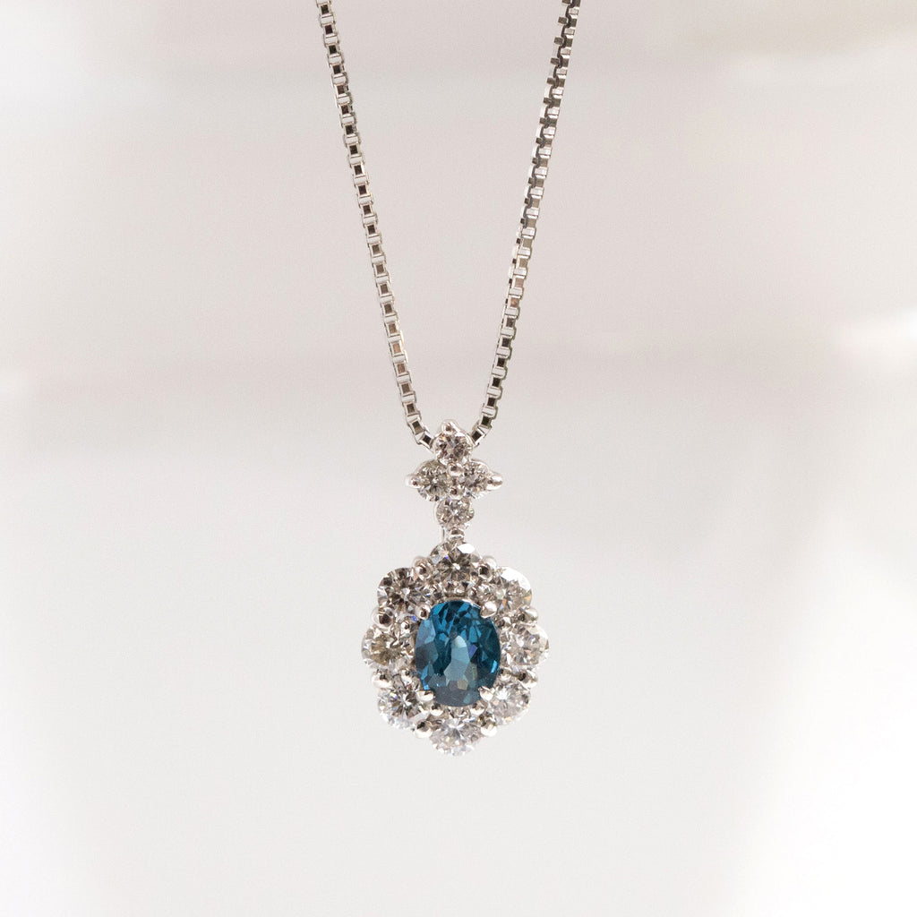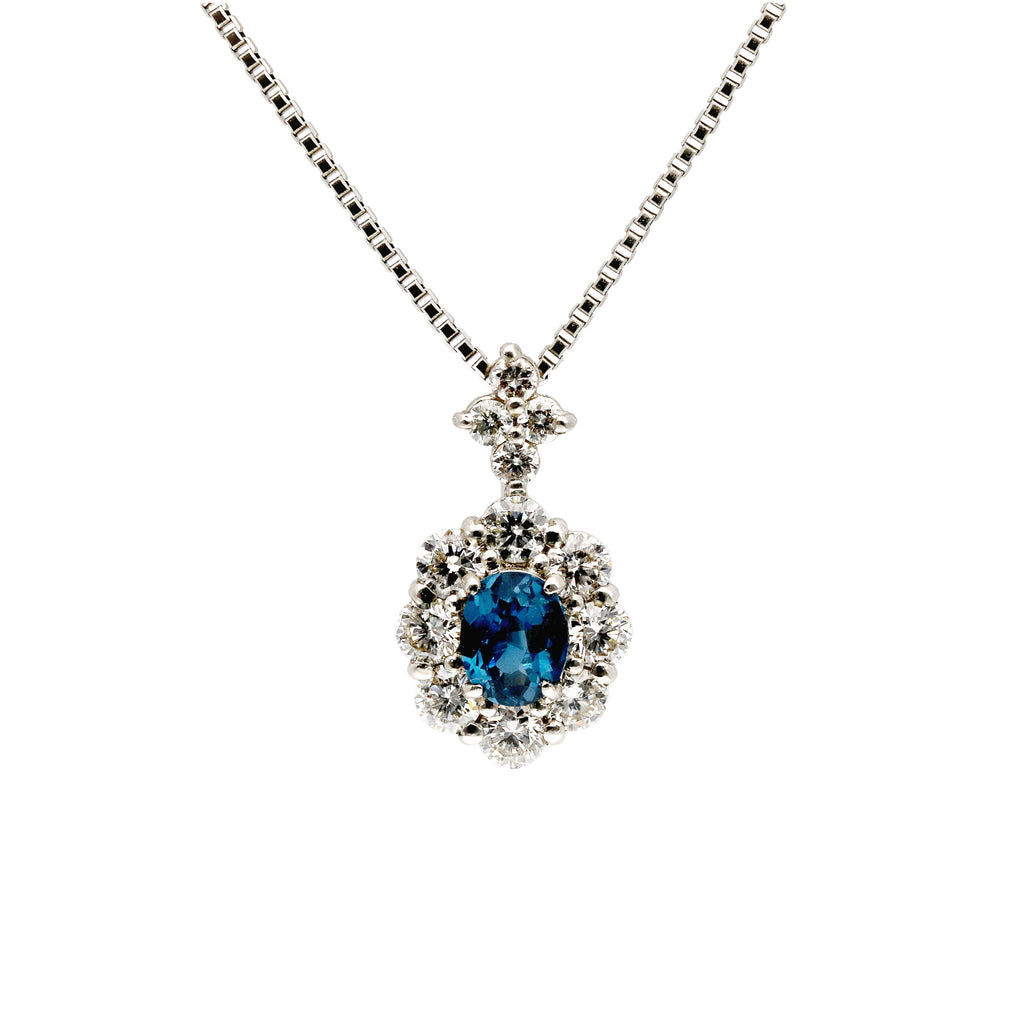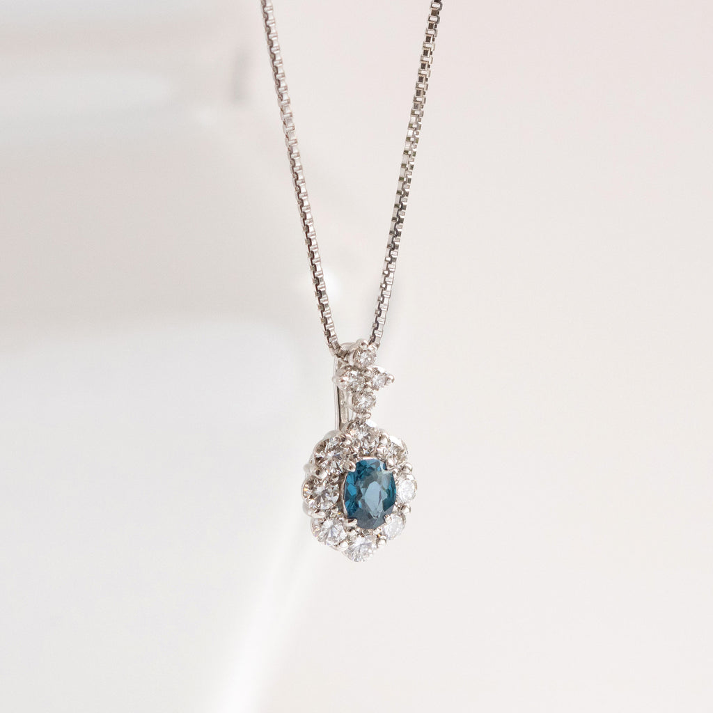 キラキラとよく輝く落ち着いたブルーが印象的なブルースピネルをメレダイヤで取り巻いた、高級感のあるデザインのネックレスです。