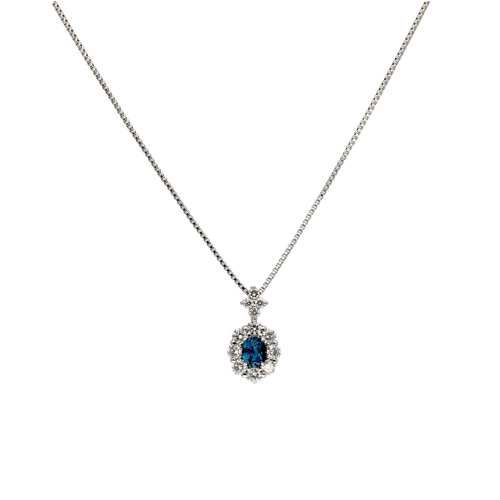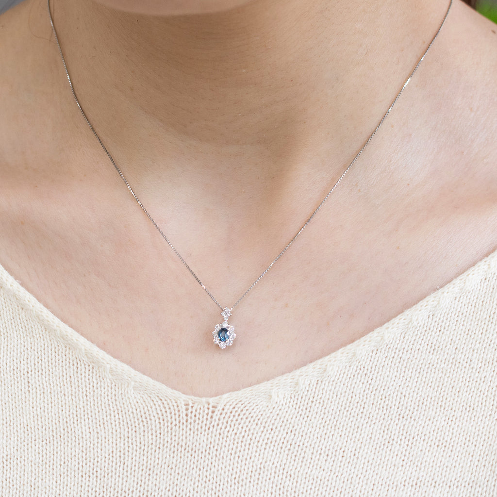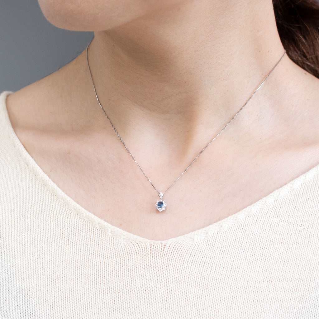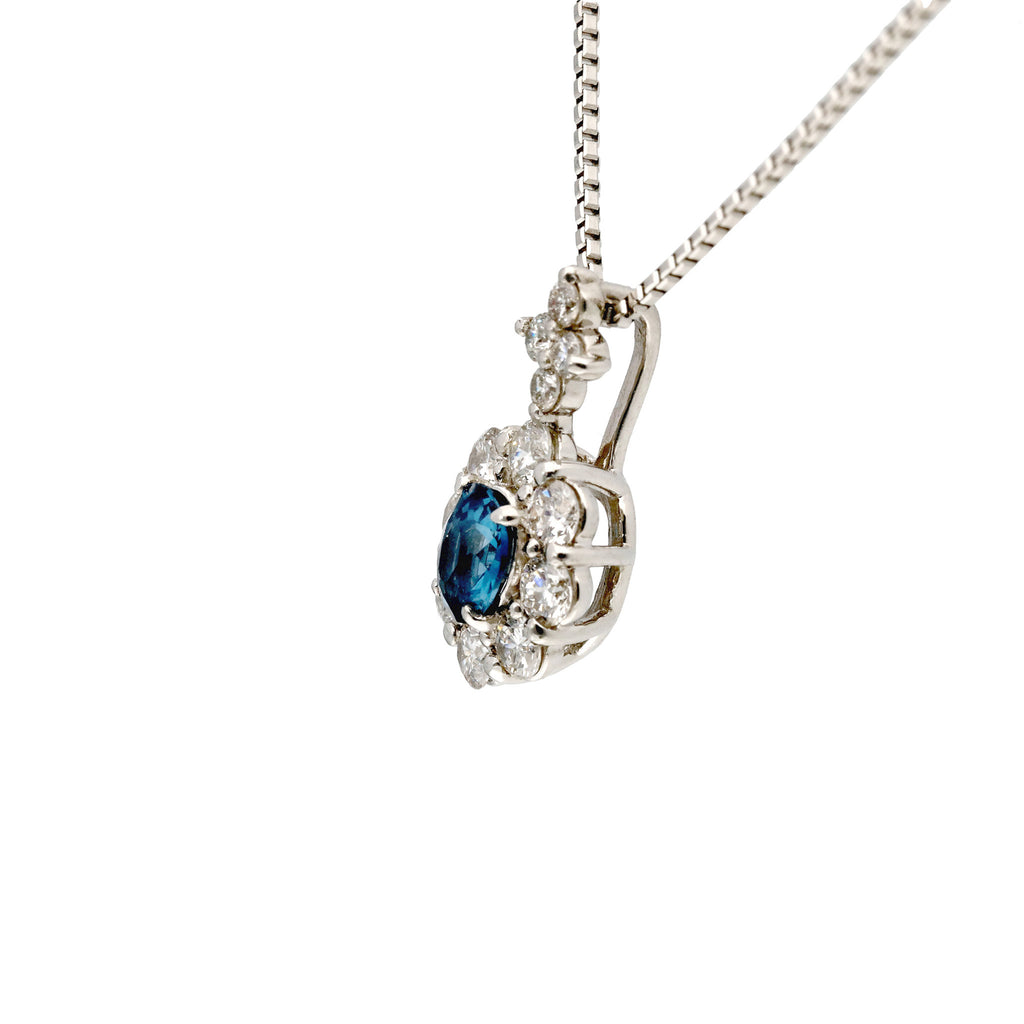 キラキラとよく輝く落ち着いたブルーが印象的なブルースピネルをメレダイヤで取り巻いた、高級感のあるデザインのネックレスです。