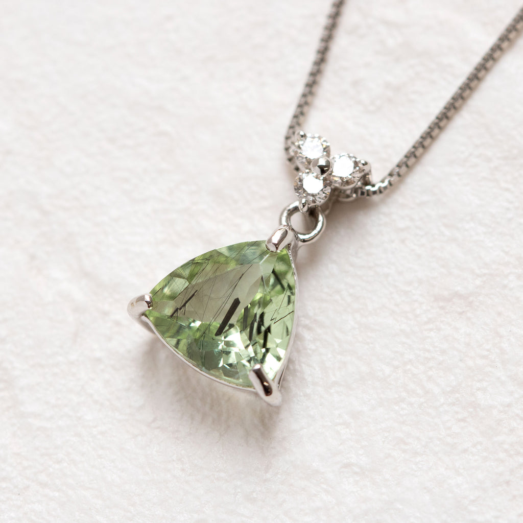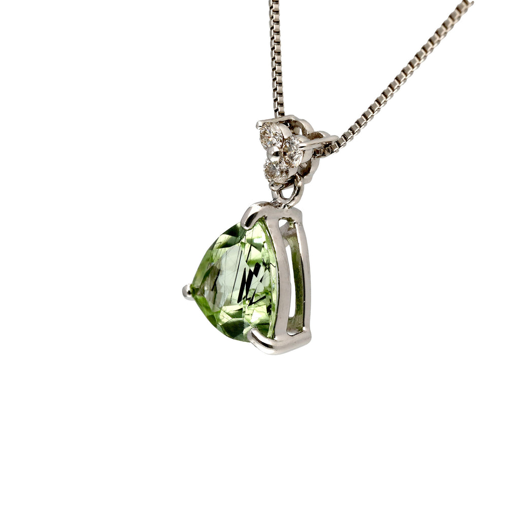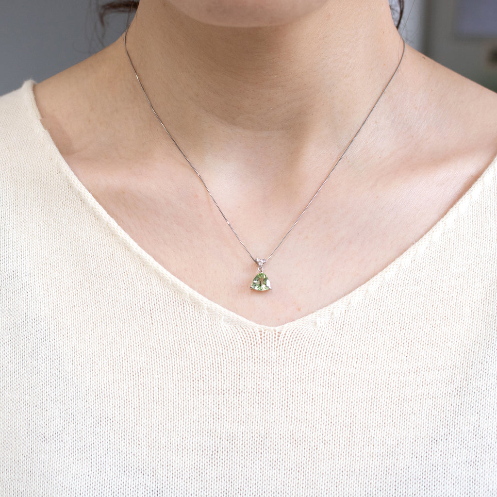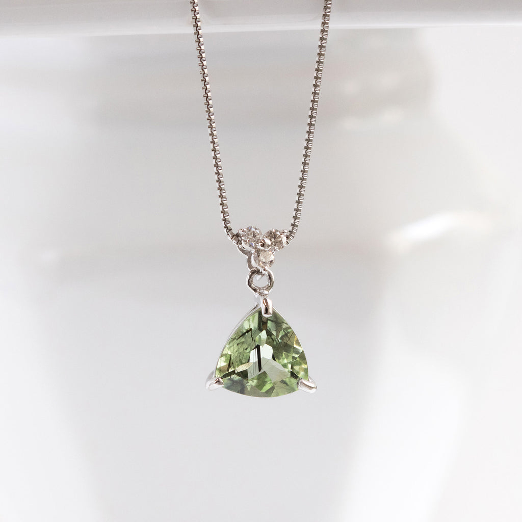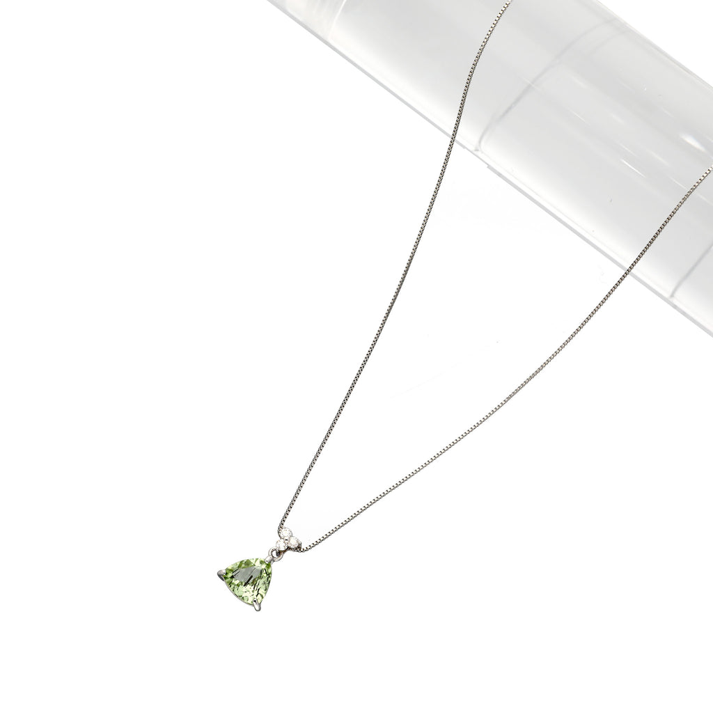 個性的なトリリアントカットのルードヴィッヒアイト・イン・ペリドットをプラチナ製の枠にセット。チェーンを通すバチカン部分にメレダイヤを3石留めたデザインです。