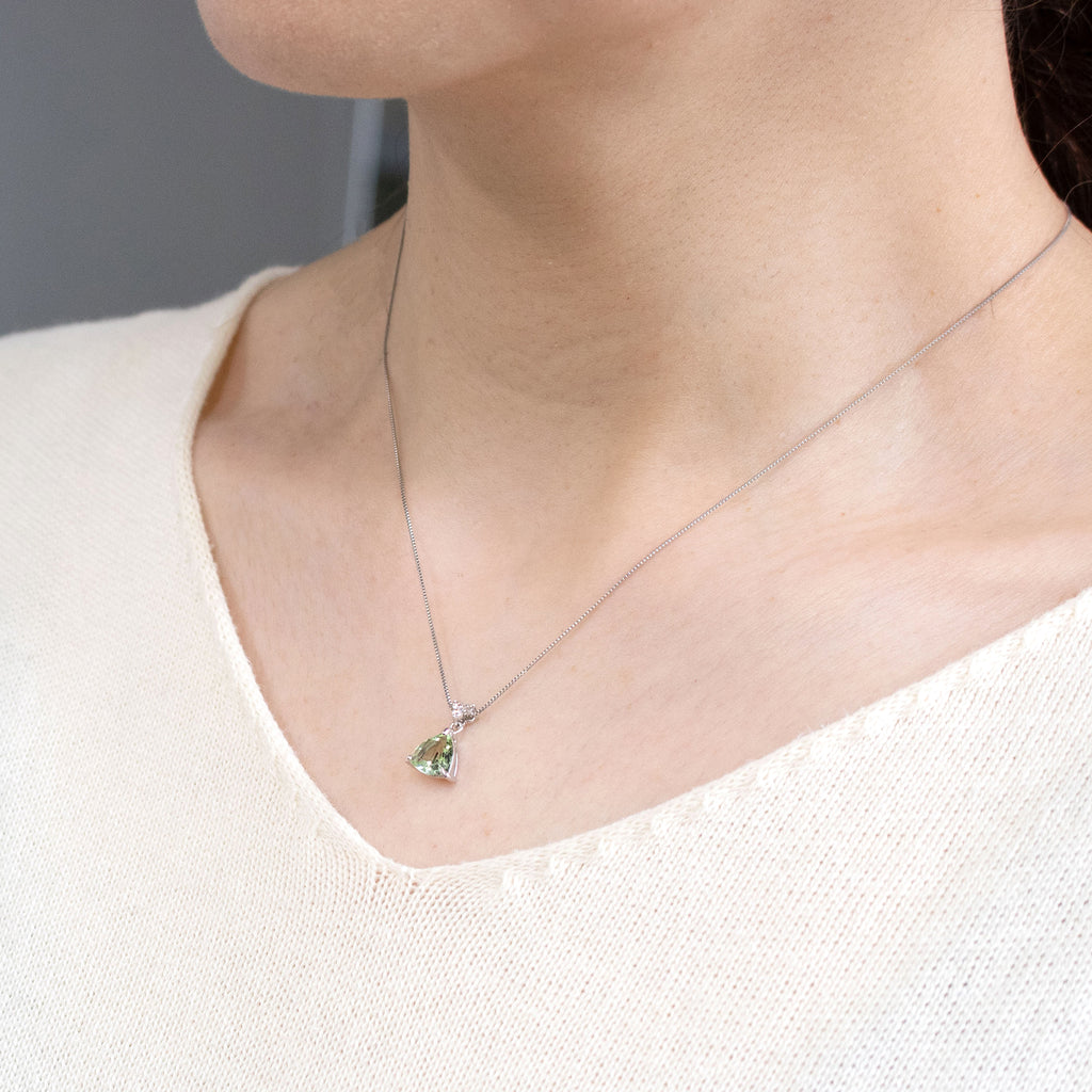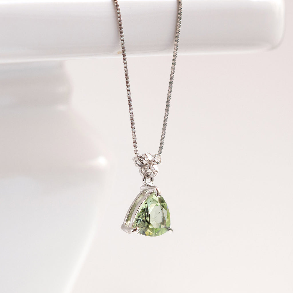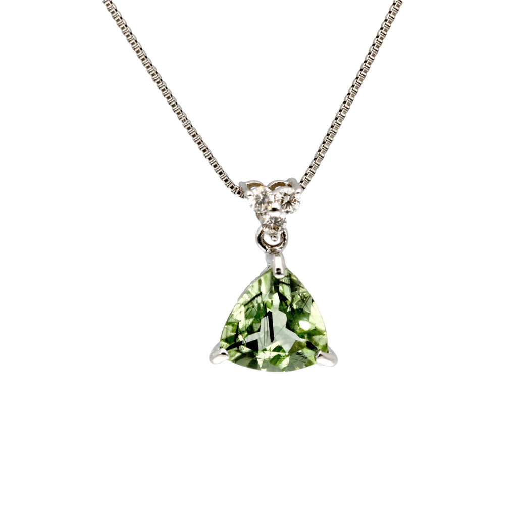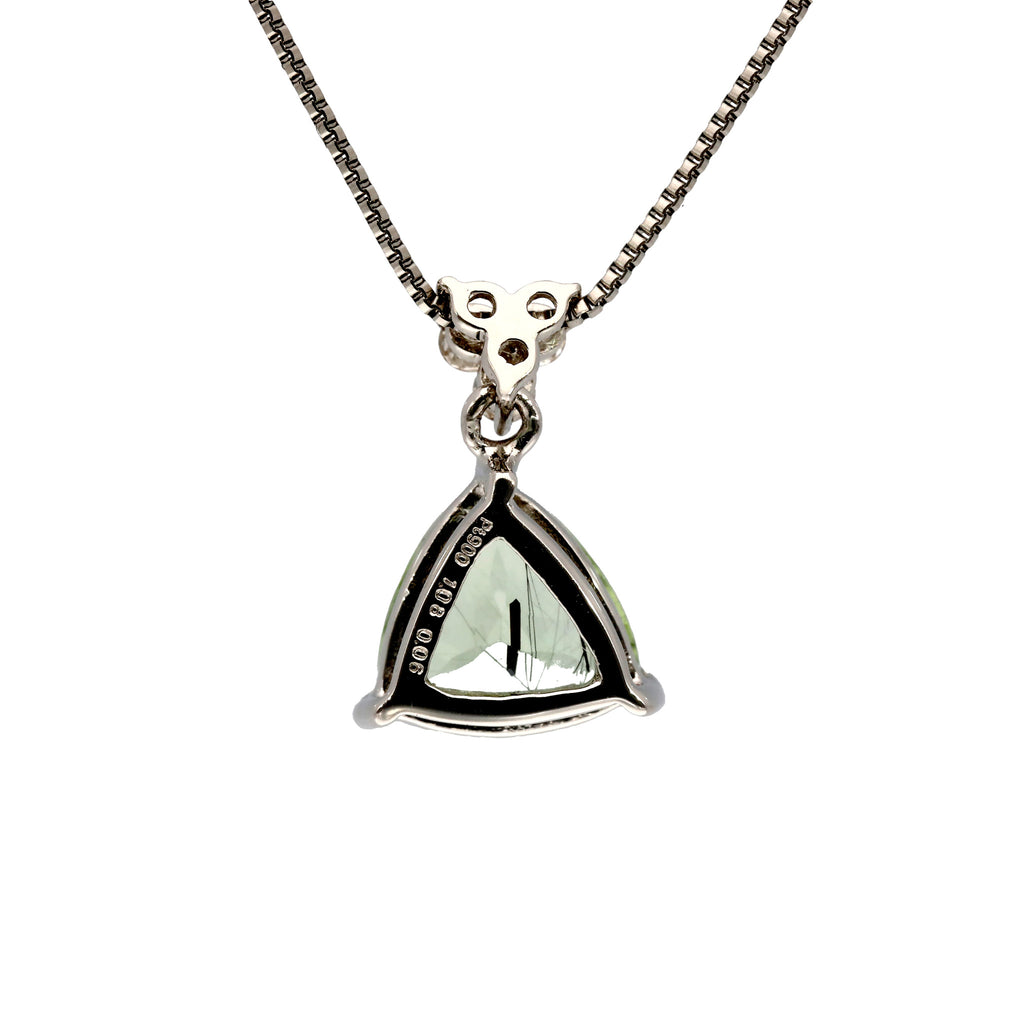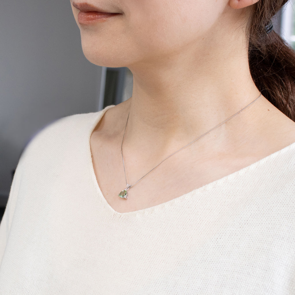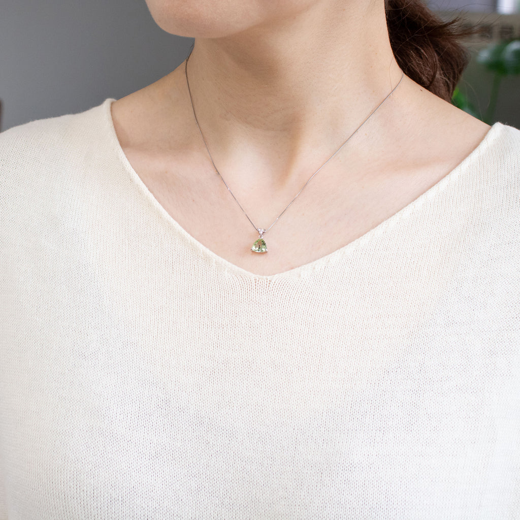 個性的なトリリアントカットのルードヴィッヒアイト・イン・ペリドットをプラチナ製の枠にセット。チェーンを通すバチカン部分にメレダイヤを3石留めたデザインです。