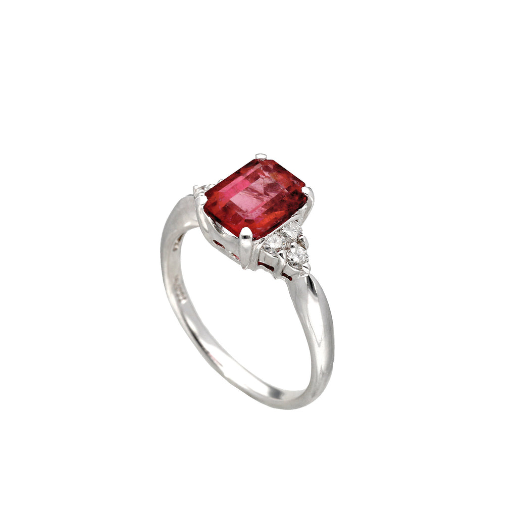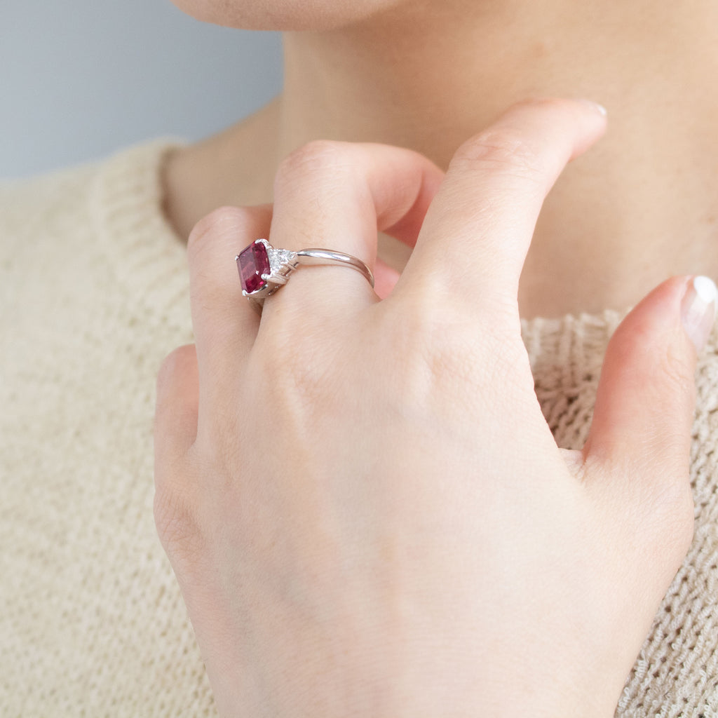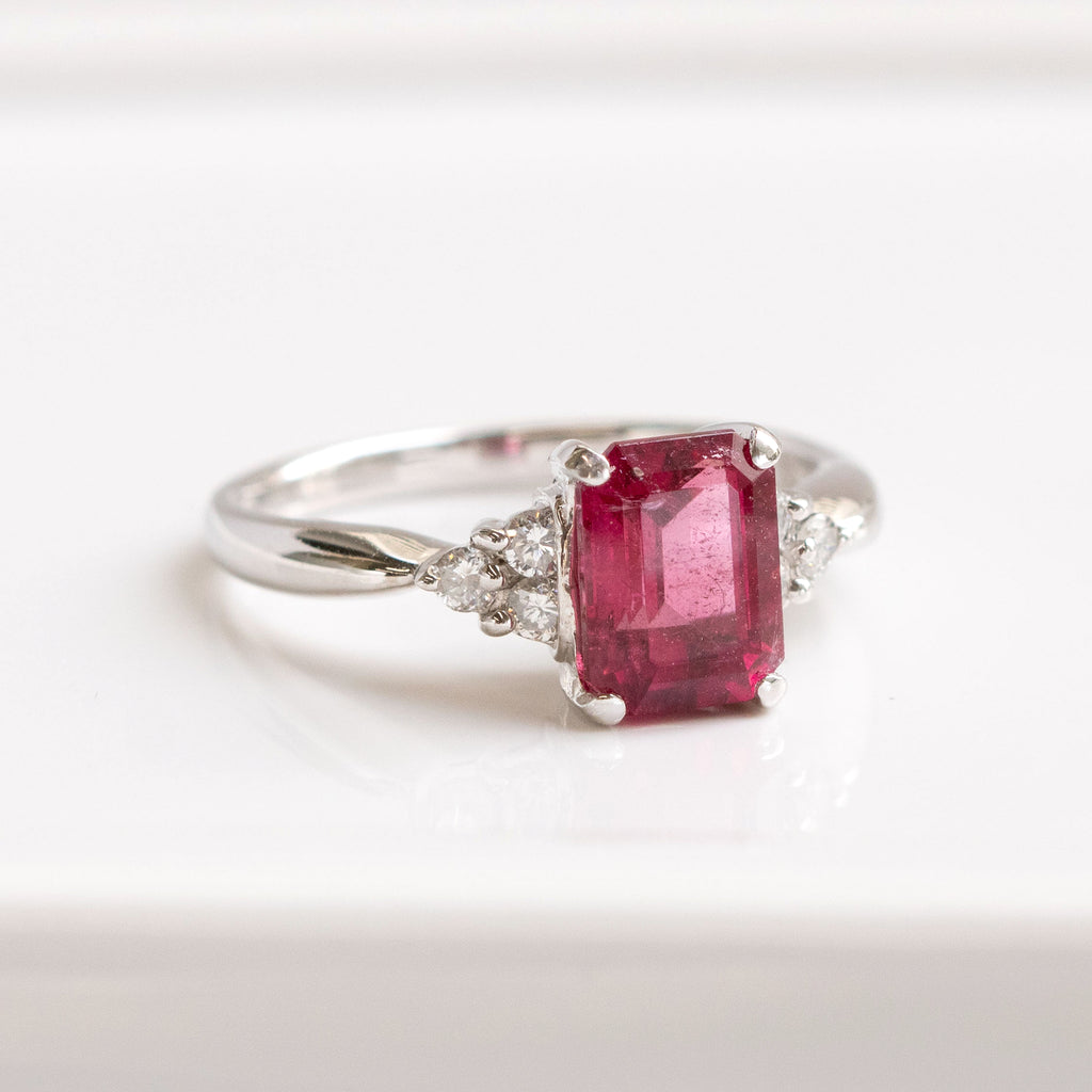 しっかりとした存在感のある大粒1.79ctのルベライトをエレガントな雰囲気のエメラルドカットにして、シンプルなデザインのリングに仕立てました。