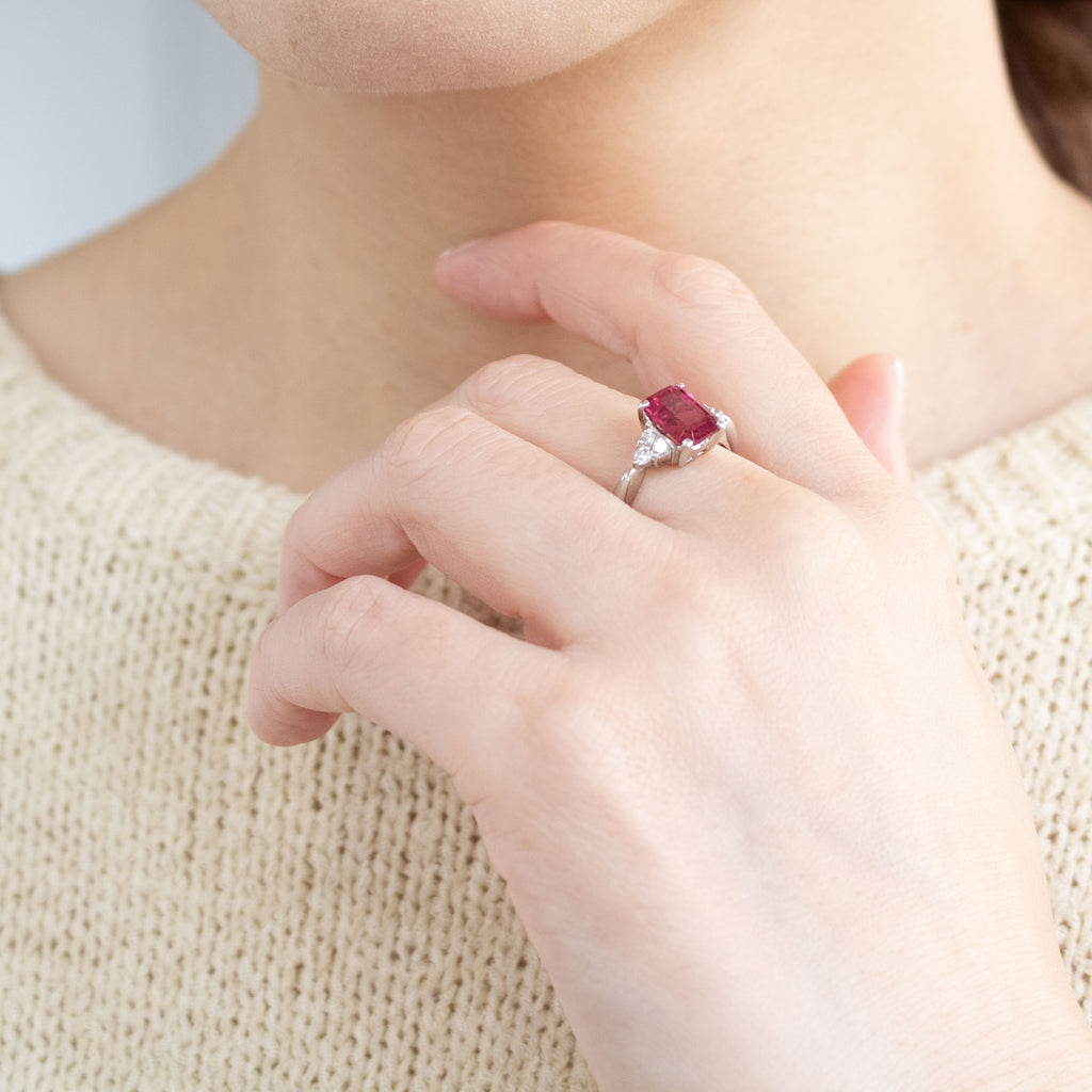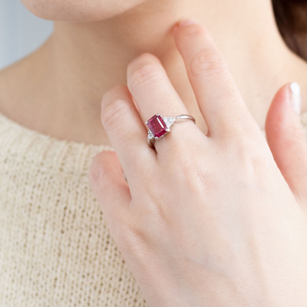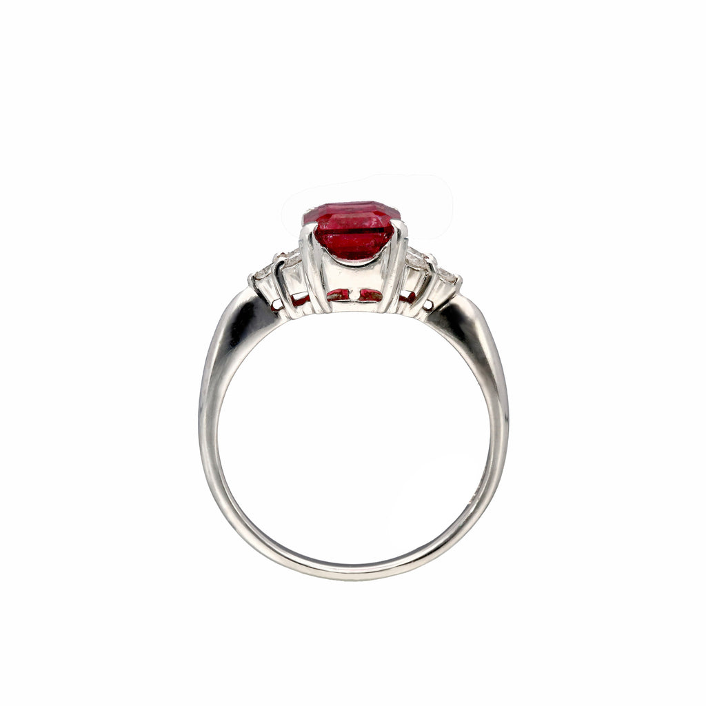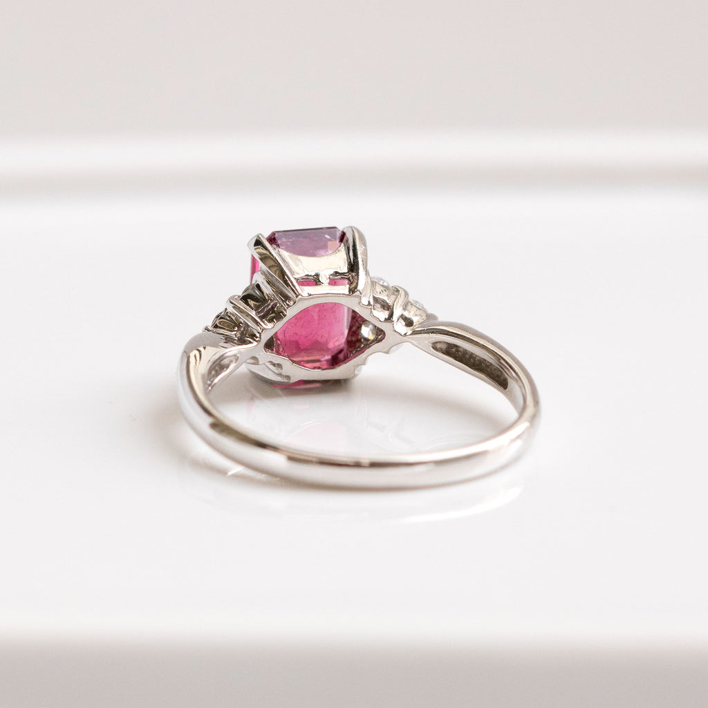 しっかりとした存在感のある大粒1.79ctのルベライトをエレガントな雰囲気のエメラルドカットにして、シンプルなデザインのリングに仕立てました。
