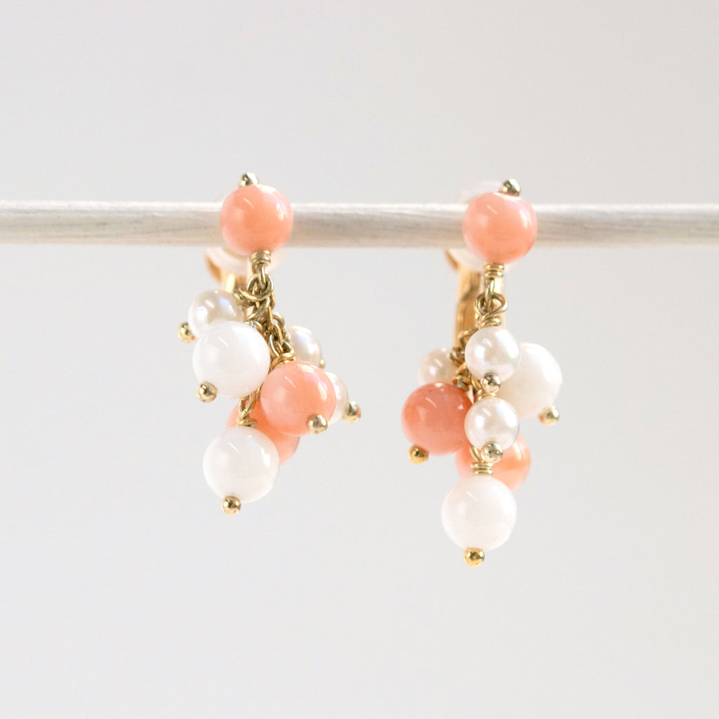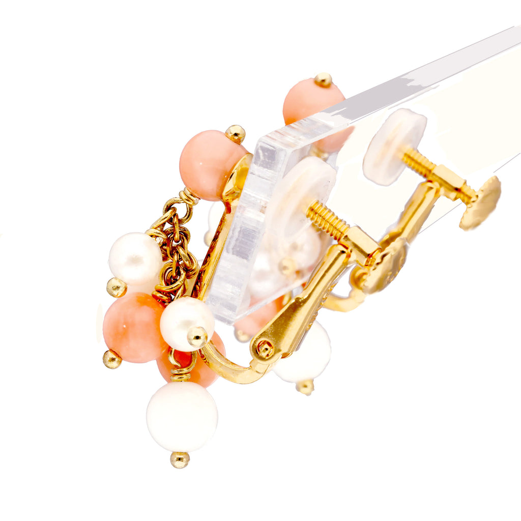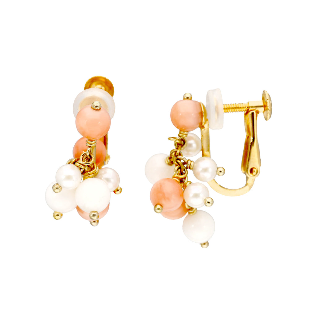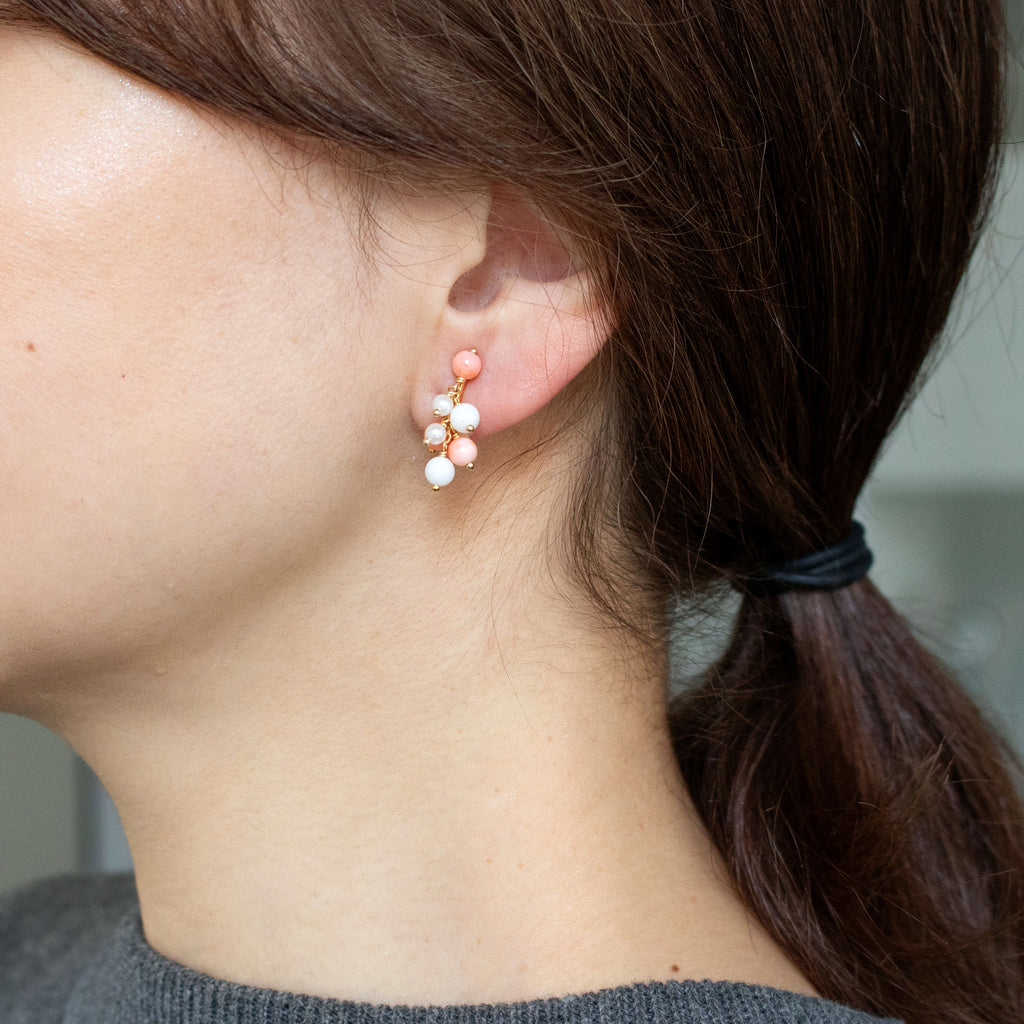 2色のサンゴは約4mmの丸玉。アコヤのベビーパールは約3mm。3種類の小さな玉がシャラシャラと耳元で揺れる可愛らしいデザインです。