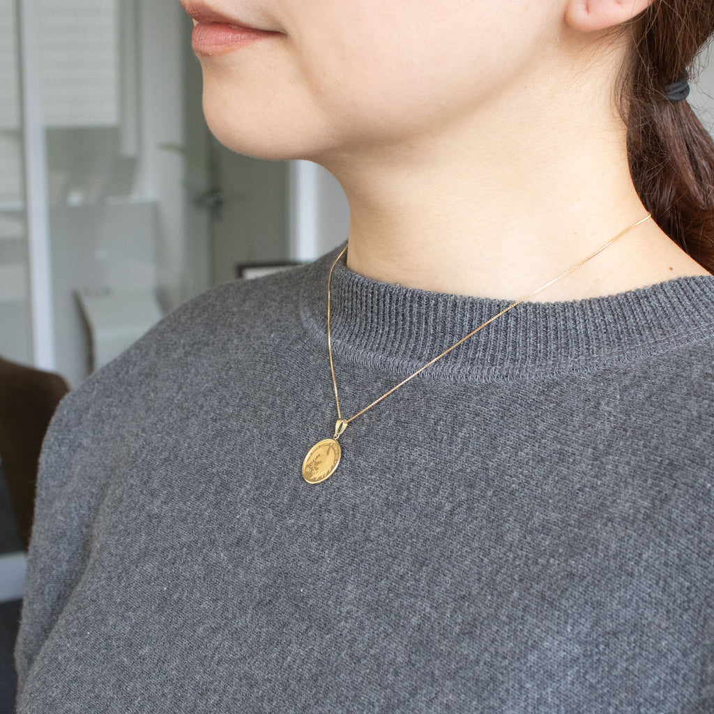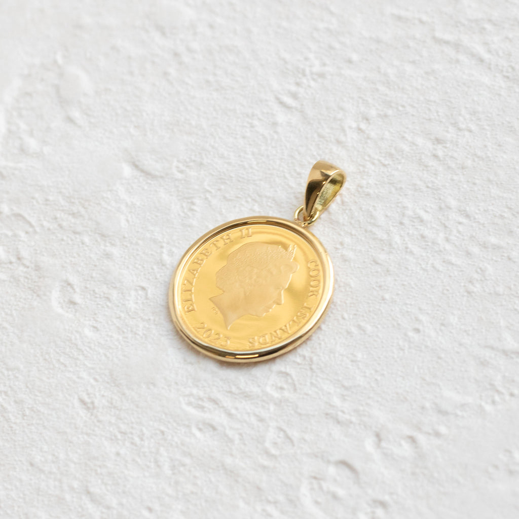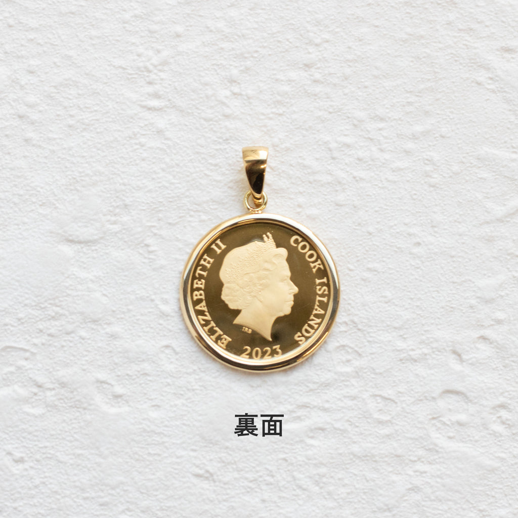 金の重さをあらわすのにはトロイオンス(=oz)という単位が使われ、1oz=約31.1gになります。1/20oz=約1.55gの純金製のコインを、18金製のシンプルな枠にセットしました。