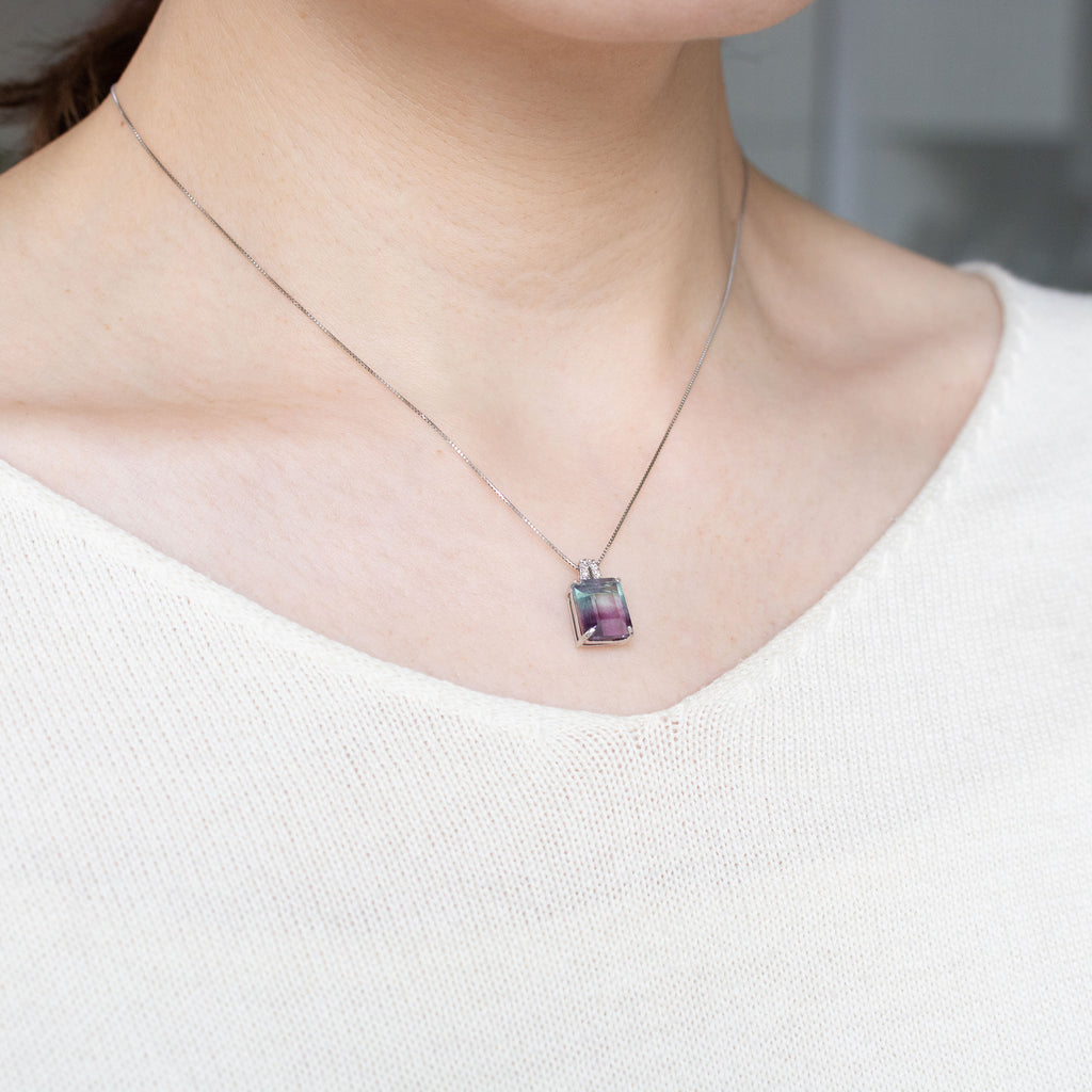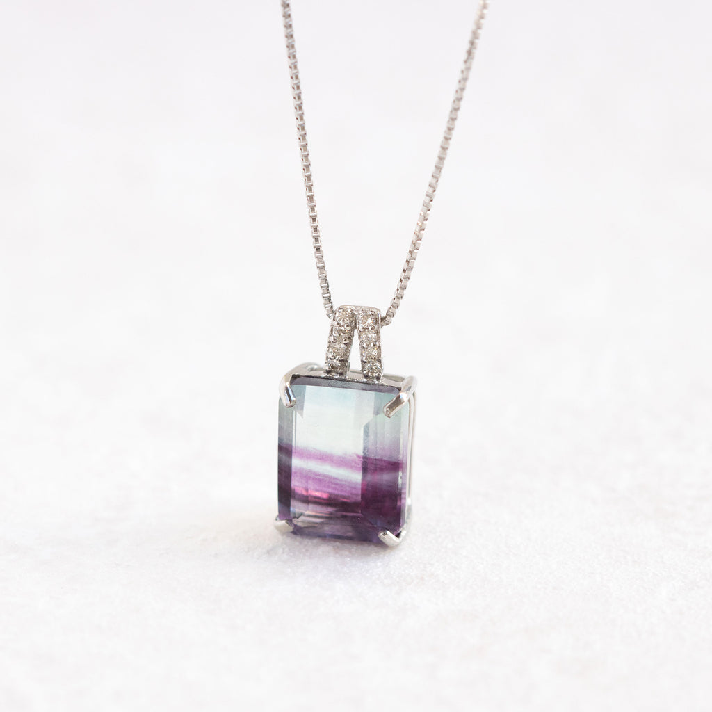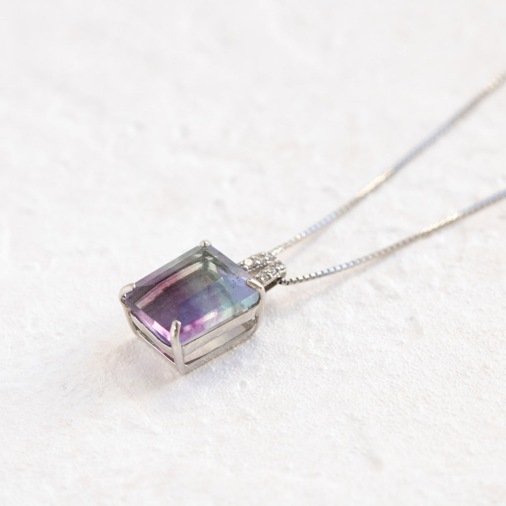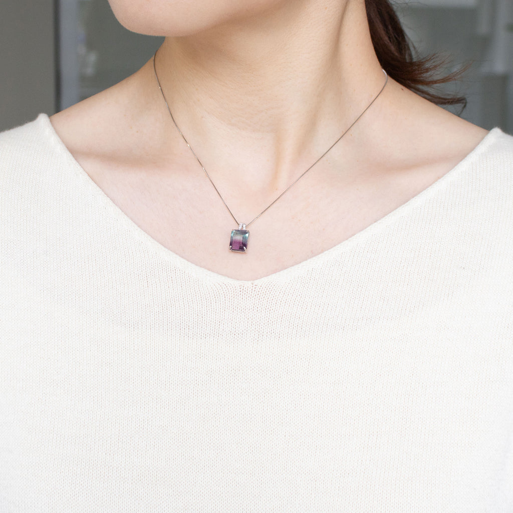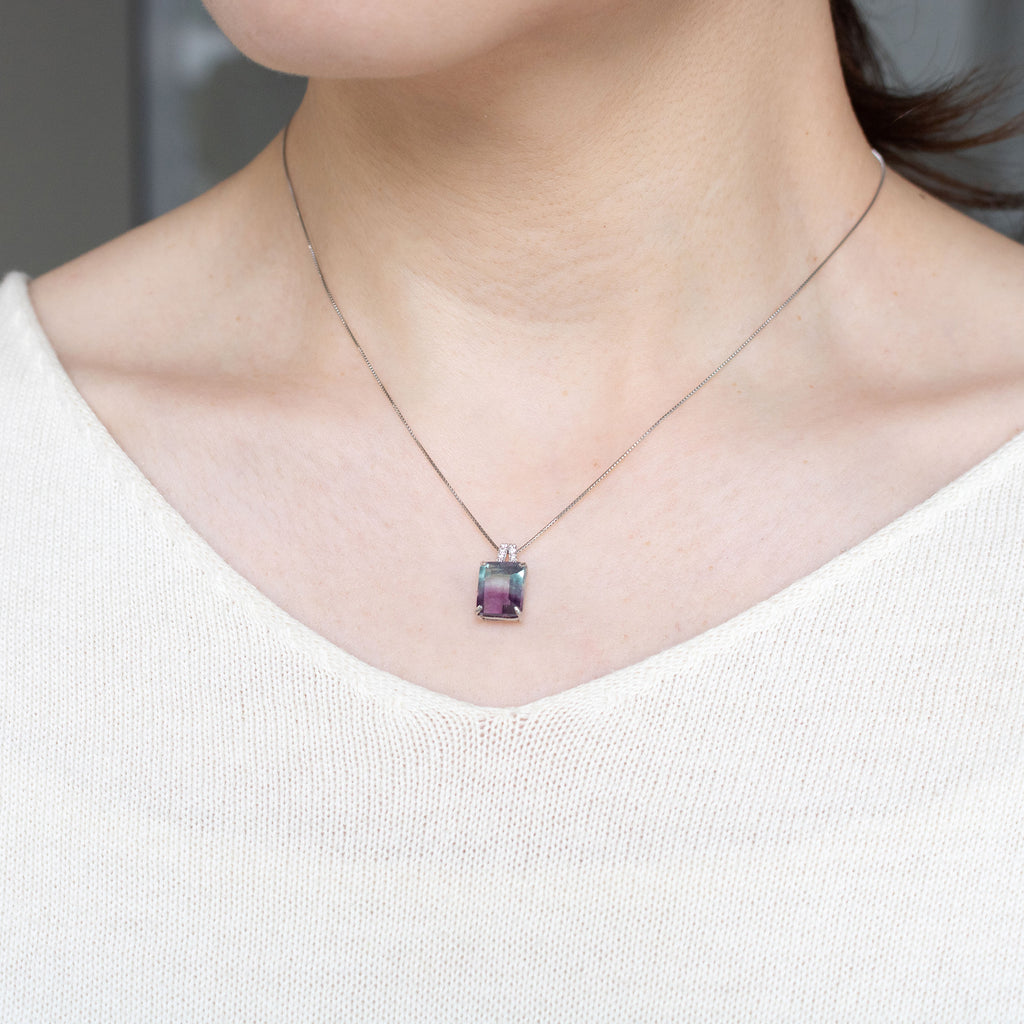模様が分かりやすいステップカットにしたパーティーカラード・フローライトをシンプルなデザインのネックレスに仕立てました。