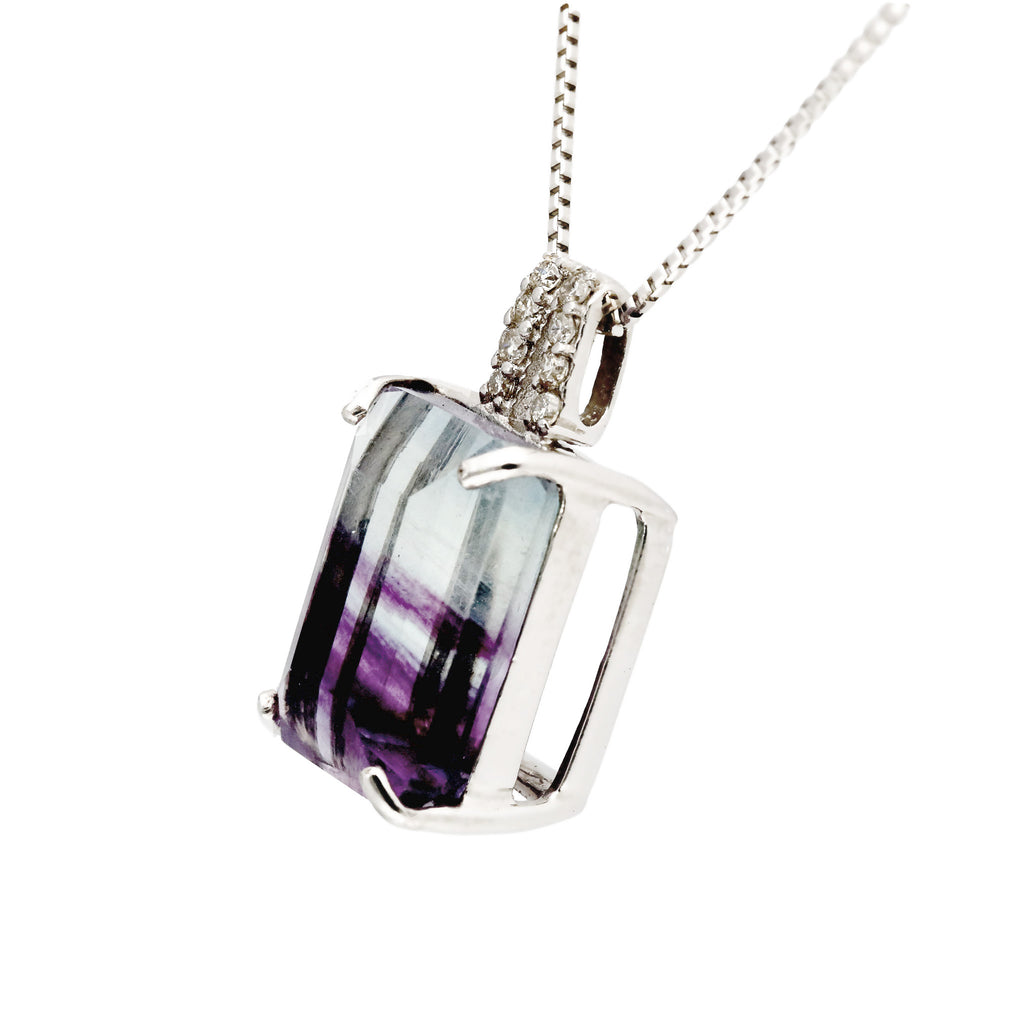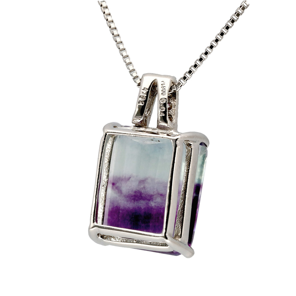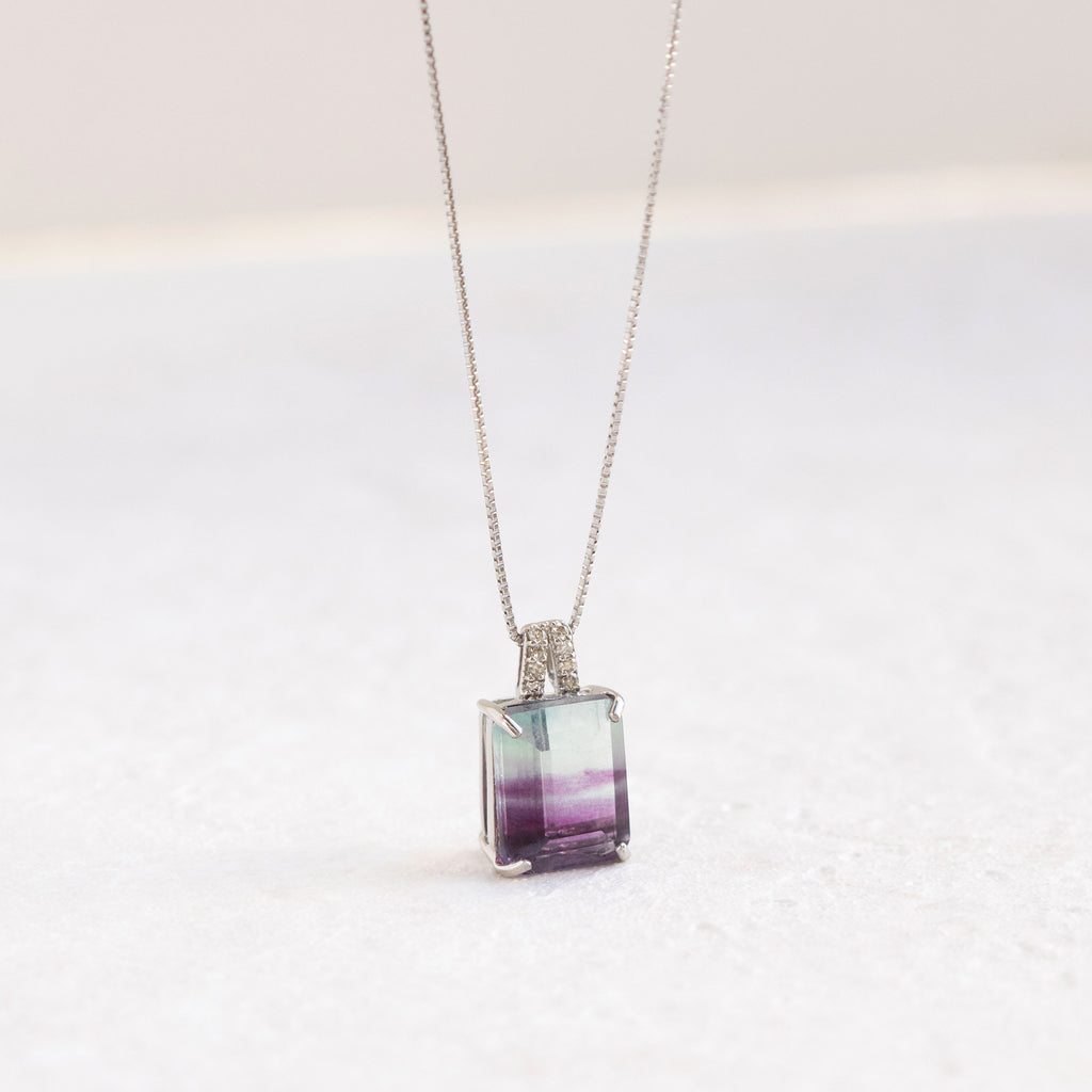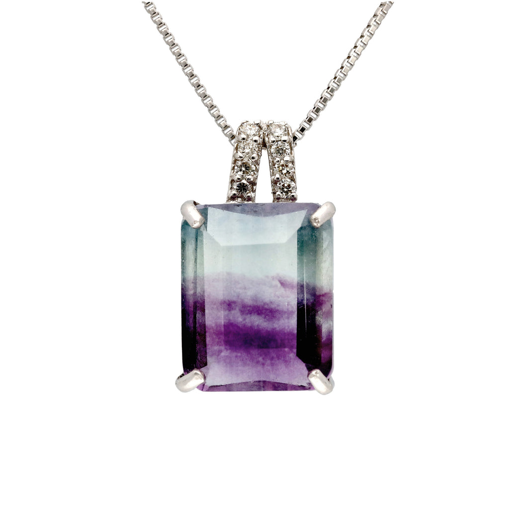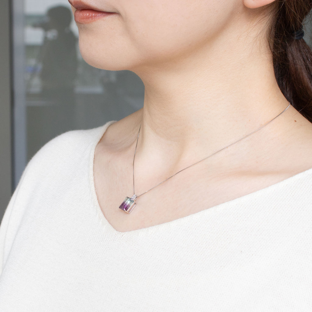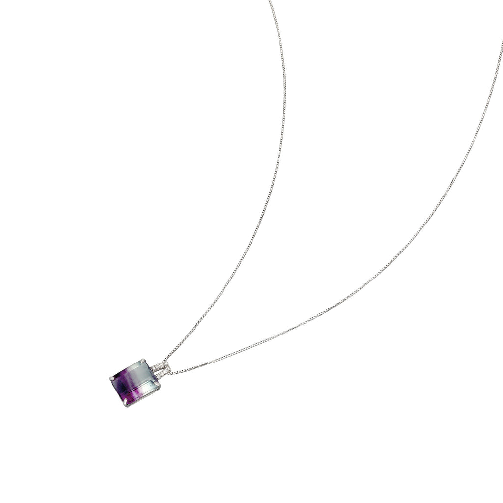 模様が分かりやすいステップカットにしたパーティーカラード・フローライトをシンプルなデザインのネックレスに仕立てました。