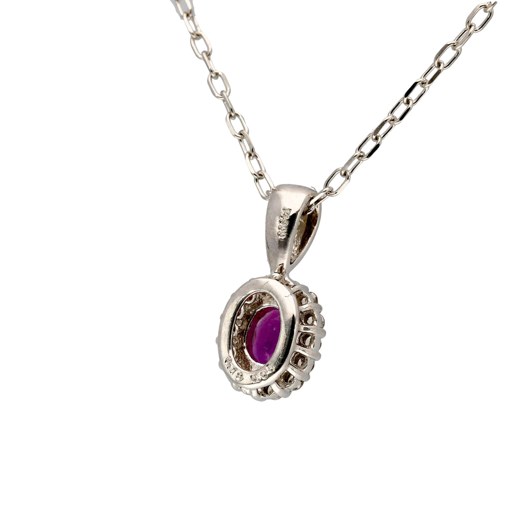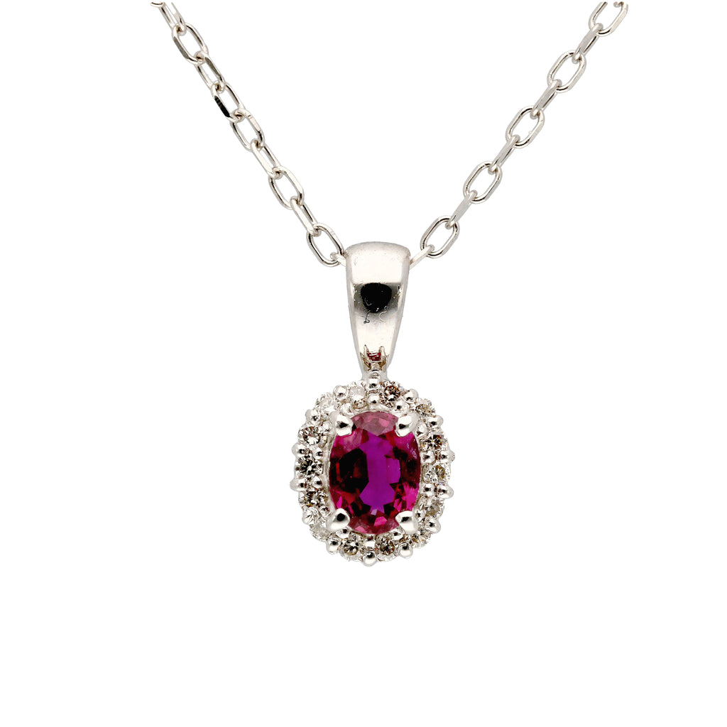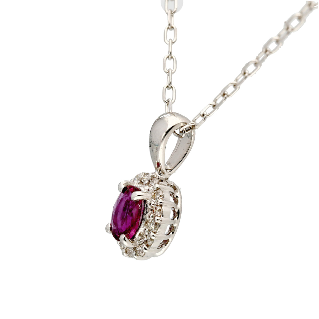 0.19ctのオーバルシェイプのルビーの周りを輝きのよいメレダイヤでぐるりと取り巻いた、適度に華やかなデザインです。