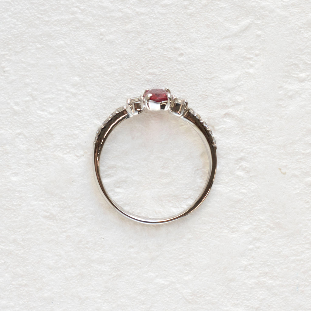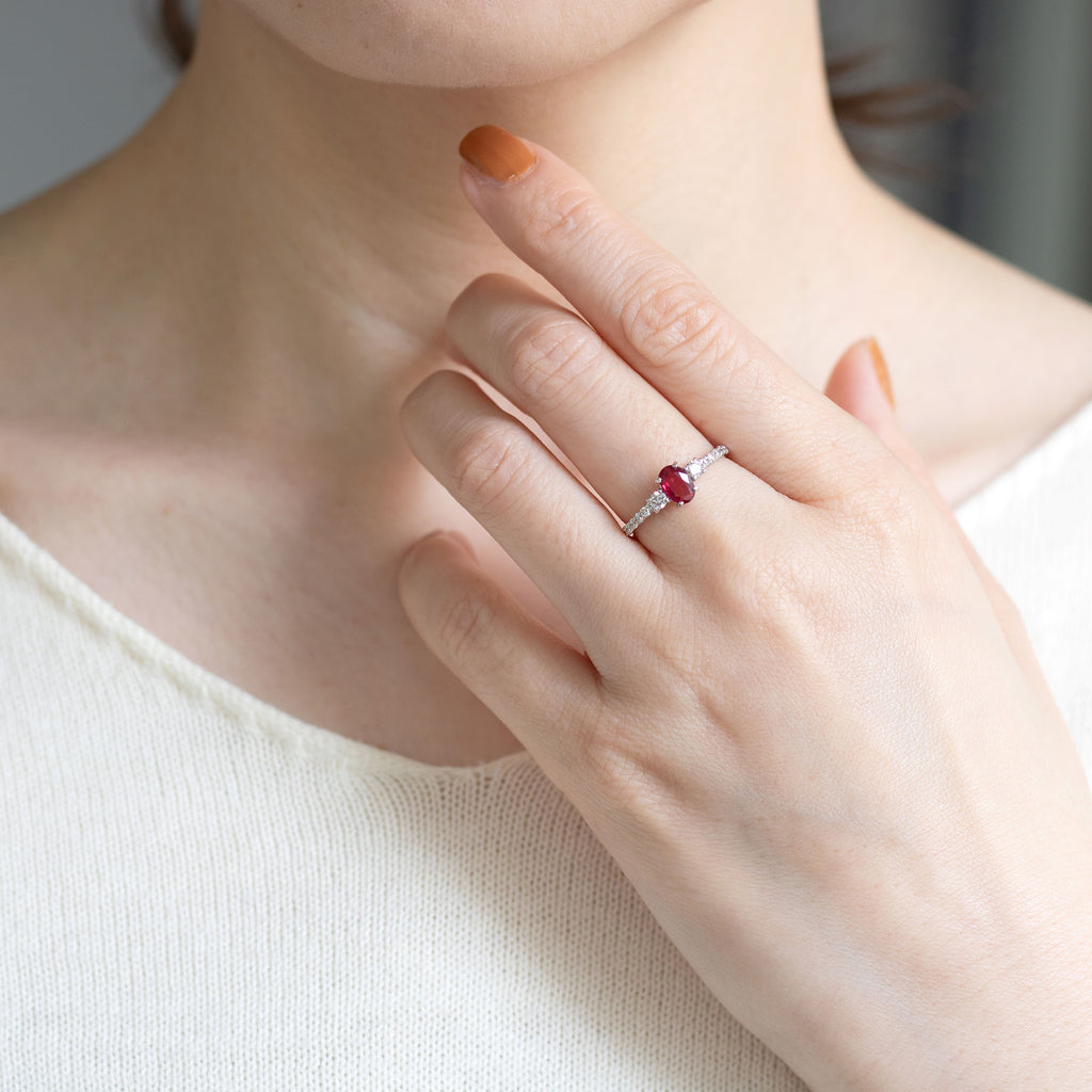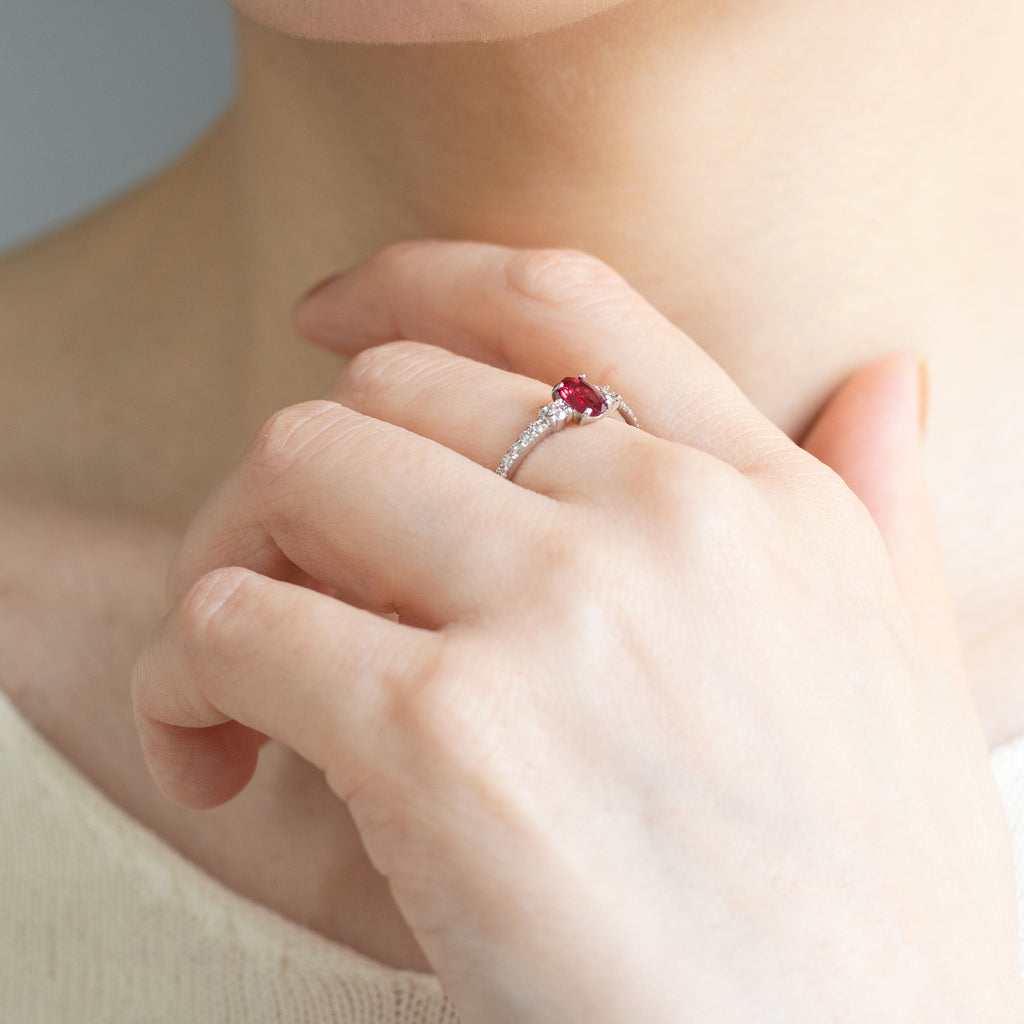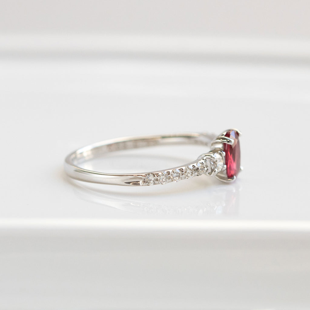 ルビーの左右に大き目のメレダイヤを1石ずつ留めて、腕の部分には小さなメレダイヤを一列に留めた適度に華やかなデザインです。力強く輝くダイヤの間で、ルビーの鮮やかな赤い色とてりの良さが際立ちます。