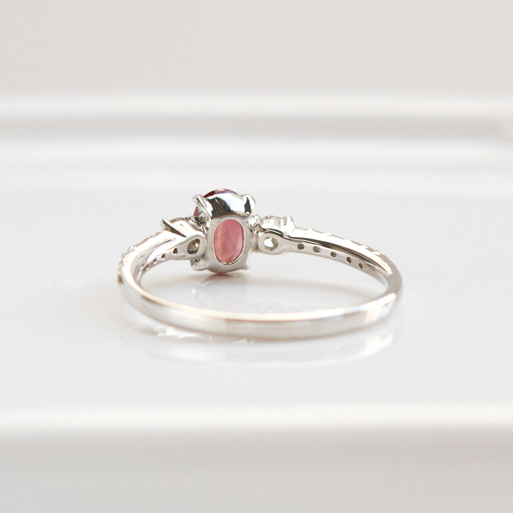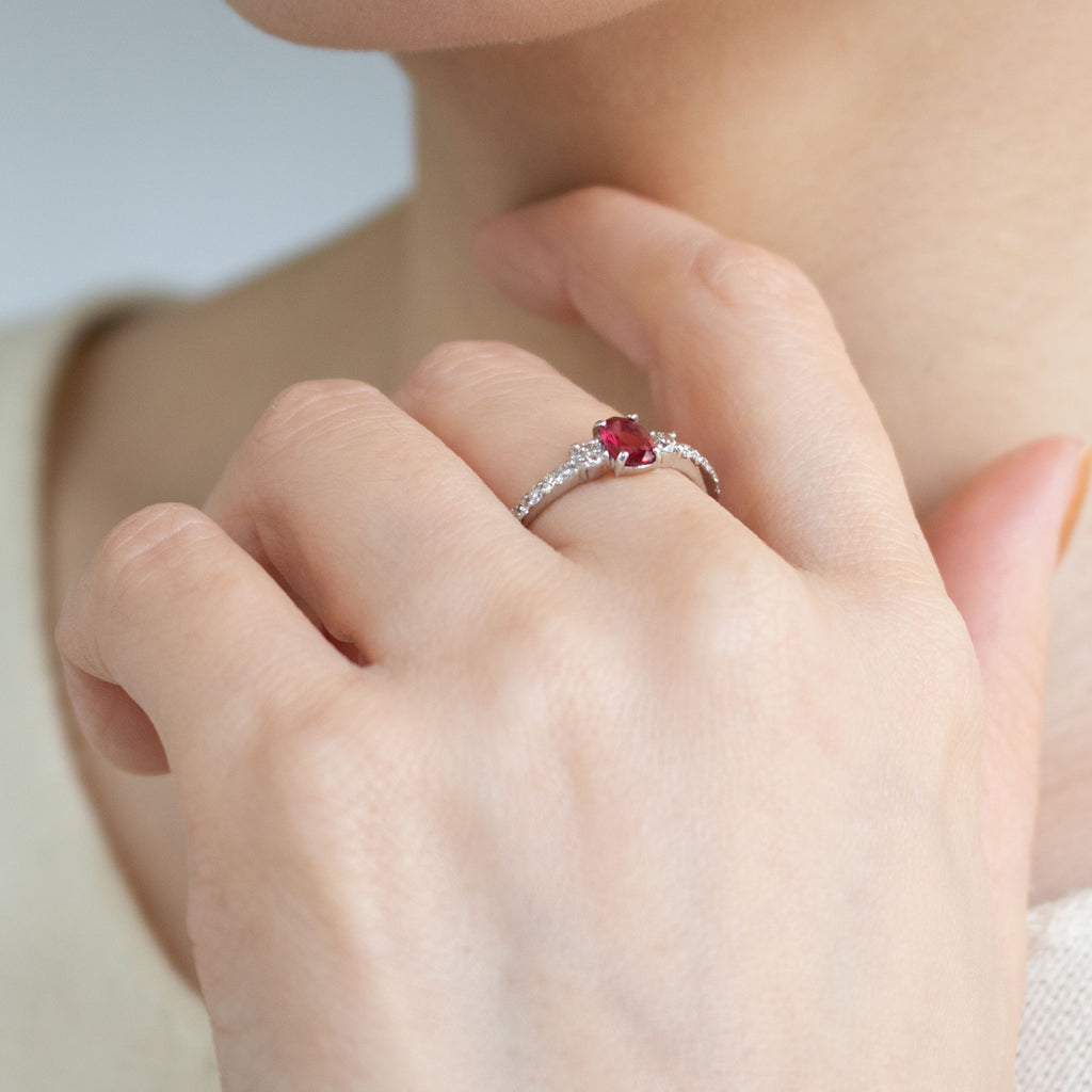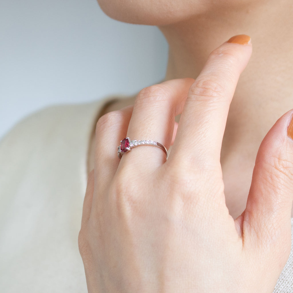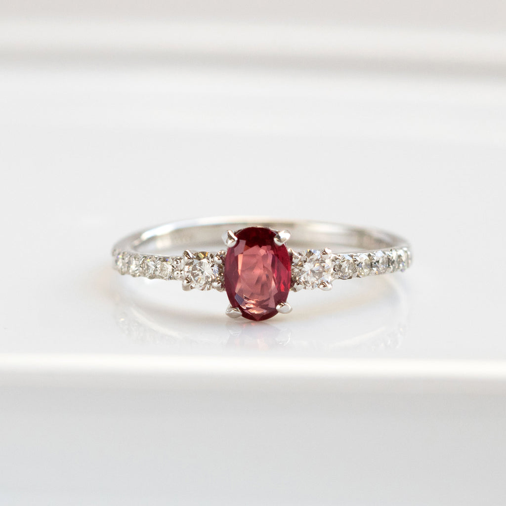 ルビーの左右に大き目のメレダイヤを1石ずつ留めて、腕の部分には小さなメレダイヤを一列に留めた適度に華やかなデザインです。力強く輝くダイヤの間で、ルビーの鮮やかな赤い色とてりの良さが際立ちます。