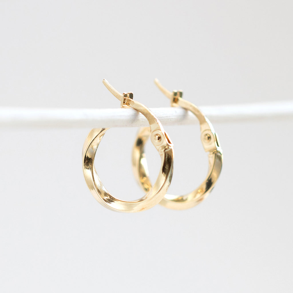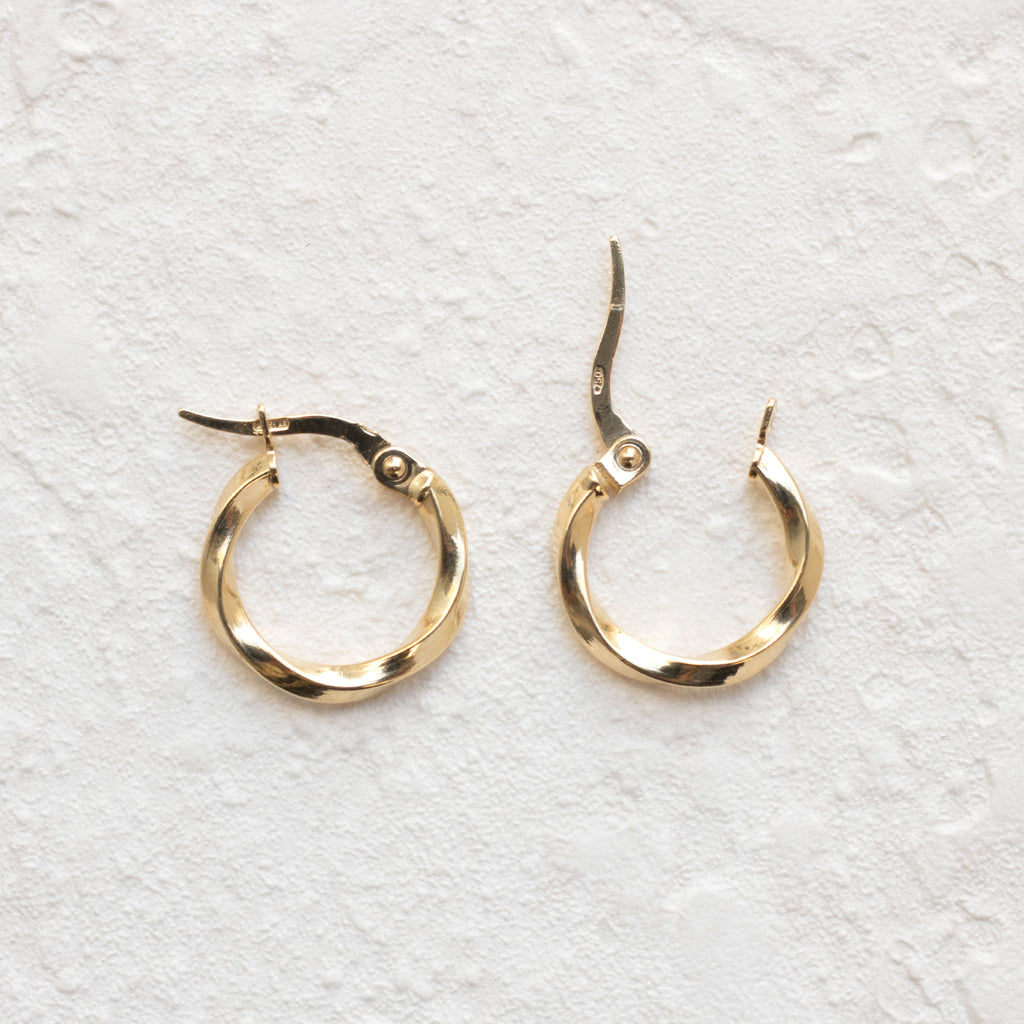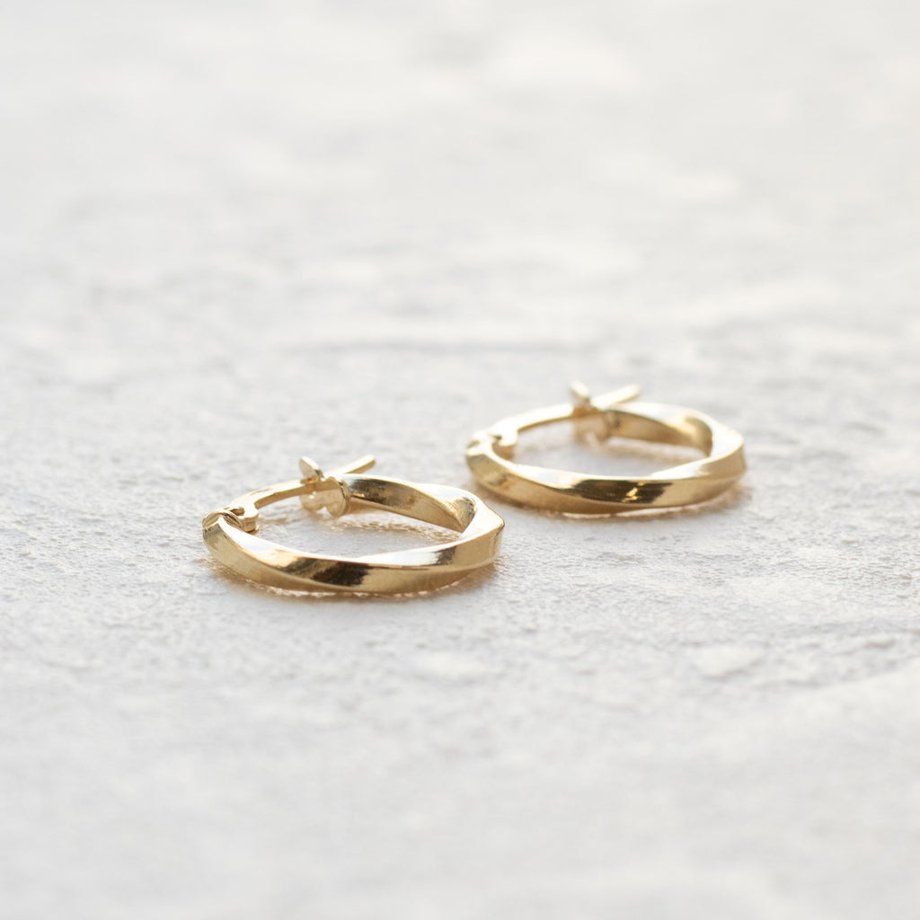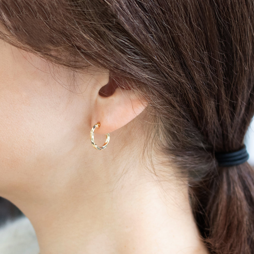 ひねりを加えた中空のパイプパーツを使ったフープデザインのピアス。