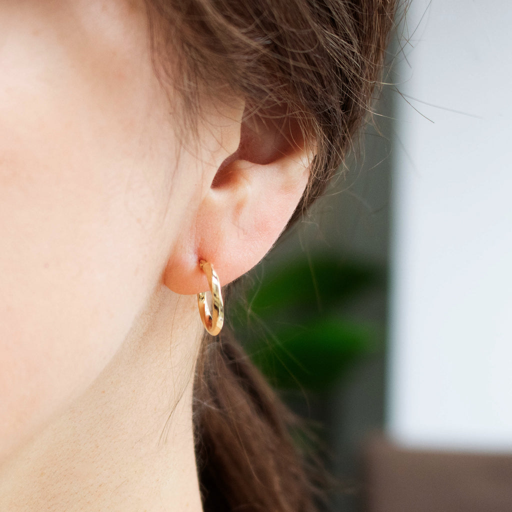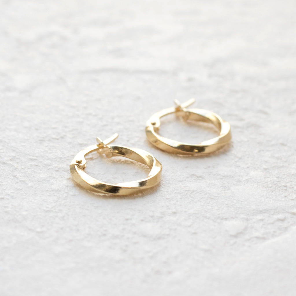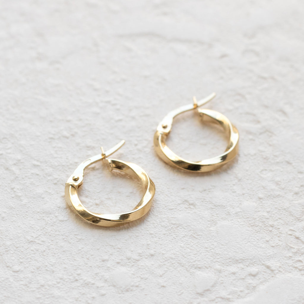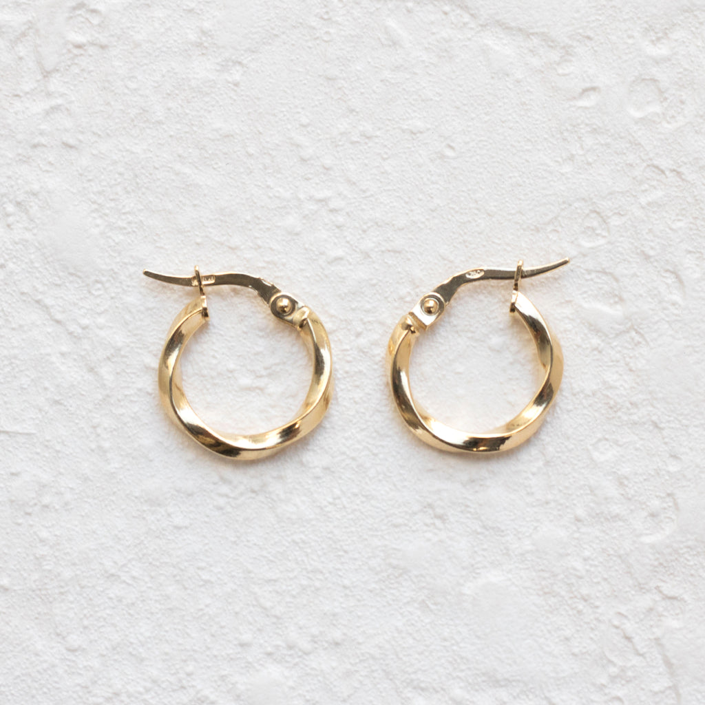 ひねりを加えた中空のパイプパーツを使ったフープデザインのピアス。