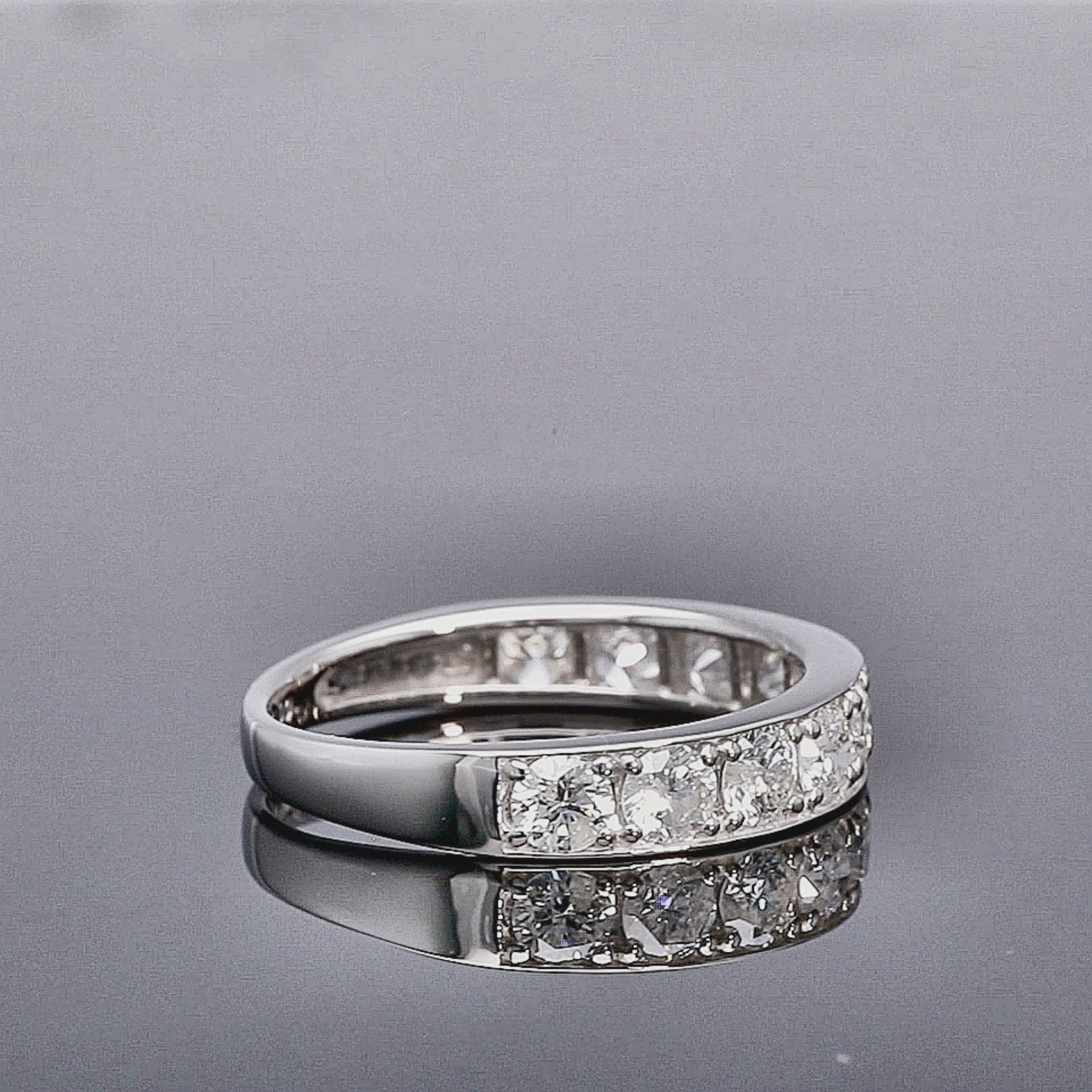 「エタニティ」とは英語で「永遠」という意味のリングで、リングの全周にとぎれなく同カット、同サイズの宝石を留めてものを「フルエタニティ」と称しますが、半周程度石が留められたものを「ハーフエタニティ」と称します。