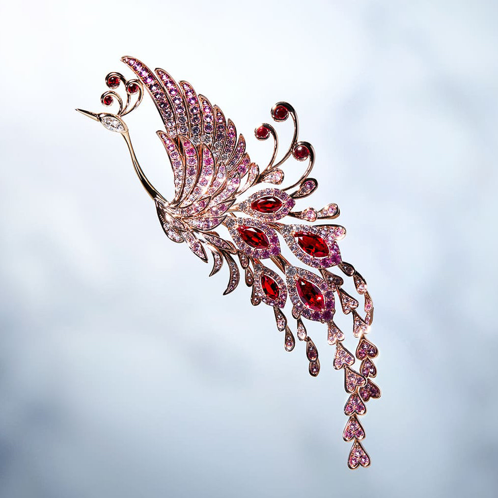 また、朱雀の気高く舞う姿を、ルビーとピンクサファイアのグラデーションで表現しました。