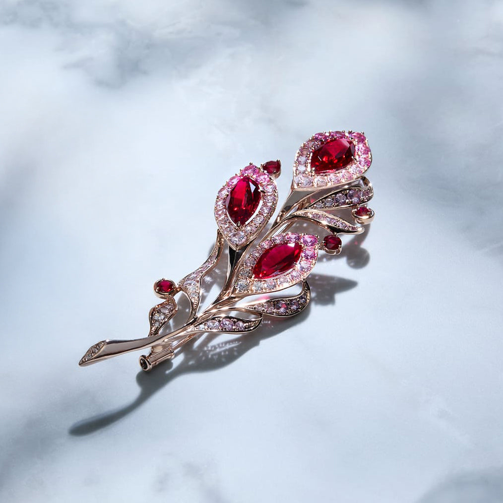 また、朱雀の気高く舞う姿を、ルビーとピンクサファイアのグラデーションで表現しました。