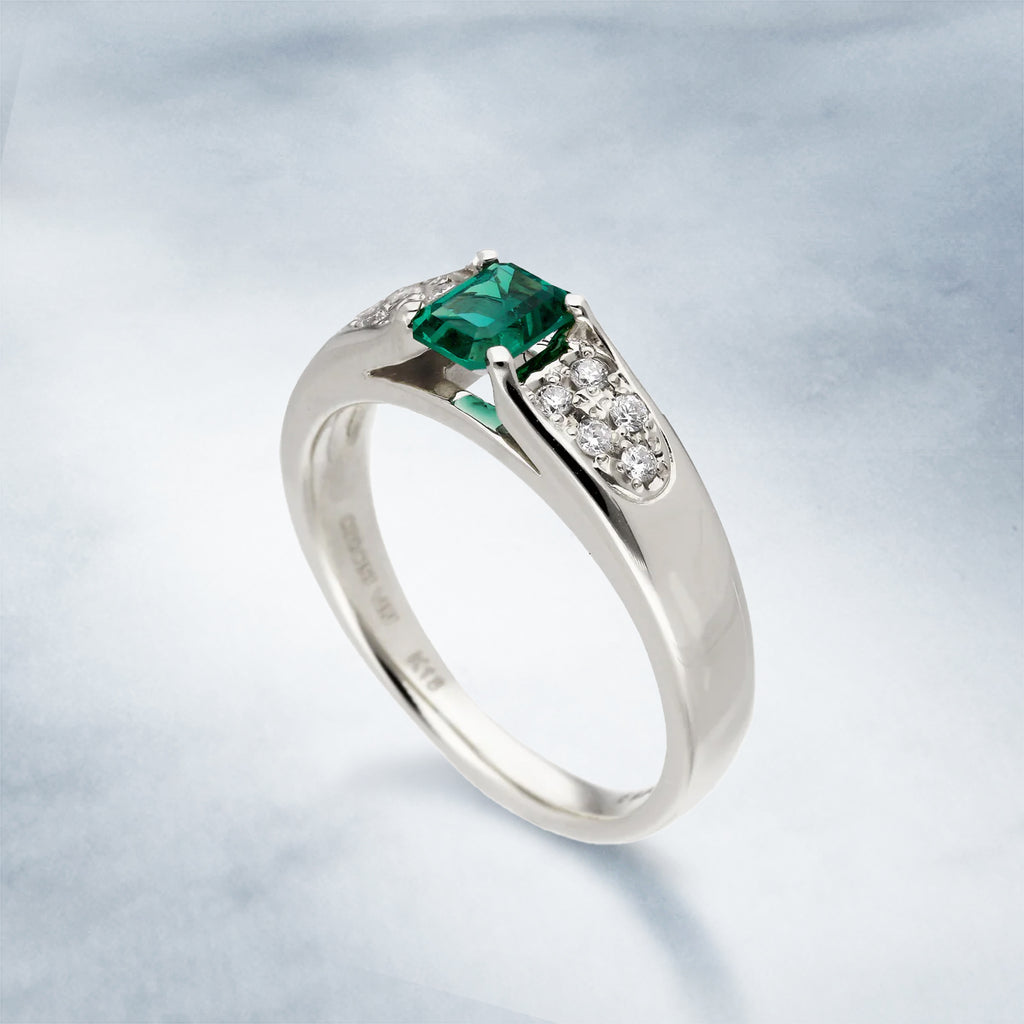 京セラ宝飾事業50周年を記念してラボグロウン誕生の原点に立ち返り、初めて作られたエメラルドと同じサイズの石を使用したリングを作成しました。