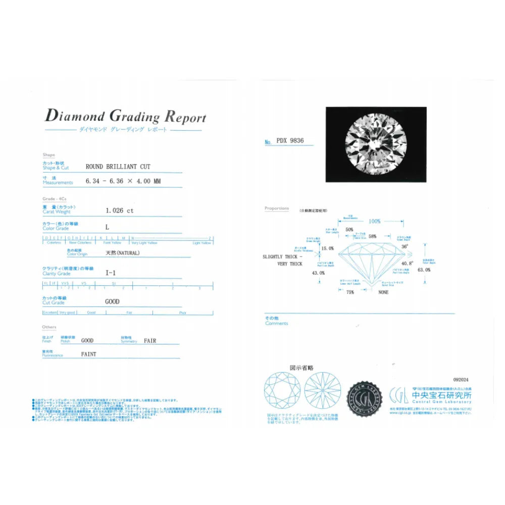 - ダイヤモンド 1石1.026ct(L-I1-GD)