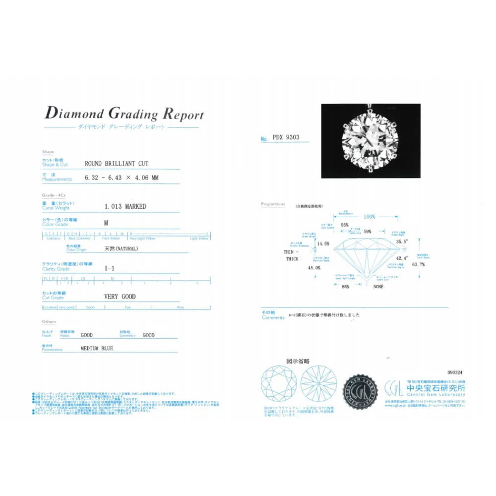 - ダイヤモンド 1石1.013ct(M-I1-VG)