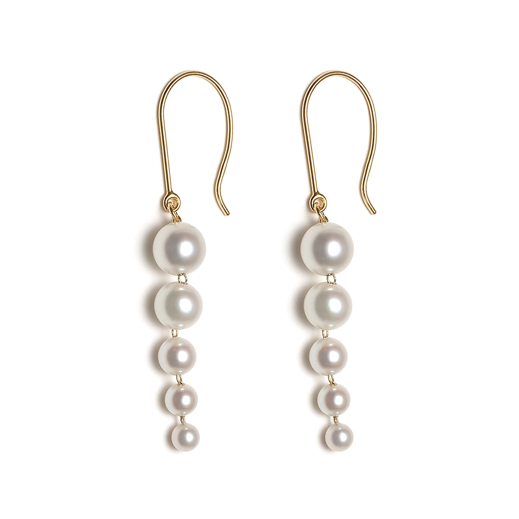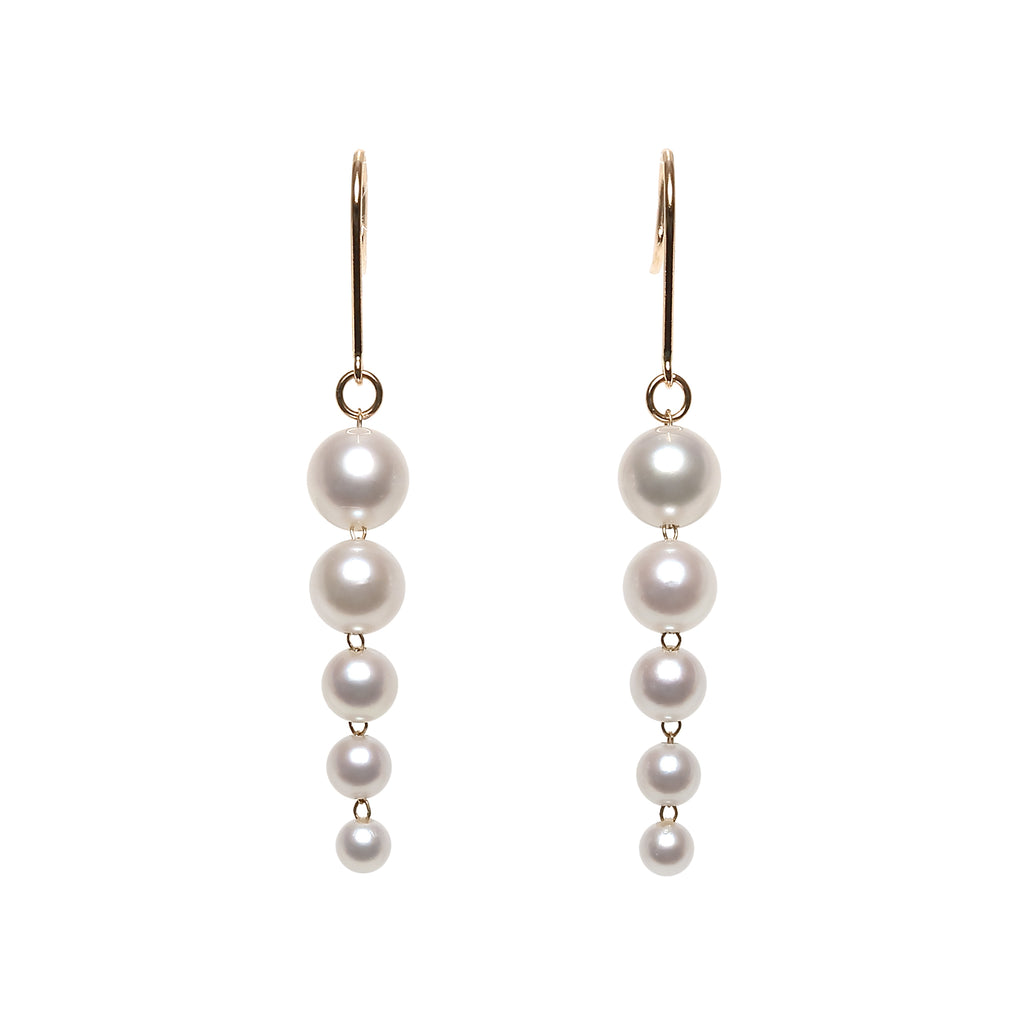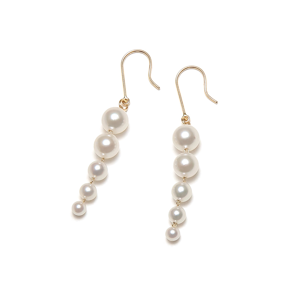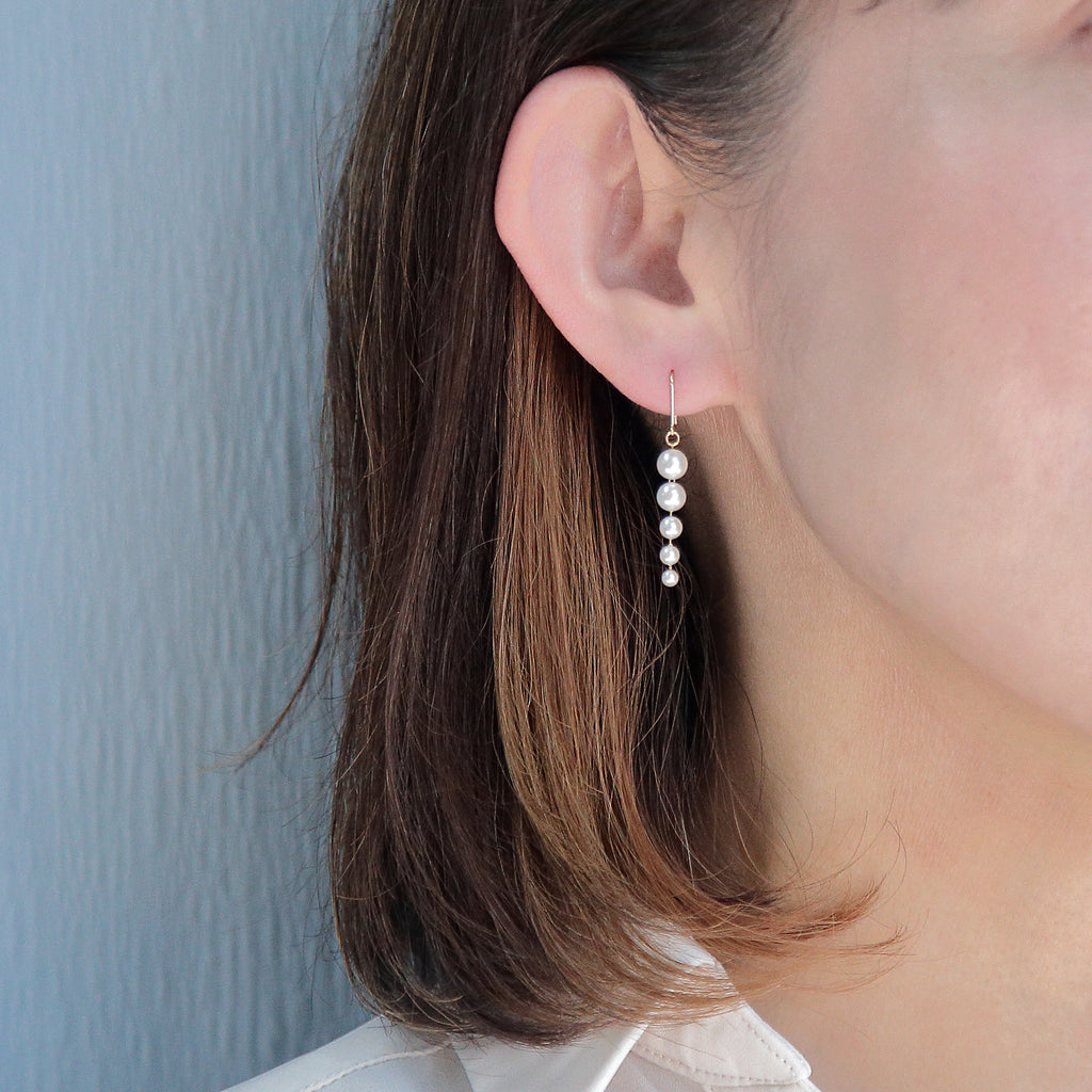 ベビーアコヤパールをサイズグラデーションに連ねたスタイリッシュなピアスです。 縦ラインがきりっとした印象でパールの美しさを引き立てています。 小ぶりですが揺れて動きのある魅力的なデザインです。