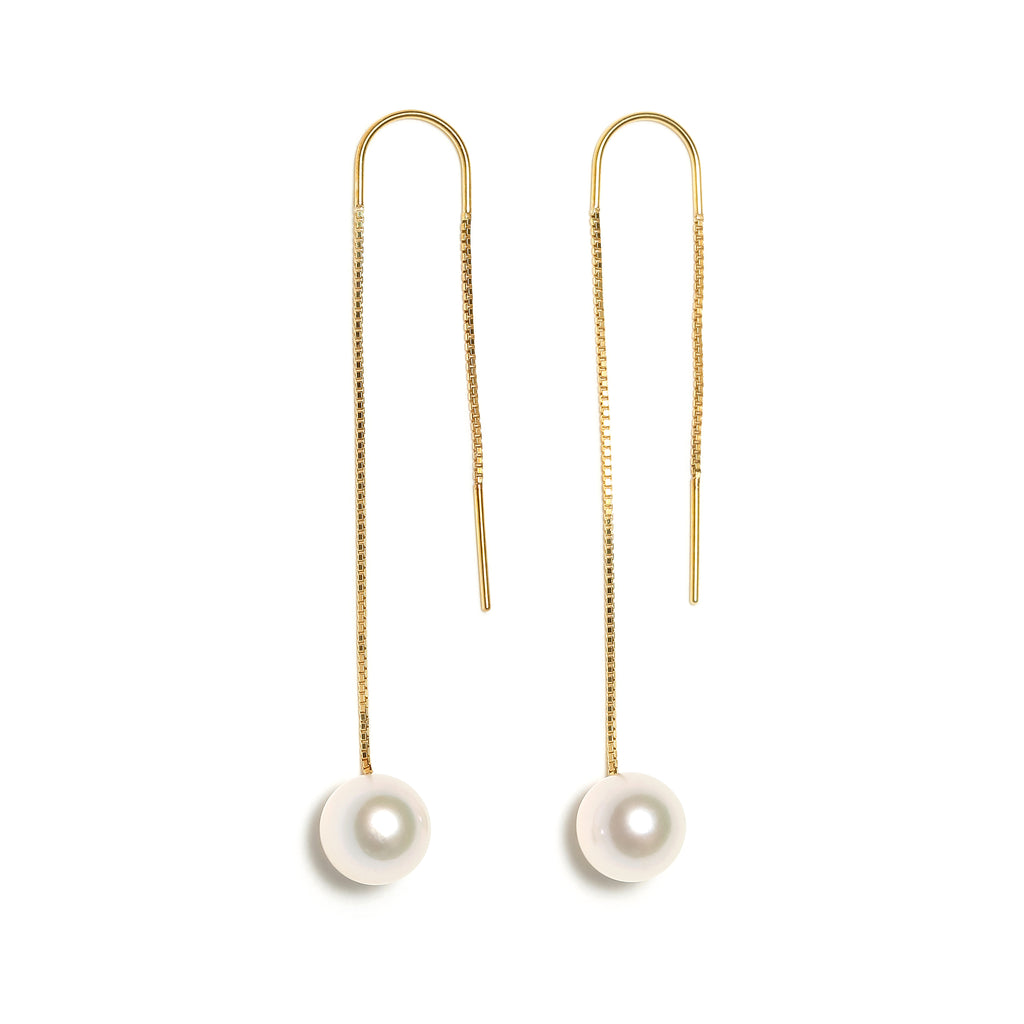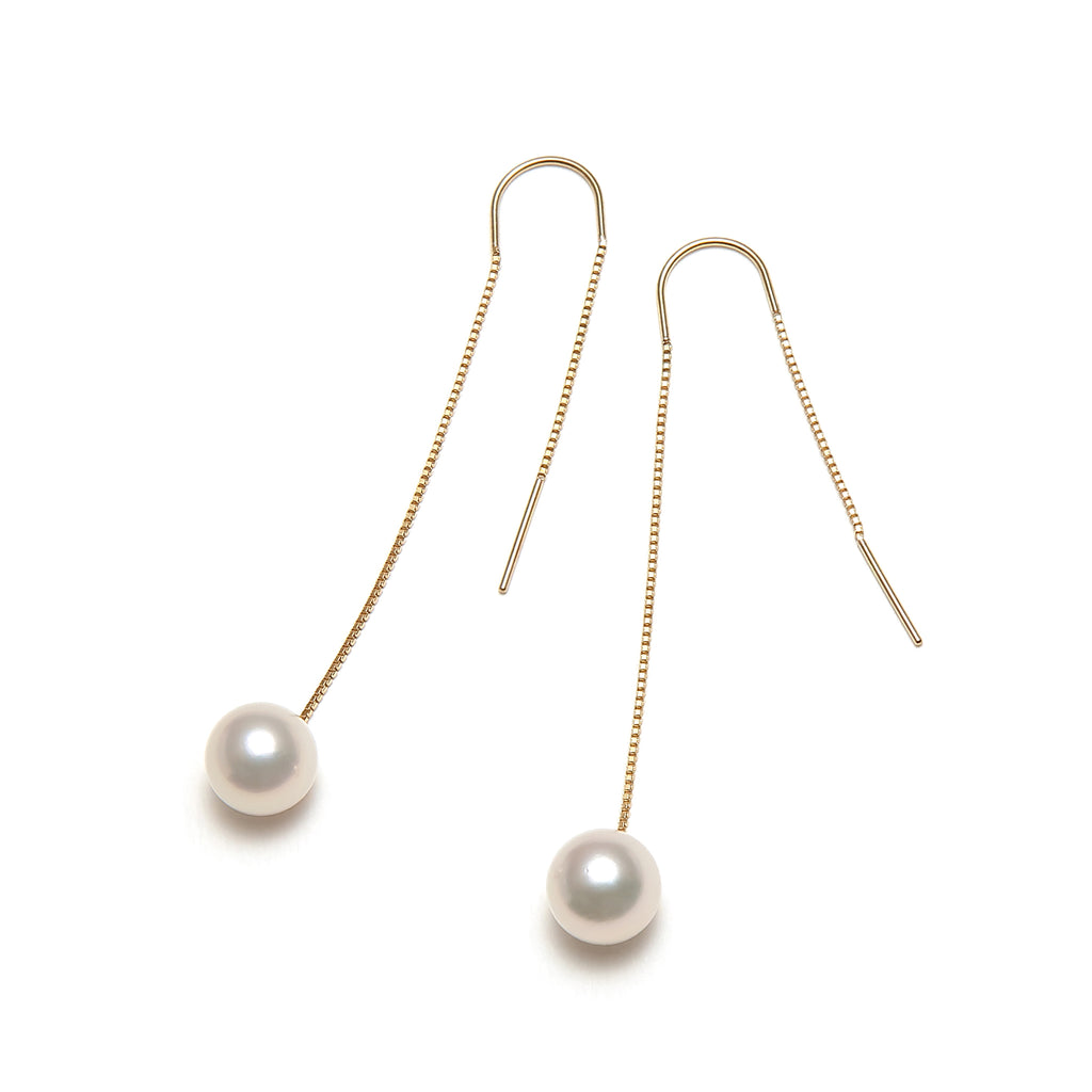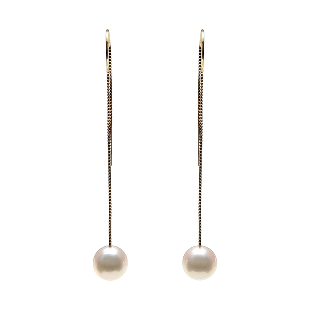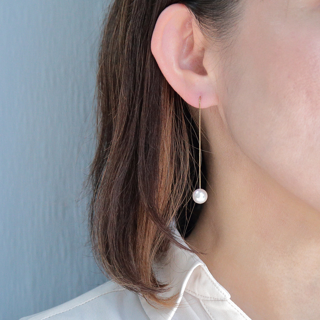 少し長めのシンプルなデザインに艶やかなチェーンとアコヤパールが映えるピアスです。 ゆれる一粒の存在感がエレガントなアイテムです。
