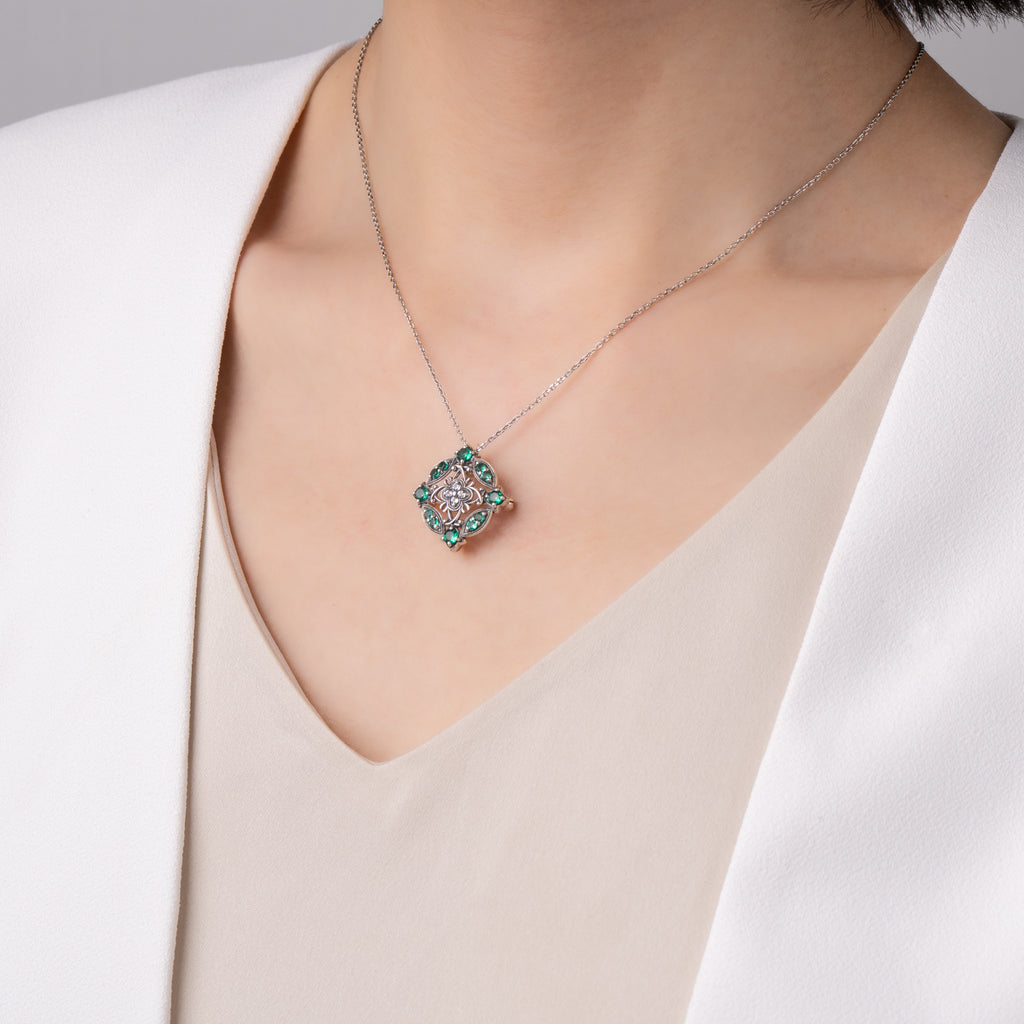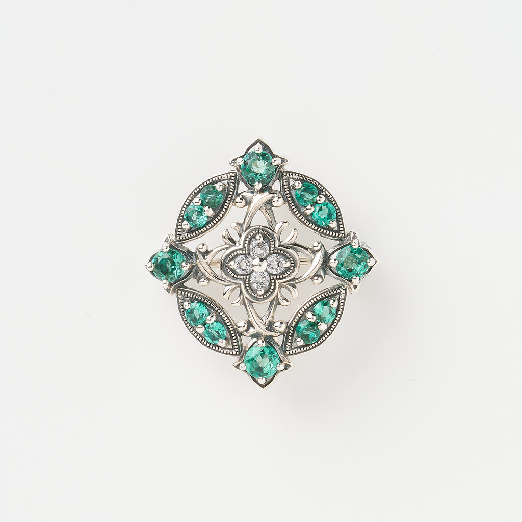 【 《English Garden/クレマチス》シルバー製 ラボグロウンエメラルド ホワイトトパーズブローチ兼ペンダントトップ 】