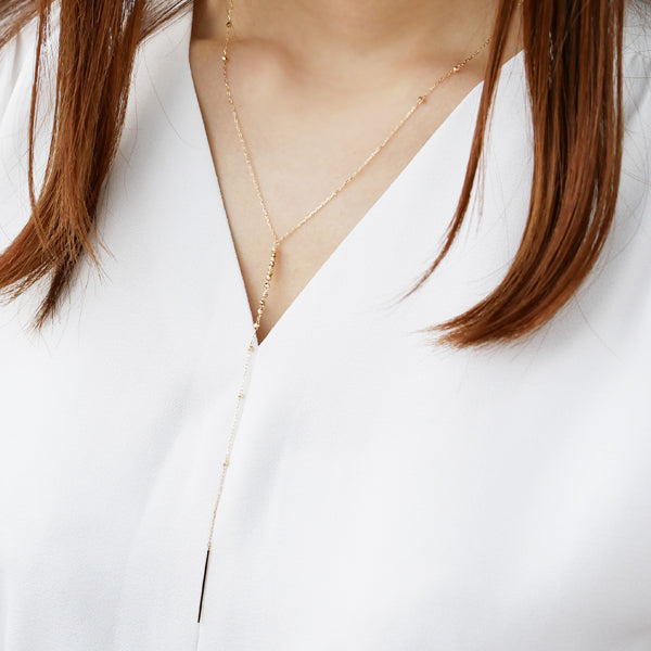 美しいシルエットが人気のYラインのイエローゴールドネックレス。ネックレスのトップにかけてボリュームをもたせることで、美しいシルエットが映えるデザインに仕上がりました。 ネックレスのベースはキラキラとした輝きを放つあずきチェーン。シンプルになり過ぎないように所々にカットボールパーツを配置しております。 トップにはイエローゴールドのスティックパーツを使用、少しシャープな印象と華奢で女性らしいシルエットを演出します。 チェーンのエンドパーツにはハートモチーフを。そんなちょっとしたこだわりが詰まったアイテムです。 着用部分は全周45cm。スライドチェーンですので、自由に長さ調整が可能です。 Yラインのトップの長さは約12.5cm。計算され尽くした長さが美しいシルエットを生み出します。 そんなエレガントな印象を与えるYラインネックレスですが、上品なデザインなので普段使いにもおすすめのアイテムです。 是非ご愛用くださいませ。