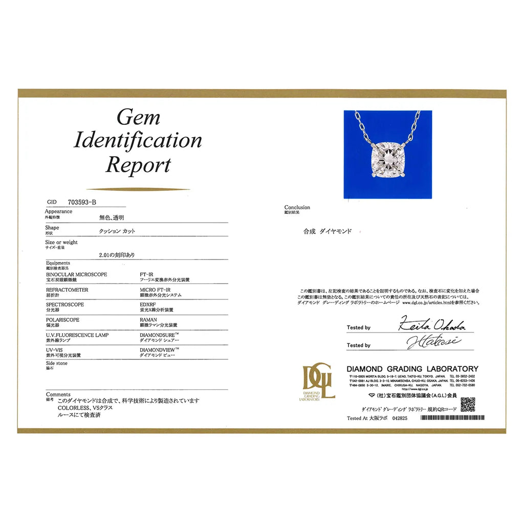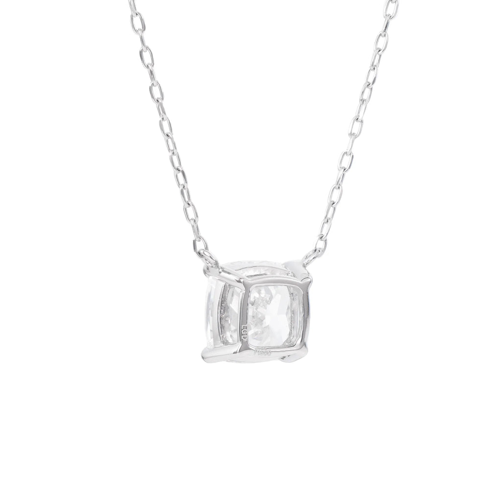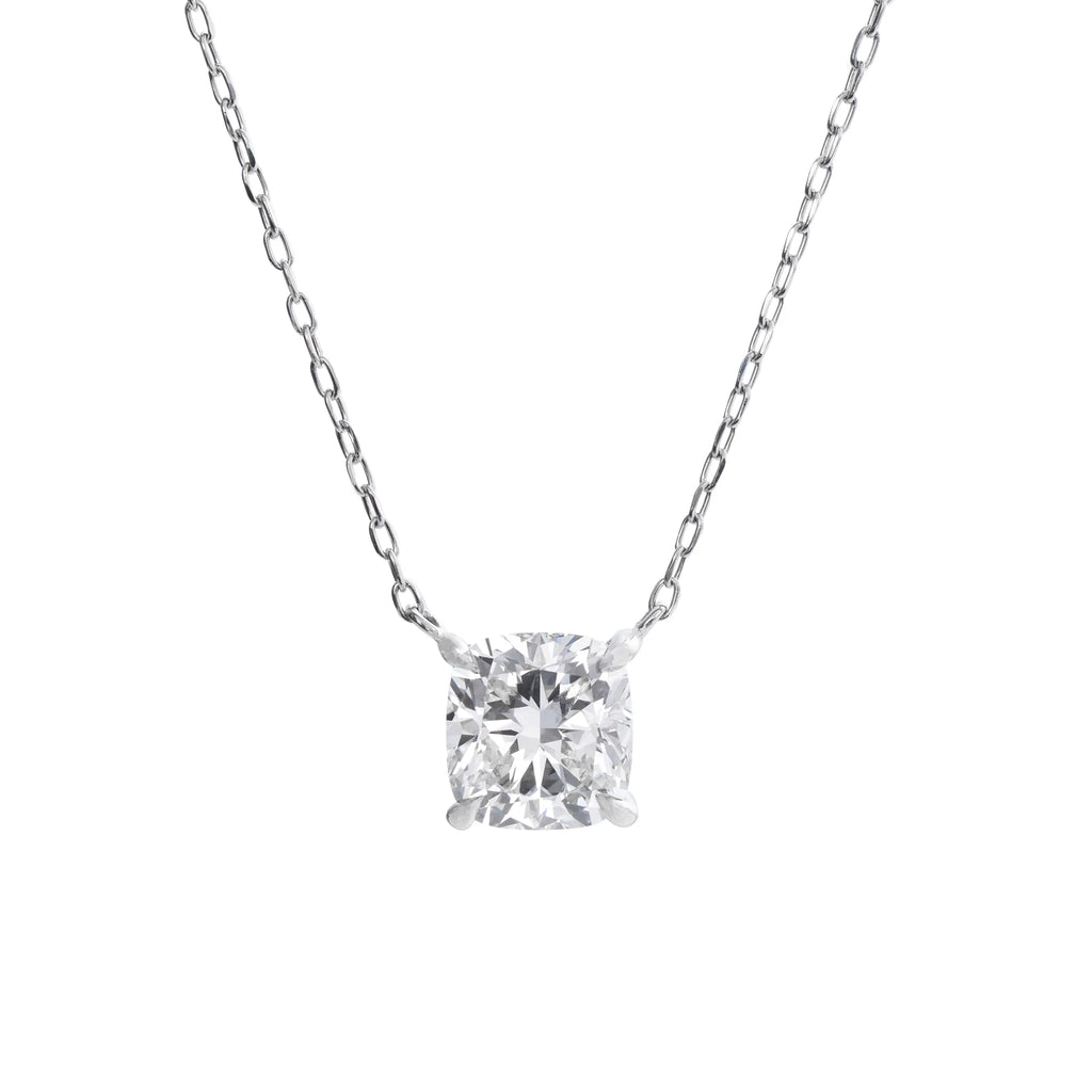 2.01ctのカラーレスダイヤモンドを、柔らかな輝きが魅力のクッションカットで仕上げたネックレス。