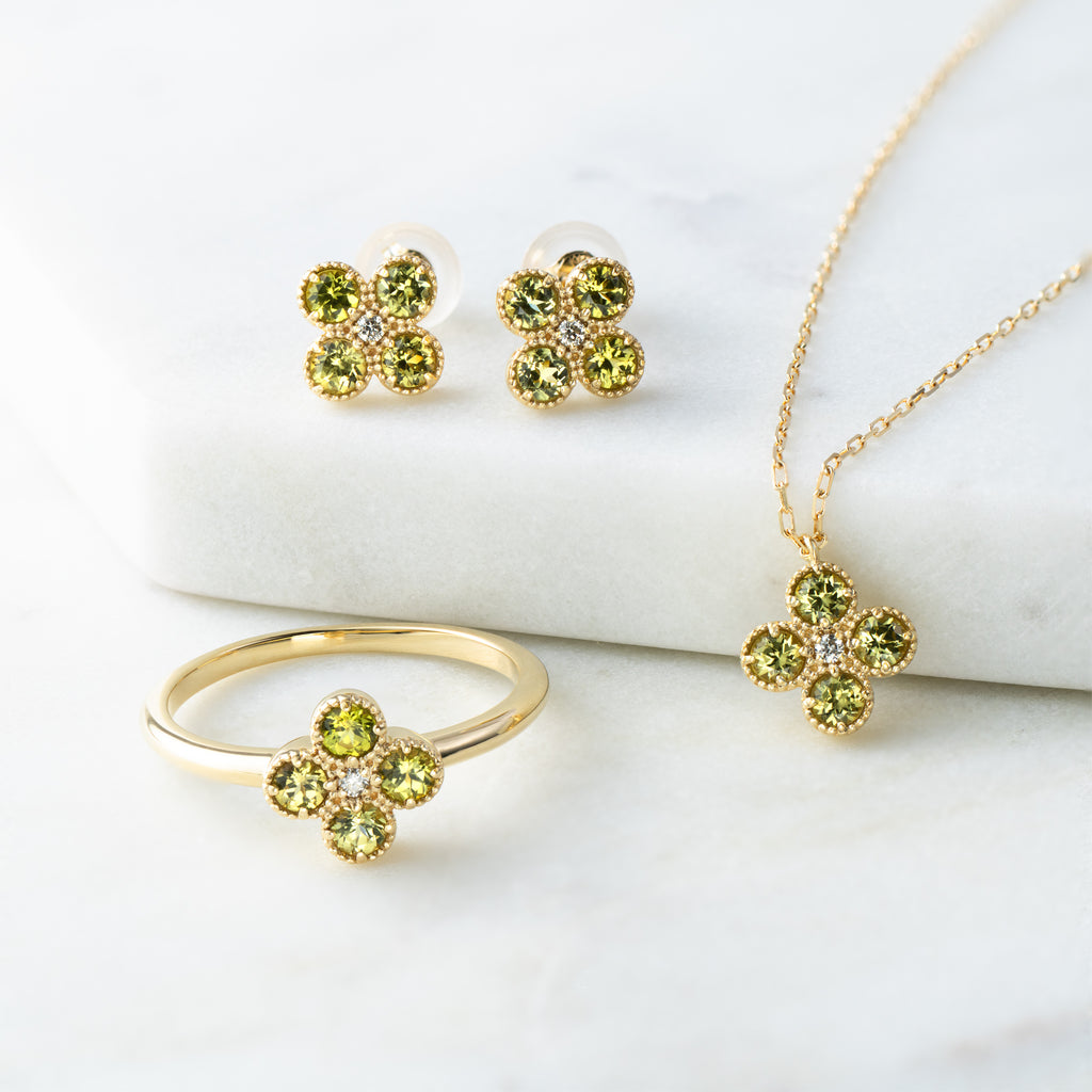 K18イエローゴールドでお作りすることでマリガーネットのライムカラーが馴染んでさわやかな印象を与えてくれます