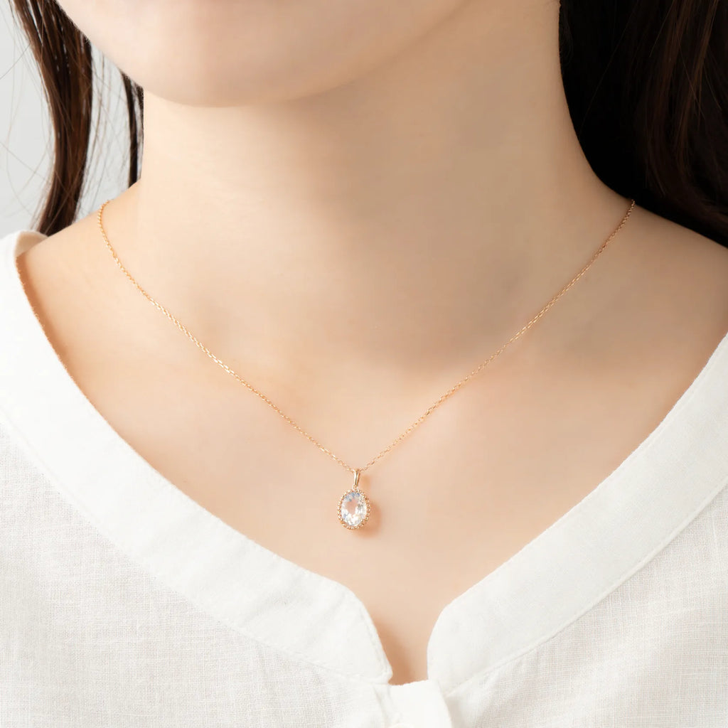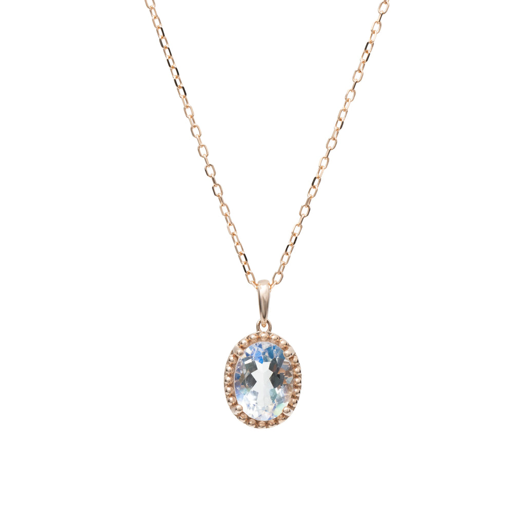 オーバルカット(8×6mm・0.9ctUP)のアンデシンラブラドライトが胸元で存在感を放つ、K18ピンクゴールドのネックレスです。