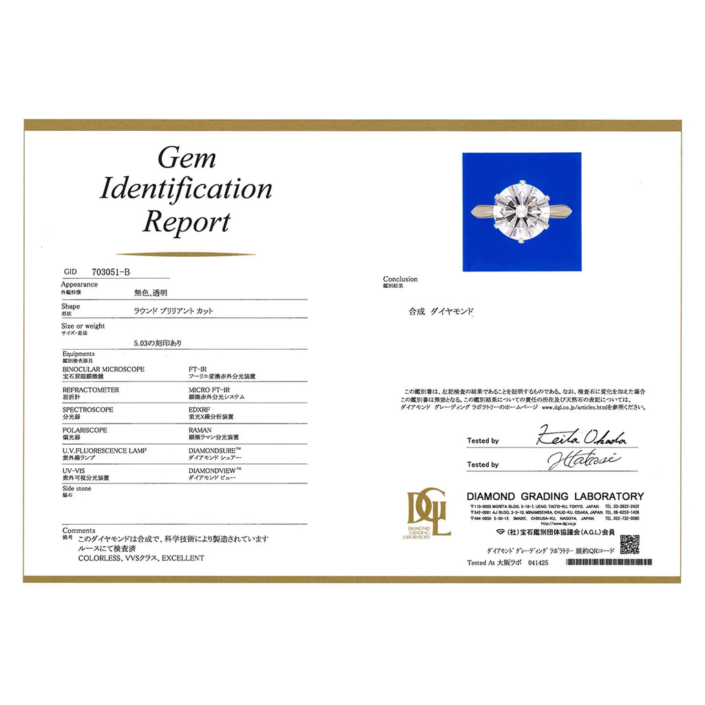 ほとんど目にすることのない、5.03ctのカラーレスダイヤモンドを堂々と配したリング。