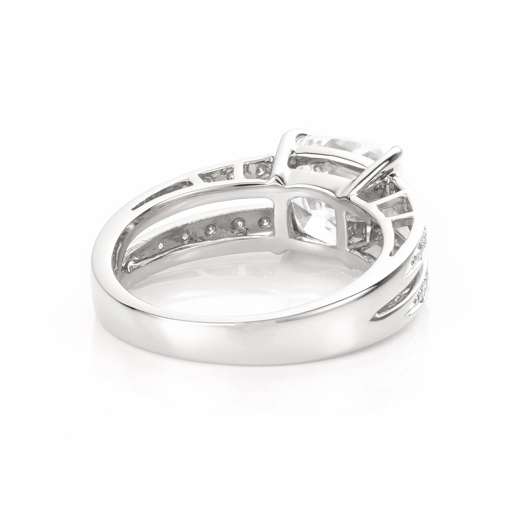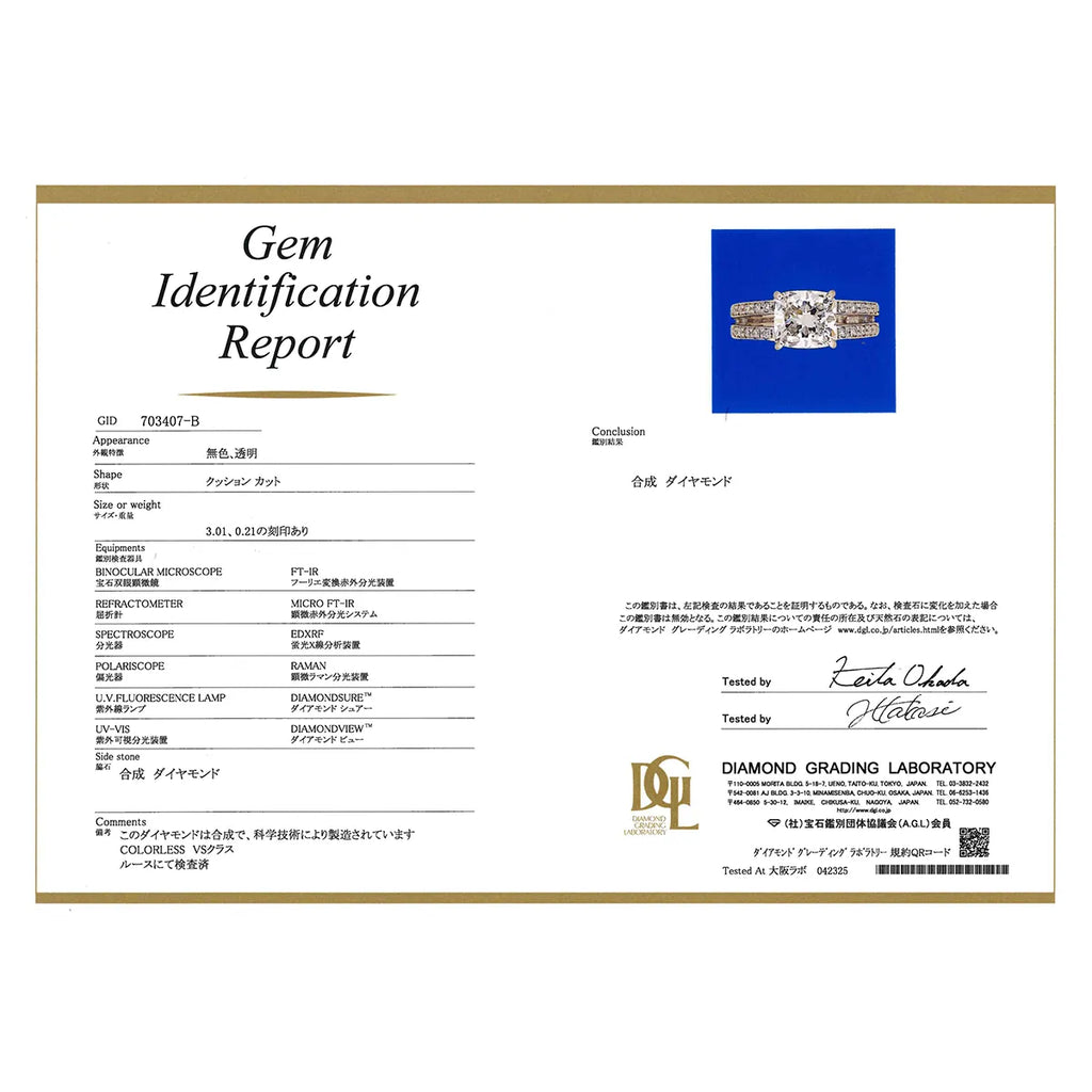 3ctのカラーレスダイヤモンドを、クッションカットで柔らかな輝きに仕上げ、横向きにセッティングしたリング。