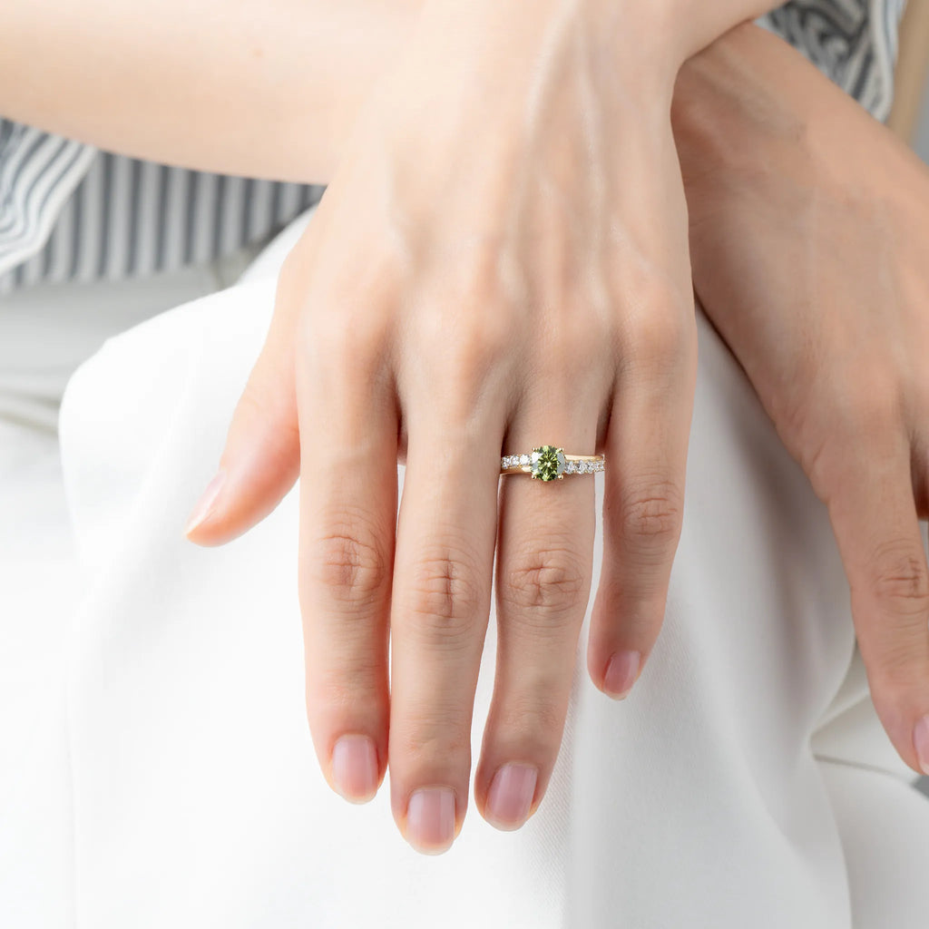 柔らかな光をまとったグリーンダイヤモンドが、穏やかな波のように輝きを広げるリング。