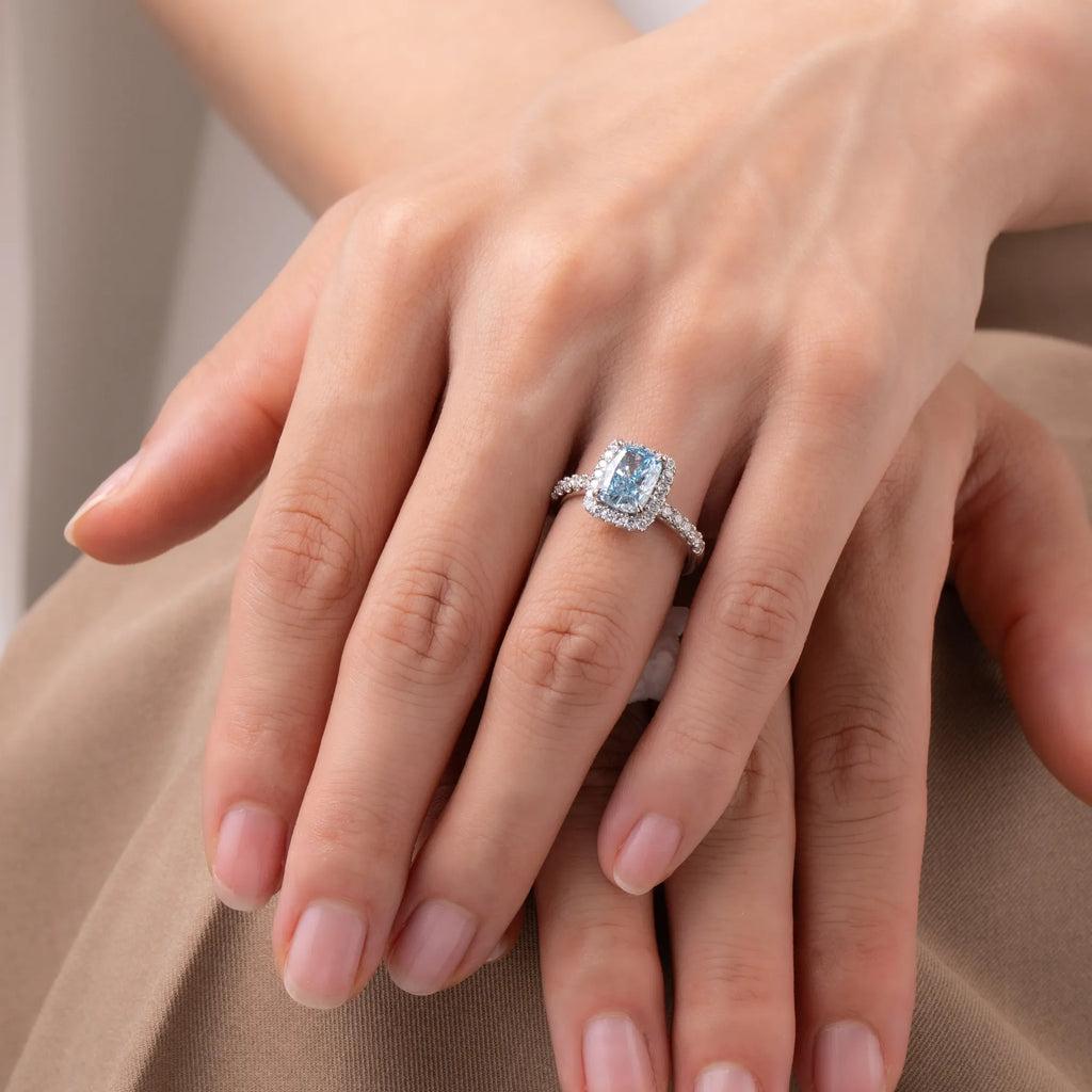 クッションカットの柔らかな輪郭と、縦にセッティングされたフォルムが指先をすらりと美しく演出。