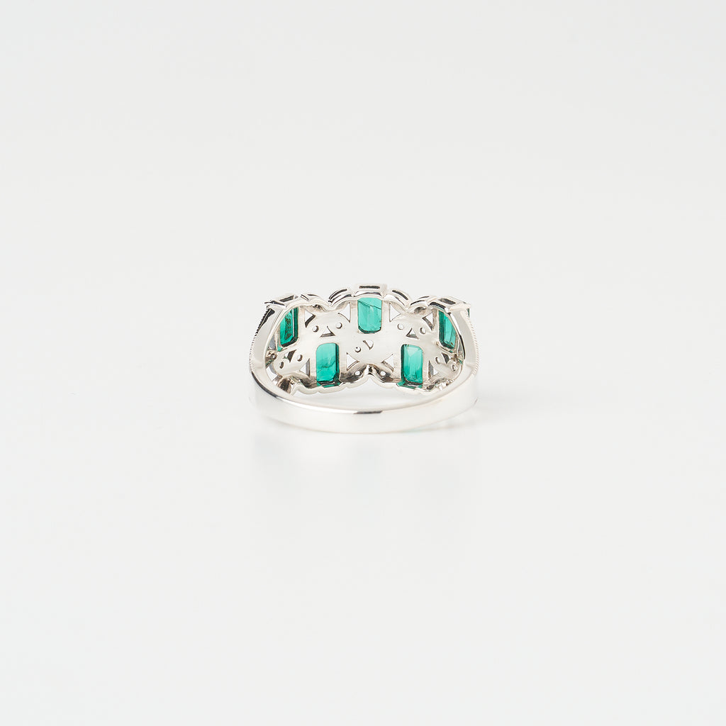 エメラルドとホワイトトパーズで自然と建築物の調和をモチーフに仕立てたリングです。