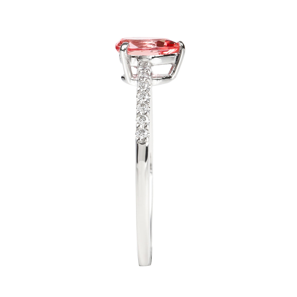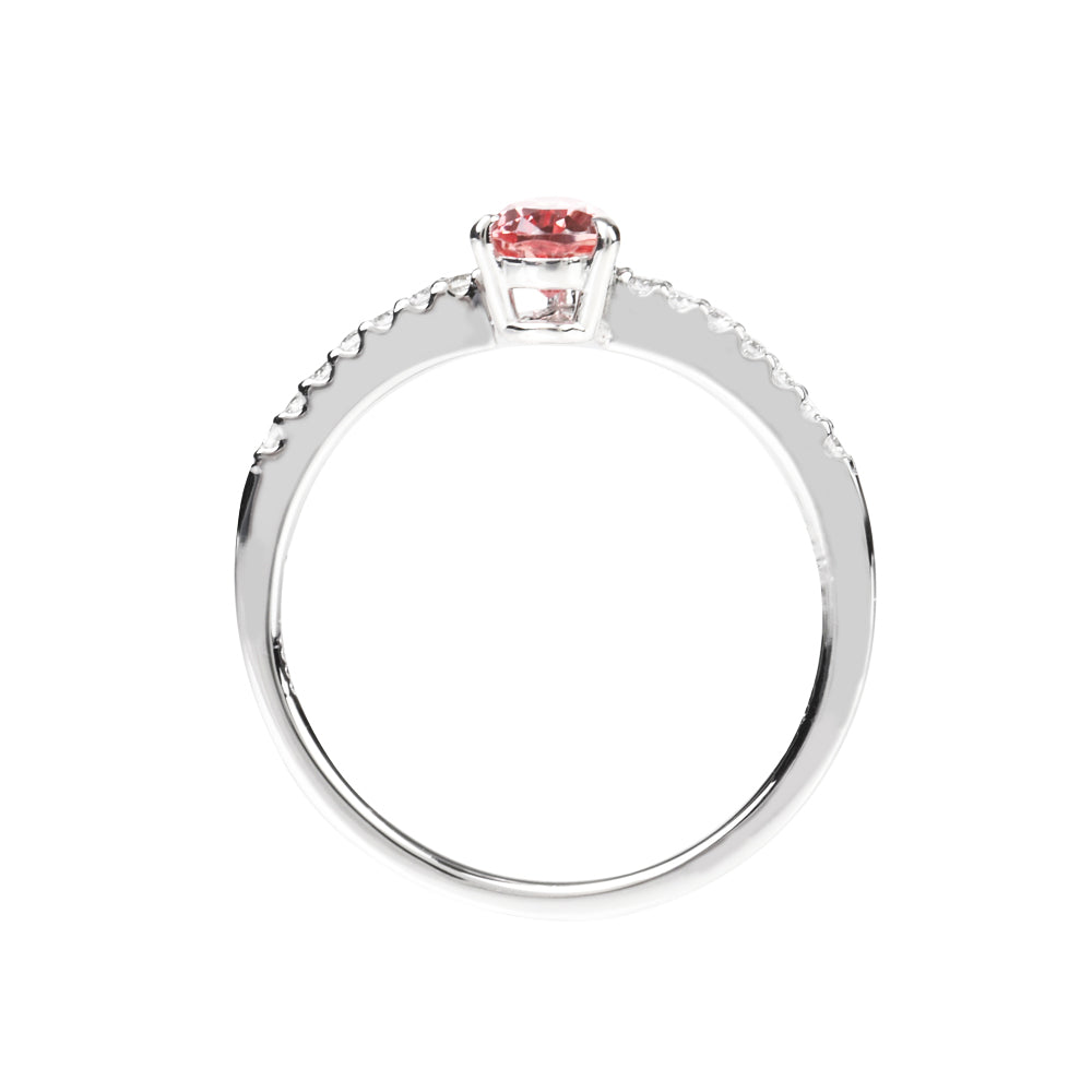 今回、クレサンベールパパラチアサファイアのペアシェイプをメインストーンに、クレサンベールシリーズでありそうでなかった可憐なデザインに仕上げました。パパラチアサファイアのオレンジがかったピンクが主役となるよう、リングアーム幅は約1mmと華奢なラインを採用し、共有爪でメレダイヤモンドをセッティングすることでレールの無いすっきりとした上品なリングに仕上がっています。