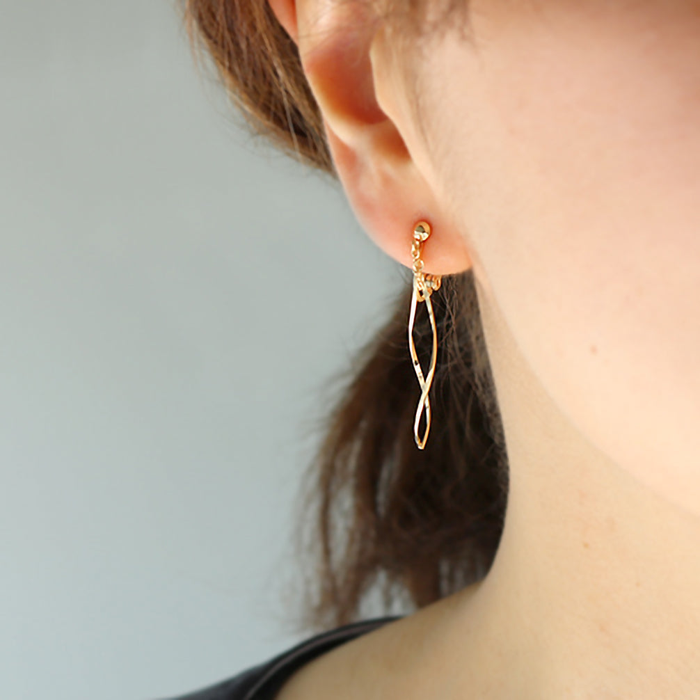 K18YGのひねったパーツがやさしく揺れるイヤリング。留め具はシリコンゴム付きで落ちにくく、バネ式ではない無段階調整のできるクリップ式なので痛くなりにくい仕様です。
