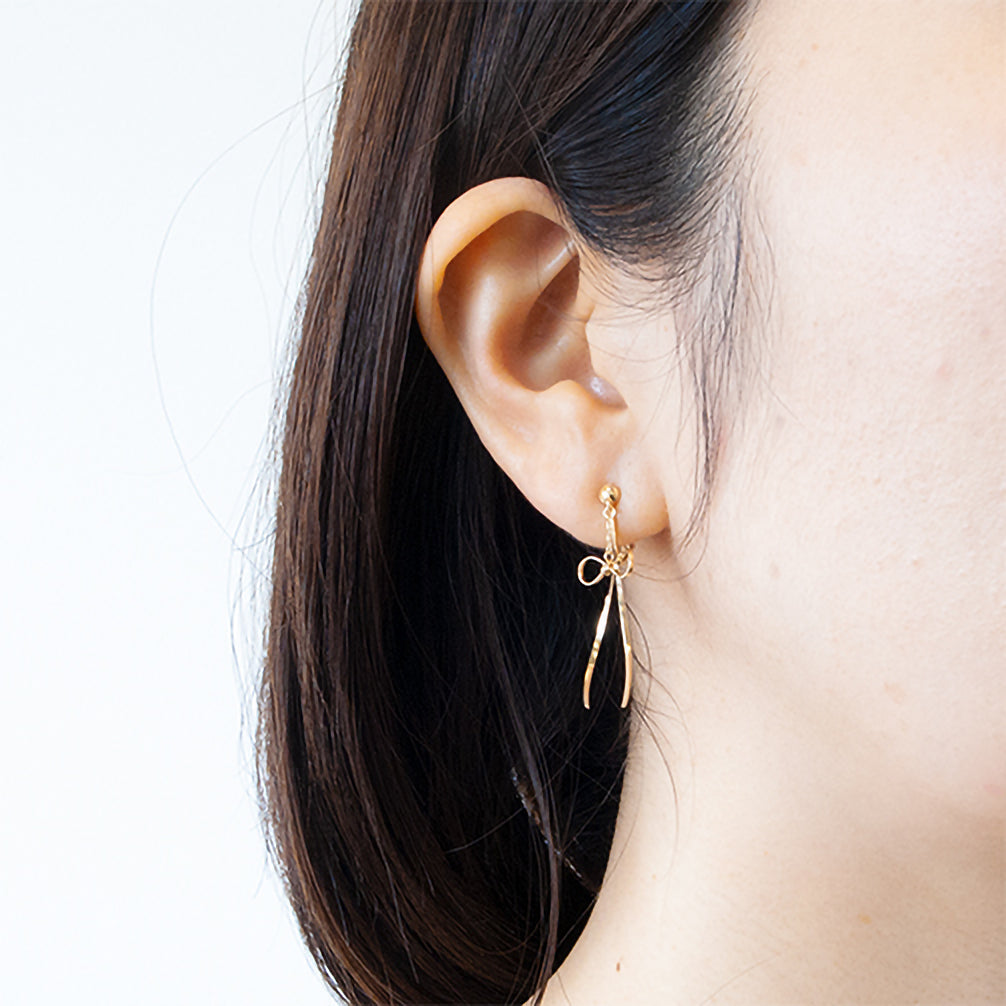 職人が手づくりした繊細なリボンを耳元に結ん結んだK18のイヤリング。装い次第でキュートにもエレガントにも。